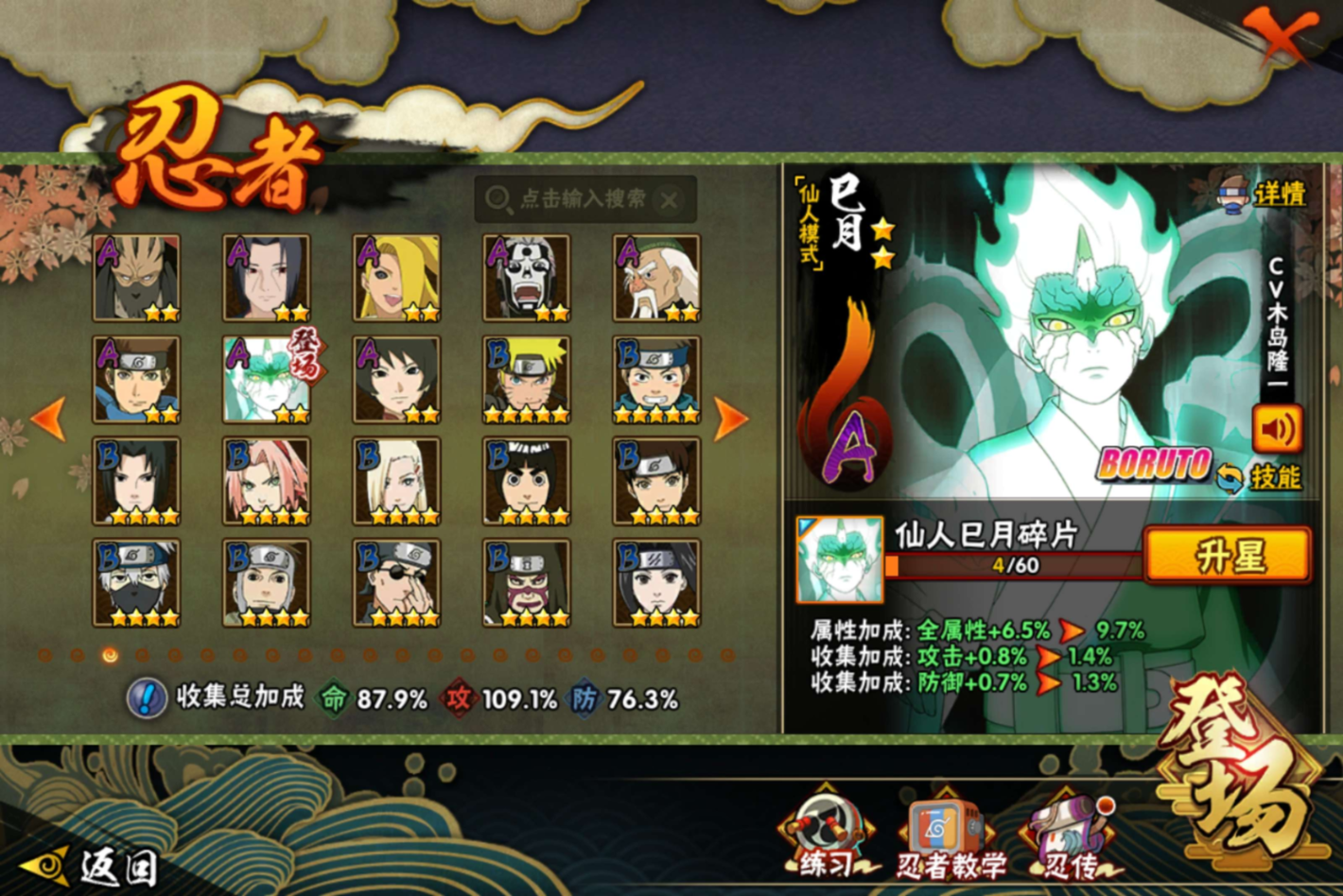 【S级忍者】自来也「传说中的三忍」(3星),漩涡鸣人「九喇嘛连结」(3星),宇智波斑「白面具」(3星),千手扉间「秽土转生」(3星),宇智波斑「秽土转生」(3星),自来也「舞之豪杰」(3星),宇智波鼬「秽土转生」(3星),宇智波鼬「须佐能乎」(3星),漩涡鸣人·宇智波佐助(3星),佩恩「天道」(3星),波风水