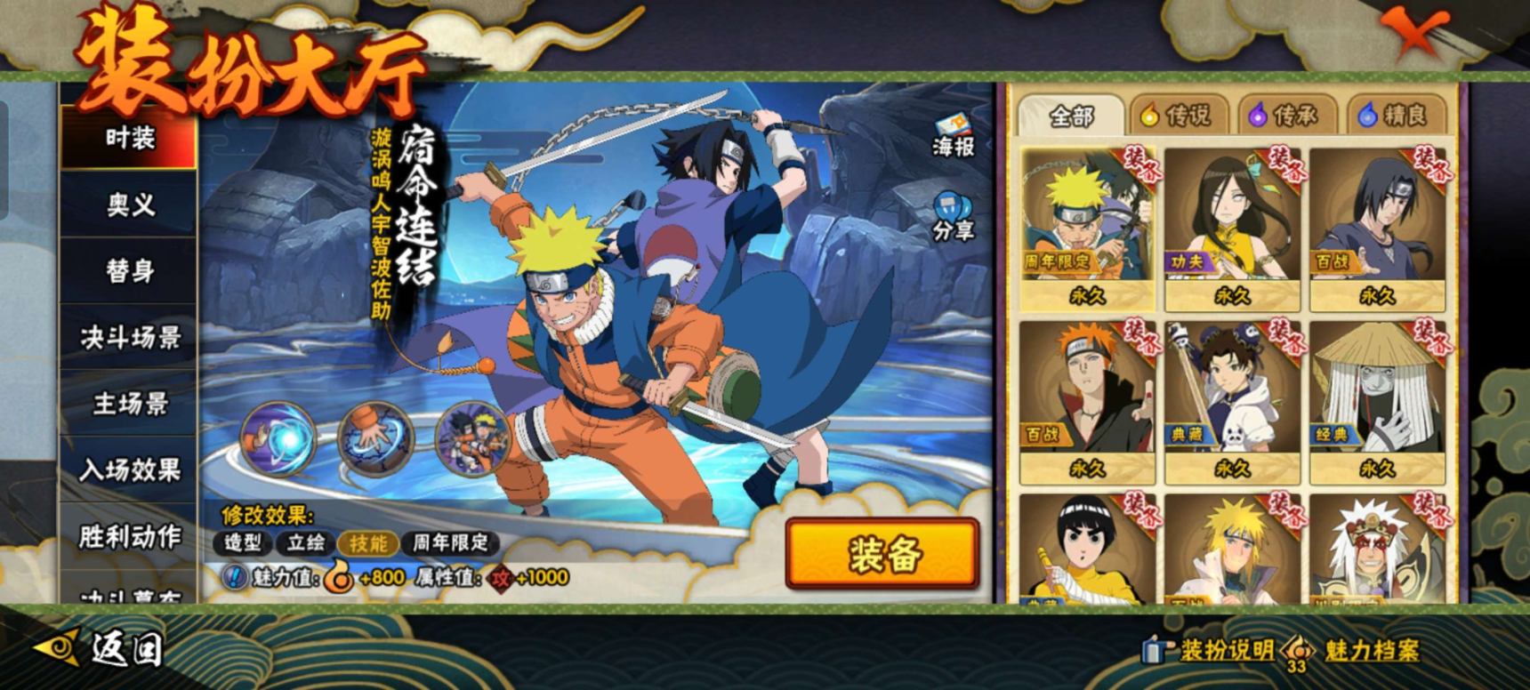 【S级忍者】宇智波佐助「永恒万花筒」(3星),漩涡鸣人「九喇嘛连结」(3星),自来也「舞之豪杰」(3星),宇智波鼬「须佐能乎」(3星),漩涡鸣人·宇智波佐助(3星),宇智波斑(3星),佩恩「天道」(3星),波风水门(3星),
