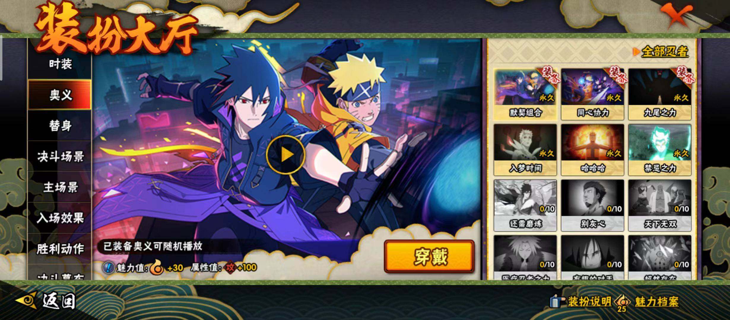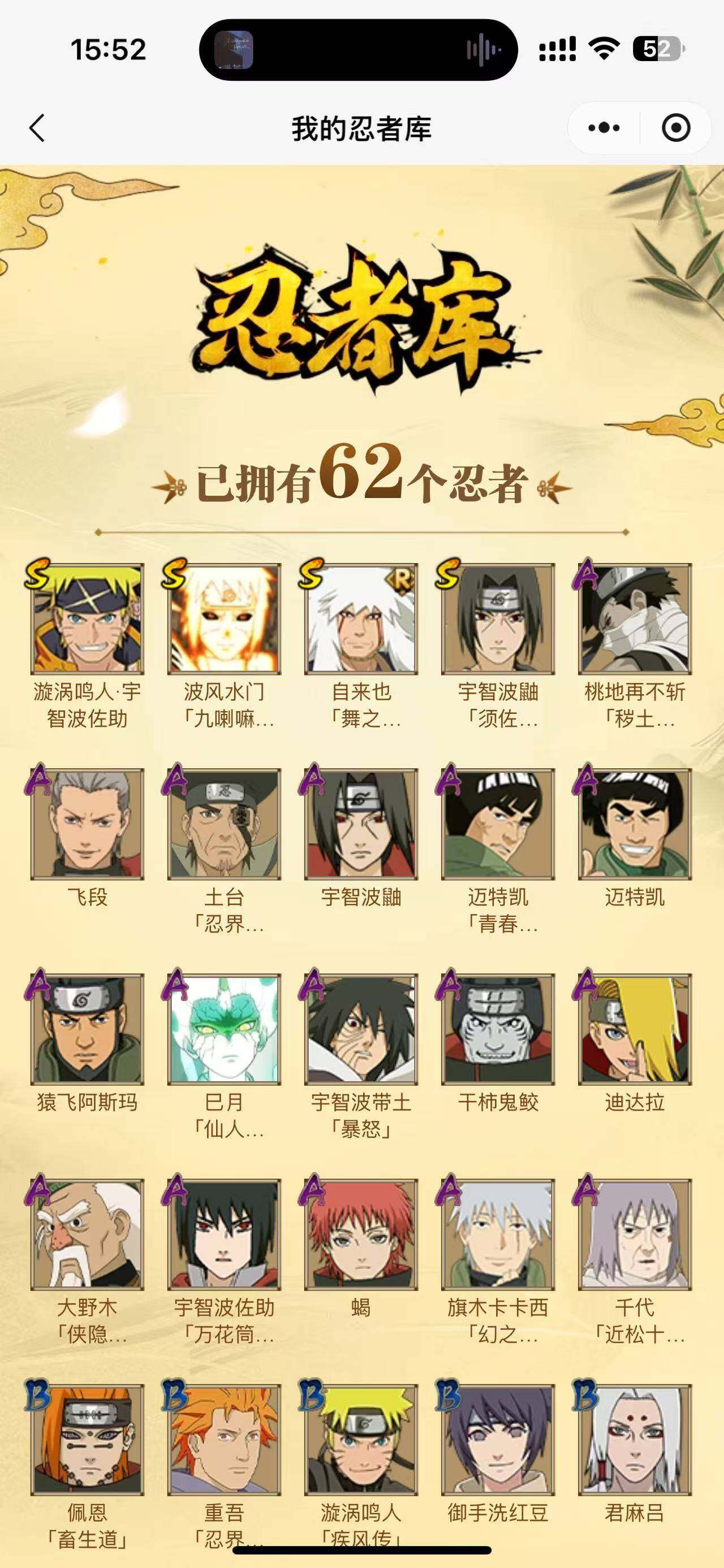 【S级忍者】:宇智波鼬「须佐能乎」(3星),自来也「舞之豪杰」(3星),波风水门「九喇嘛连结」(3星),漩涡鸣人·宇智波佐助(3星)