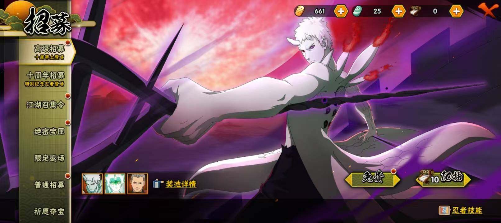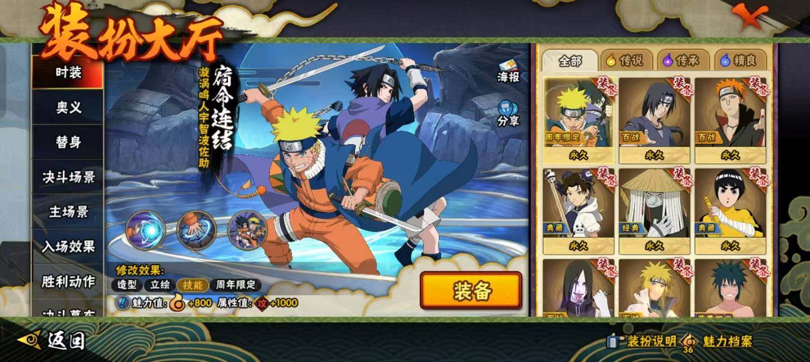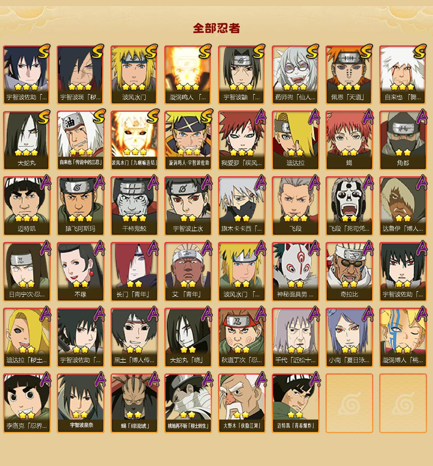 【S级忍者】:宇智波斑「秽土转生·解」(3星),宇智波鼬「须佐能乎」(3星),自来也「舞之豪杰」(3星),大蛇丸(3星),自来也「传说中的三忍」(3星),波风水门(3星),药师兜「仙人模式」(3星),漩涡鸣人「九喇嘛连结」(3星),佩恩「天道」(3星),宇智波佐助「永恒万花筒」(3星),波风水门「九喇嘛连结」(3星),漩涡鸣人·宇智波佐助(3星)