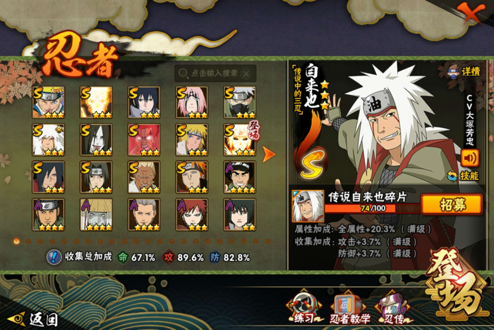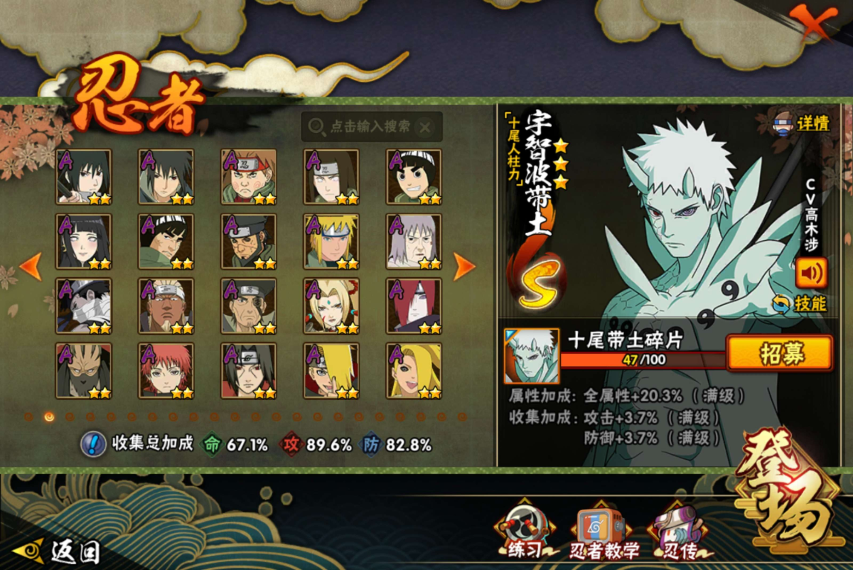 【S级忍者】迈特凯「死门」(3星),旗木卡卡西「须佐能乎」(3星),宇智波斑「秽土转生·解」(3星),宇智波佐助「永恒万花筒」(3星),艾「忍界大战」(3星),春野樱「忍界大战」(3星),漩涡鸣人「九喇嘛连结」(3星),波风水门「九喇嘛连结」(3星),自来也