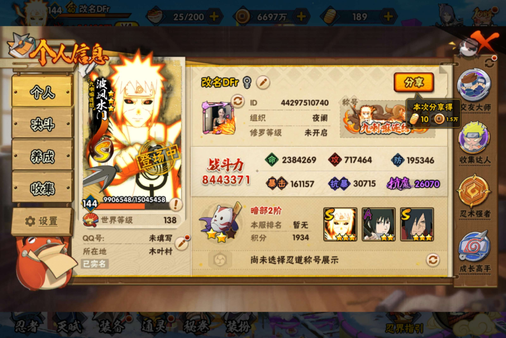 安卓QQ-可二次-近八百五十万战力-S忍者数:14- A忍