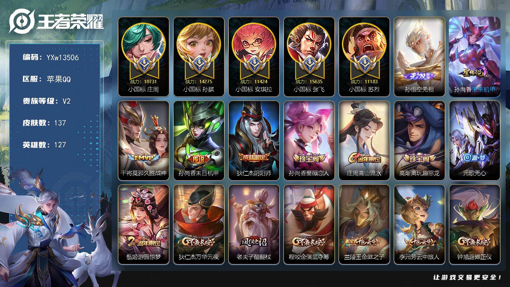 【店铺主推·小国1.5w张飞·小国1.4w孙膑·小国万战安琪拉·小国万战苏烈·小国万战庄周·金标1.1w娜可·金标万战孙尚香·金标万战刘禅·游走68段·无相·未来机甲·末日机甲·可二次】YXw13506-苹果Q-127英雄-137皮肤-18王者印记-250铭文-贵族积分0w【贵族2】【1无双·1星传说·2传说·1天幕·1按键】【因赛季更新游戏段付以上号为准!】