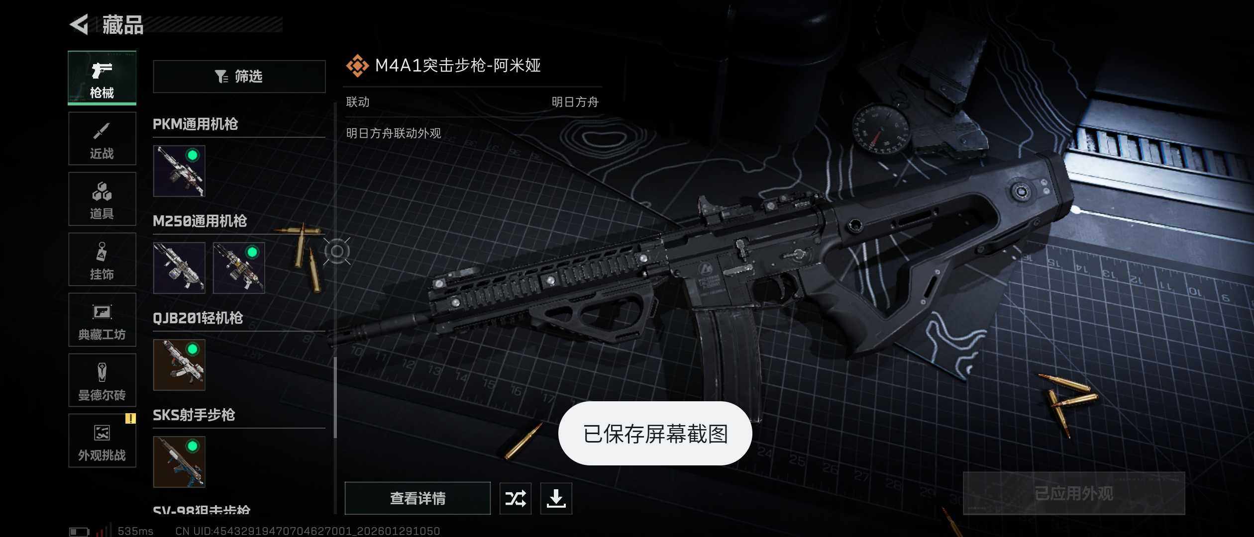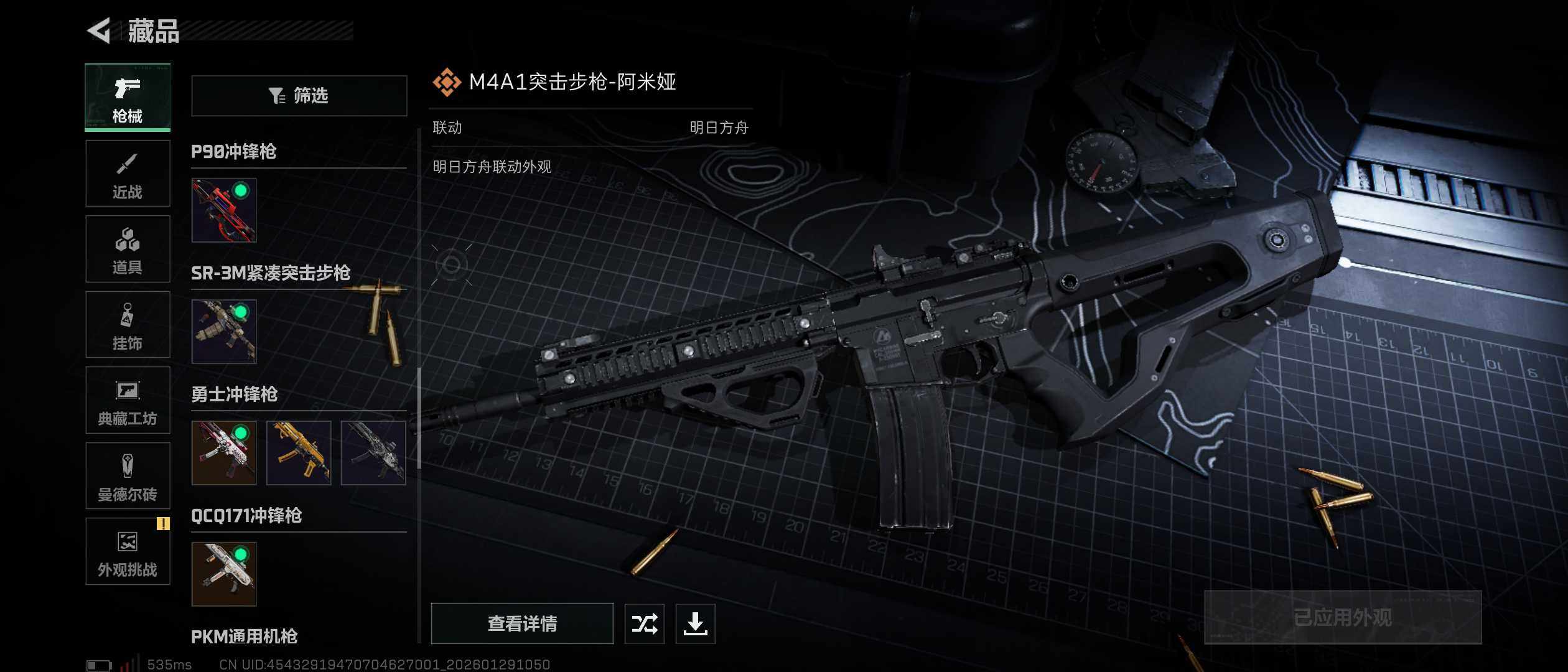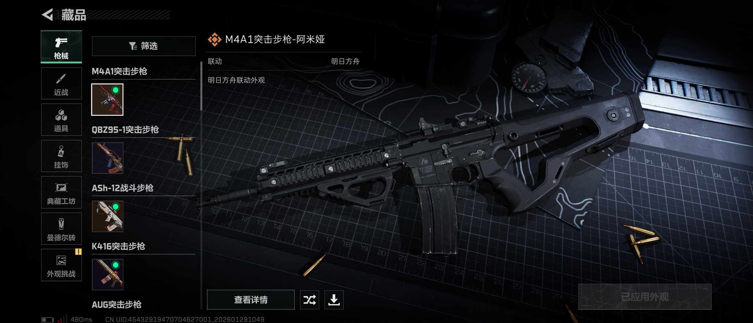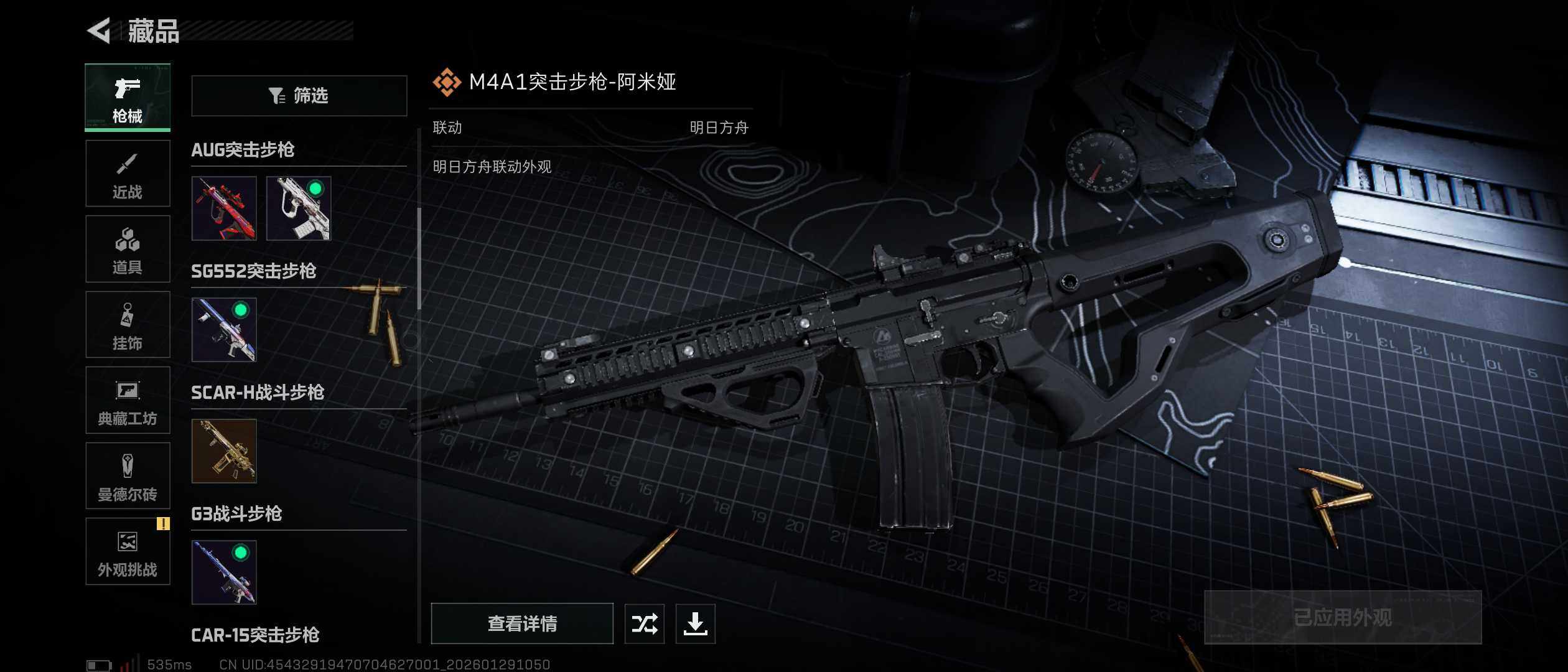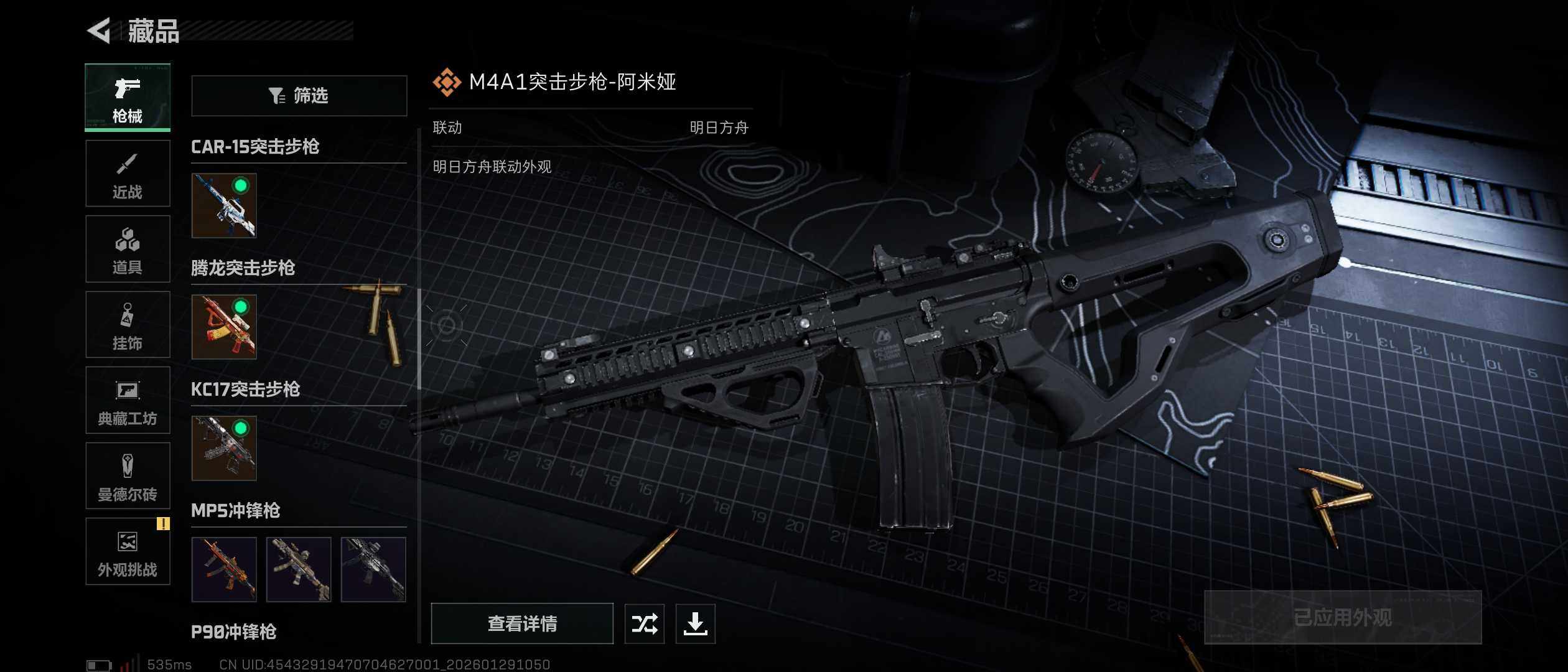 【传说外观】:M4A1突击步枪-阿米娅,ASh-12战斗步枪-鹅鸭杀,SCAR-H战斗步枪-启航,CAR-15突击步枪-阿米娅,腾龙突击步枪-捞点薯条,KC17突击步枪-电锯惊魂,勇士冲锋枪-能天使-午夜邮差,QCQ171冲锋枪-鹅鸭杀,QJB201