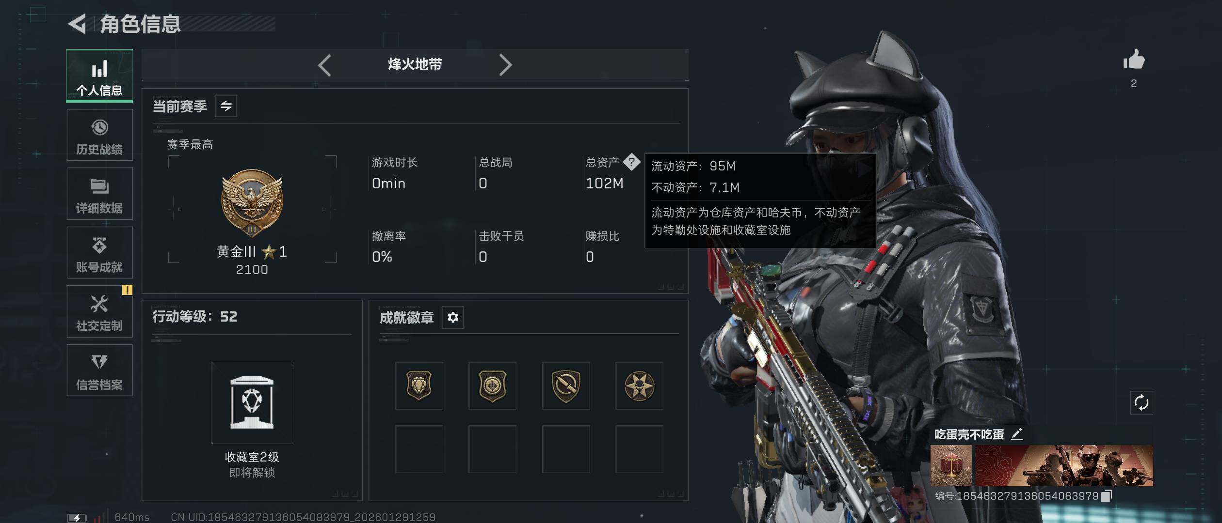 102m总资产-1635k哈伏币-52烽火等级-黄金-1战场等级-无军衔