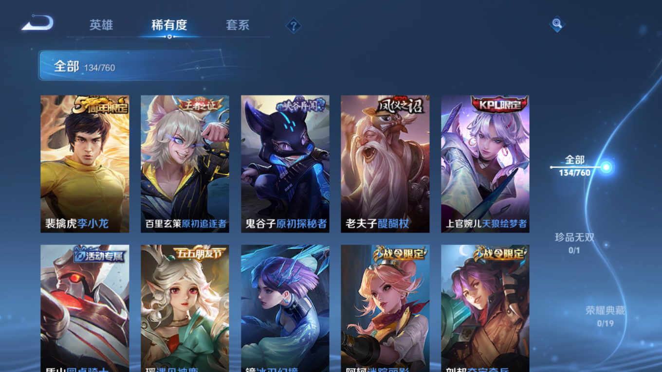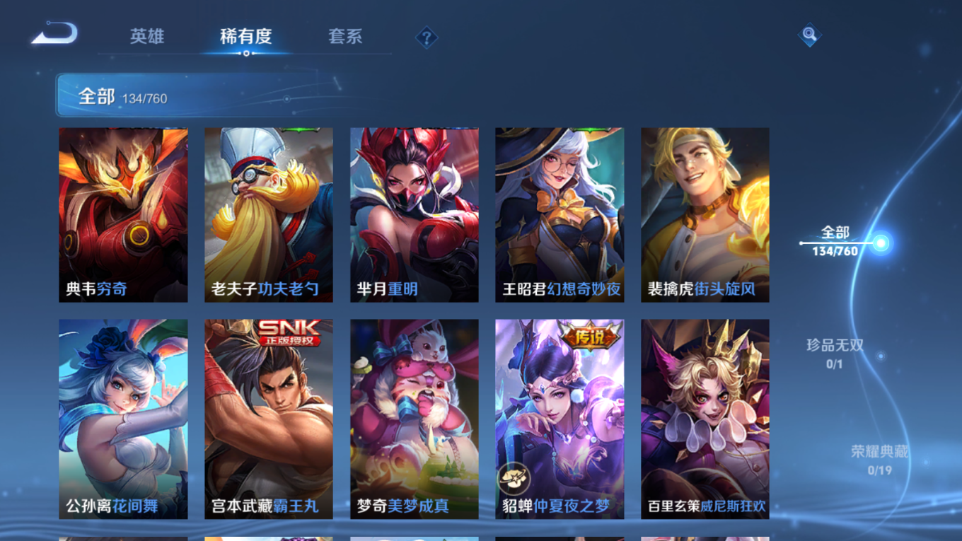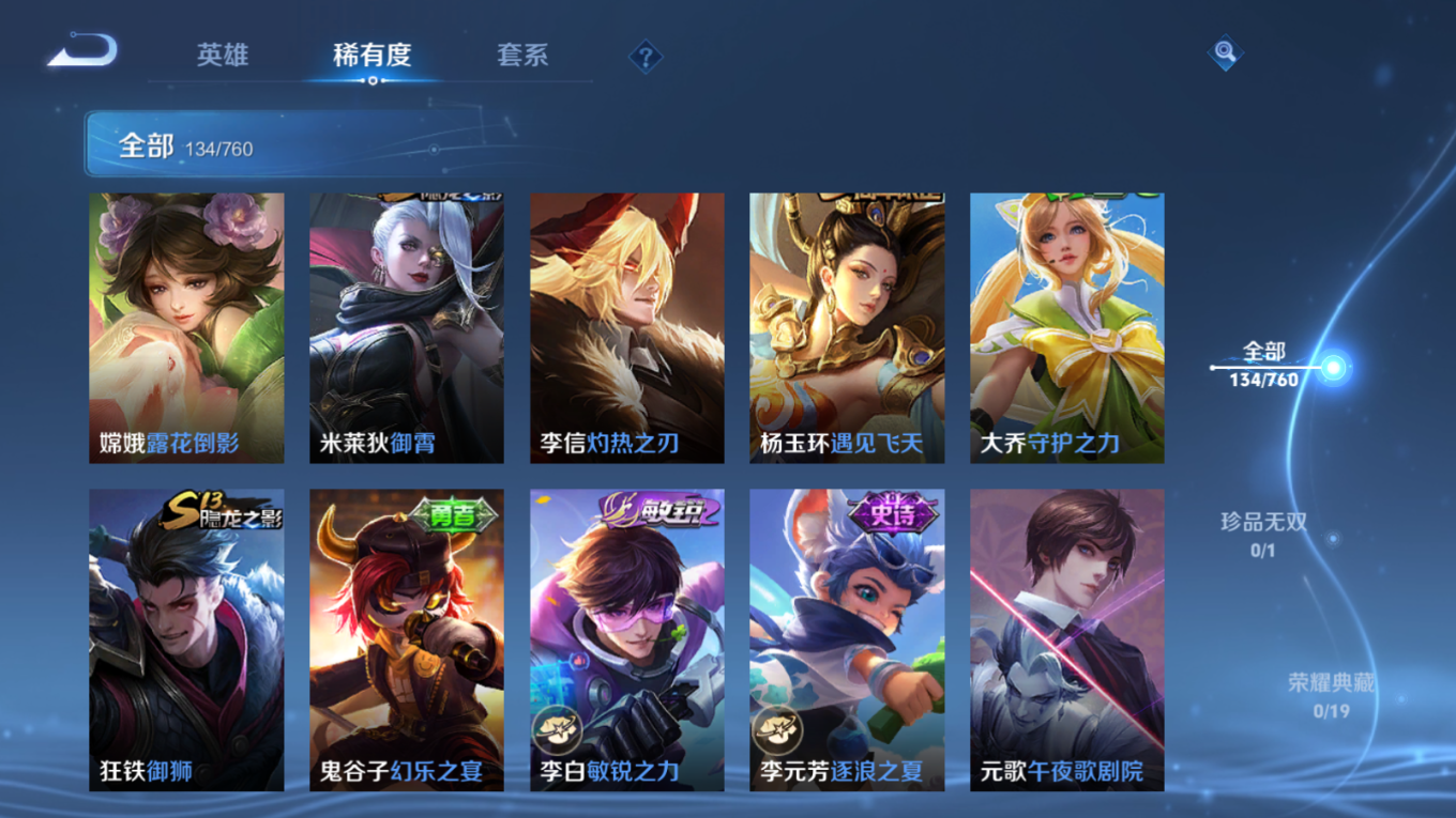 116英雄-134皮肤-1传说 【传说】 仲夏夜之梦 【热门】飞衡 天狼绘梦者 霸王别姬女 一生所爱 冰霜恋舞曲 神迹守卫钟馗 狮舞东方 星空之诺 银河之约 原初追逐者 梁祝 云间偶戏 诗语江南 遇见神鹿 原初探秘者 李小龙 猫狗日记女 蔷薇恋人 逐浪之夏 魅语 紫霞仙子 圣诞恋歌 街头霸王 缤纷独角兽 花好人间 重明 穷奇 御狮 御霄 御旌 御銮 朔风刀 混沌棋 疑决卦 醍醐杖 万华元夜 演武夺筹 驱傩正仪 沙漠行僧 女仆咖啡 金庭之子 霸王丸 大漠名商 敏锐之力 皇家上将 魅力维加斯 水果甜