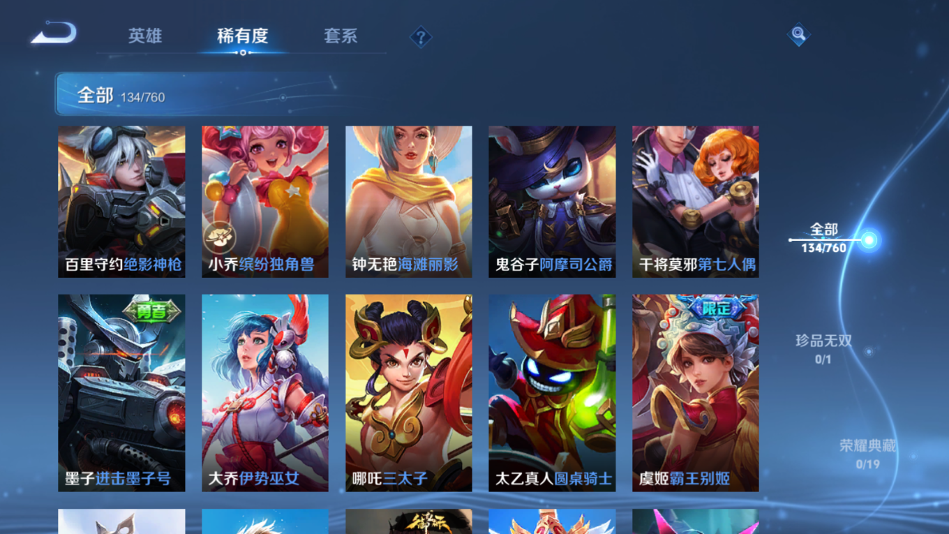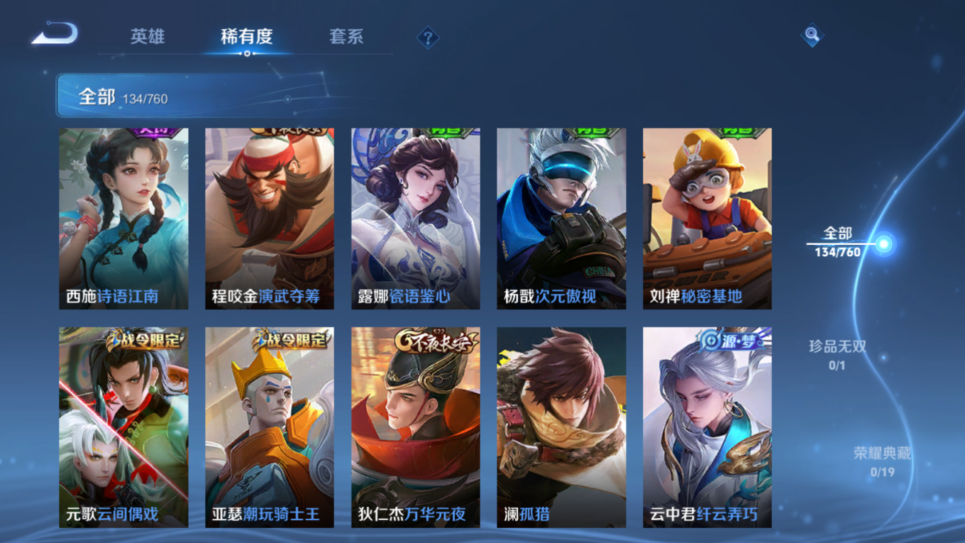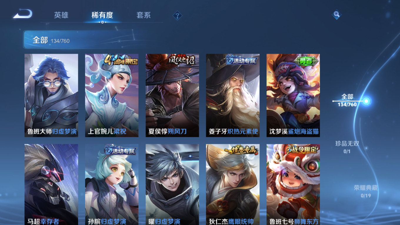 116英雄-134皮肤-1传说 【传说】 仲夏夜之梦 【热门】飞衡 天狼绘梦者 霸王别姬女 一生所爱 冰霜恋舞曲 神迹守卫钟馗 狮舞东方 星空之诺 银河之约 原初追逐者 梁祝 云间偶戏 诗语江南 遇见神鹿 原初探秘者 李小龙 猫狗日记女 蔷薇恋人 逐浪之夏 魅语 紫霞仙子 圣诞恋歌 街头霸王 缤纷独角兽 花好人间 重明 穷奇 御狮 御霄 御旌 御銮 朔风刀 混沌棋 疑决卦 醍醐杖 万华元夜 演武夺筹 驱傩正仪 沙漠行僧 女仆咖啡 金庭之子 霸王丸 大漠名商 敏锐之力 皇家上将 魅力维加斯 水果甜