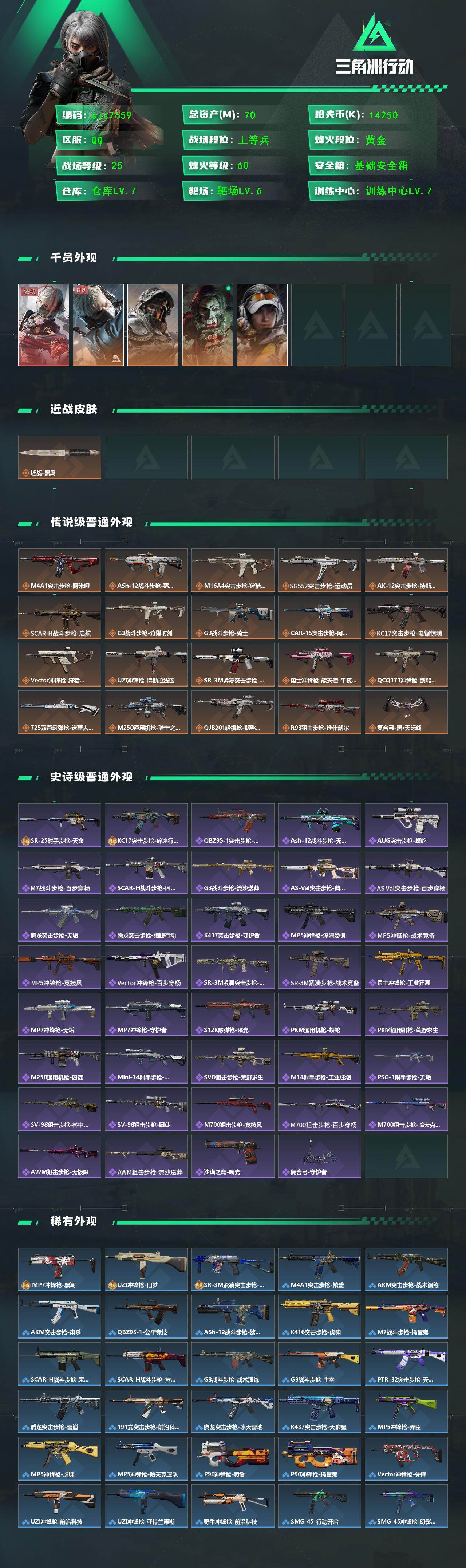 【sjs7659】总资产70m 维什戴尔 训练中心7 靶场6 烽火地带段位: 黄金 全面战场段位: 上等兵 总资产: 70000000 哈夫币: 14250000 sjs7659 干员外观: 蜂医-送葬人·无题密令(S5),深蓝-不破誓约(S6),骇爪-维什戴尔,红狼-电锯惊魂,露娜-金牌射手(S7) 传说武器皮肤: 725双管霰弹枪-送葬人-无题密令,M4A1突击步枪-阿米娅,CAR-15突击步枪-阿米娅,复合弓-黑-天际线,Vector冲锋枪-狩猎时刻,G3战斗步枪-狩猎时刻,M16A4突