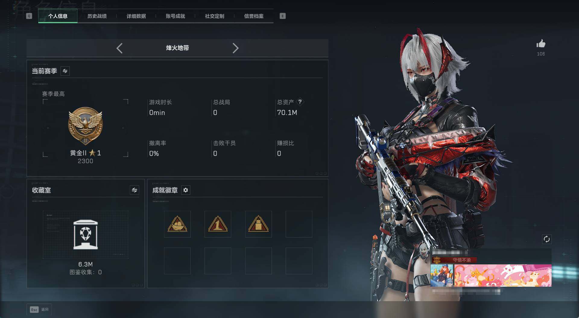 总资产70m 维什戴尔 训练中心7 靶场6 烽火地带段位: 黄金 全面战场段位: 上等兵 总资产: 70000000 哈夫币: 14250000
