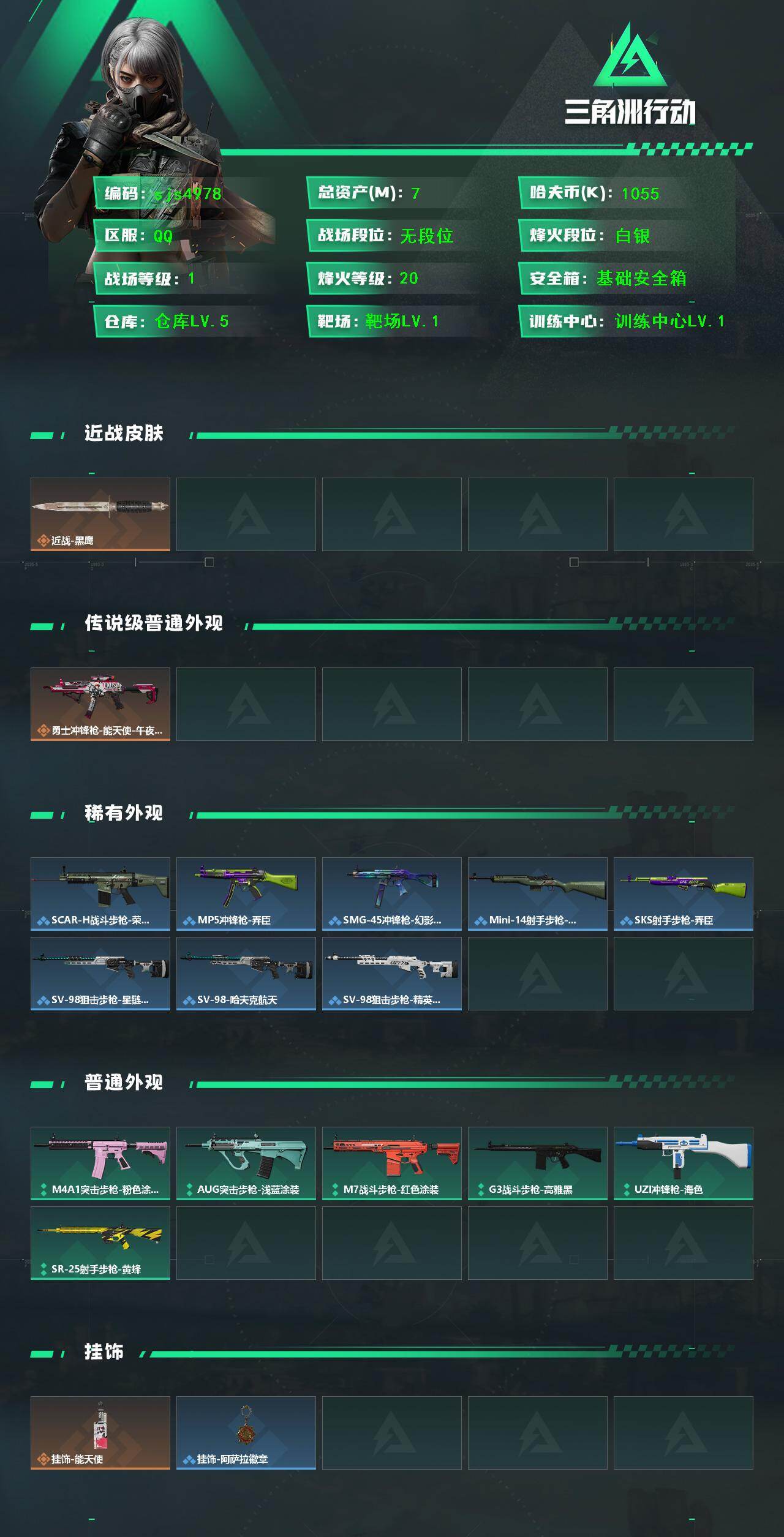 【sjs4978】精品小号急出 烽火地带段位: 白银 全面战场段位: 无段位 总资产: 7000000 哈夫币: 1055000 sjs4978 传说武器皮肤: 勇士冲锋枪-能天使-午夜邮差 亮点: 7m总资产-1055k哈伏币-20烽火等级-白银-1战场等级-无军衔【近战皮肤】:近战-黑鹰【传说外观】:勇士冲锋枪-能天使-午夜邮差【稀有外观】:SCAR-H战斗步枪-荣耀列队,MP5冲锋枪-弄臣,SMG-45冲锋枪-幻影结构,Mini-14射手步枪-荣耀列队,SKS射手步枪-弄臣,SV-98狙击
