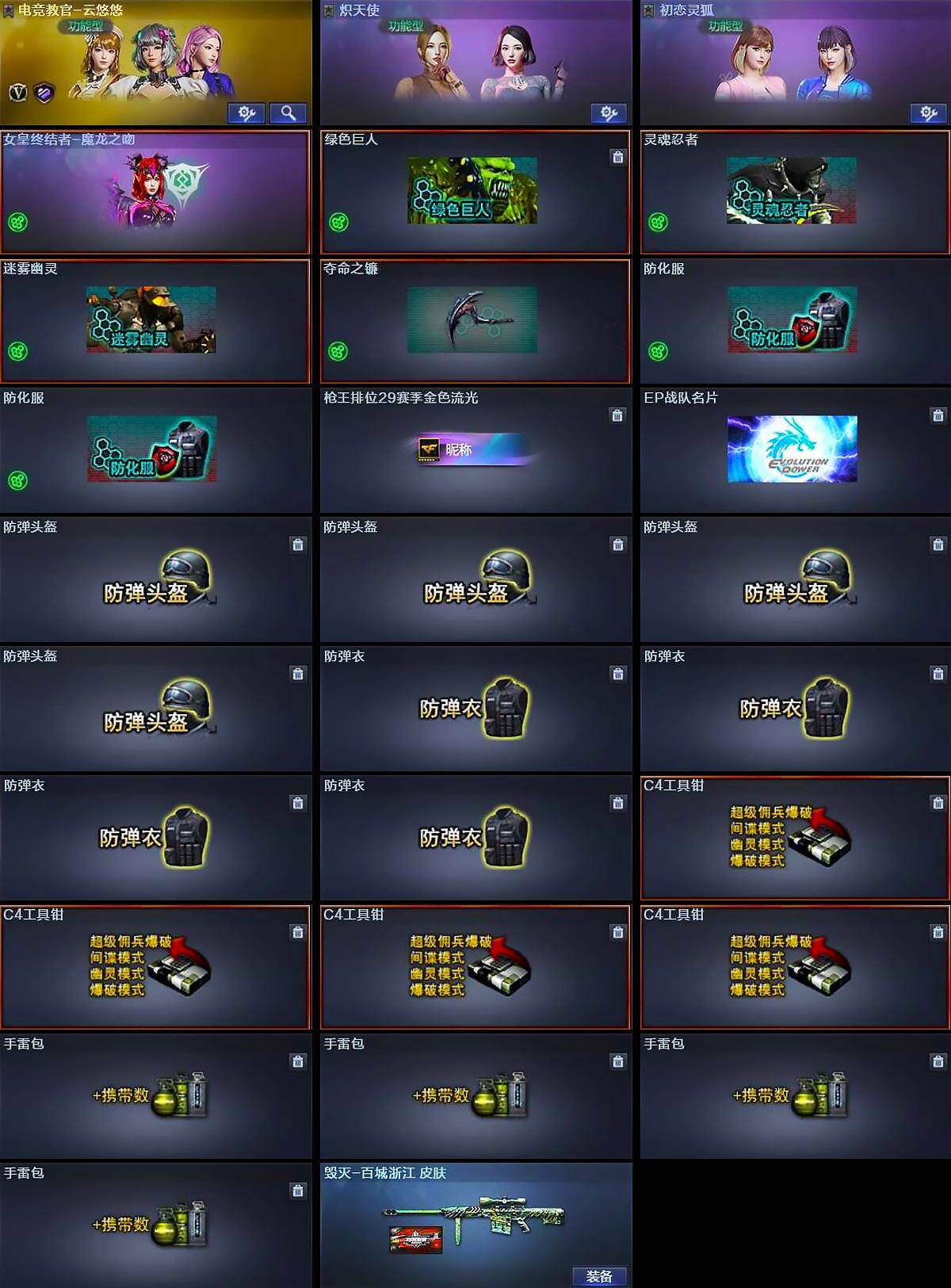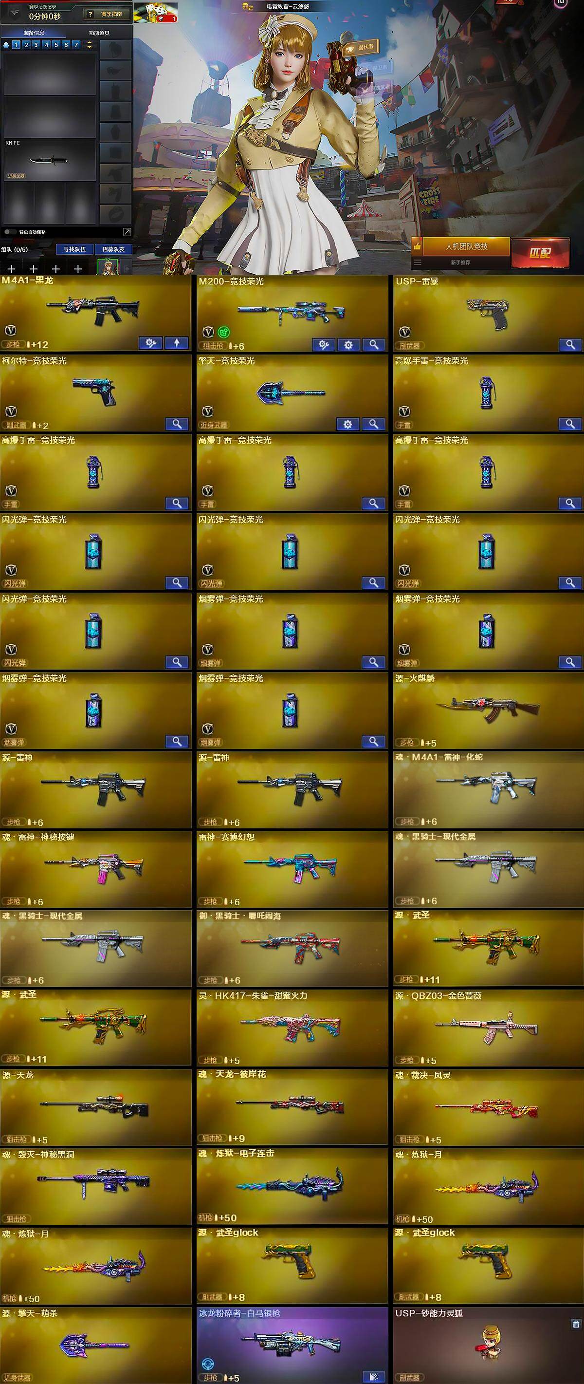 【英雄级武器】:M4A1-黑龙,QBZ03-独角-III,M200-竞技荣光,USP-雷暴,柯尔特-竞技荣光,擎天-竞技荣光,高爆手雷-竞技荣光*4,闪光弹-竞技荣光*4,烟雾弹-竞技荣光*4