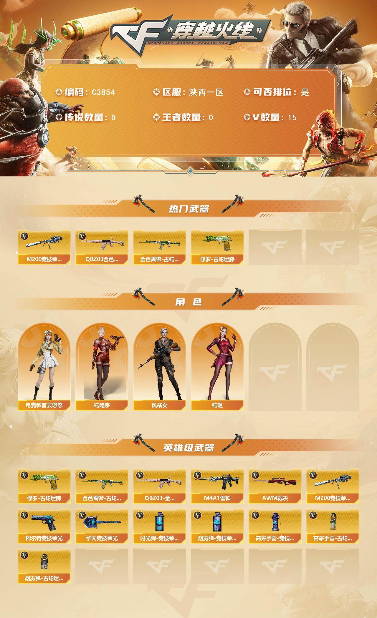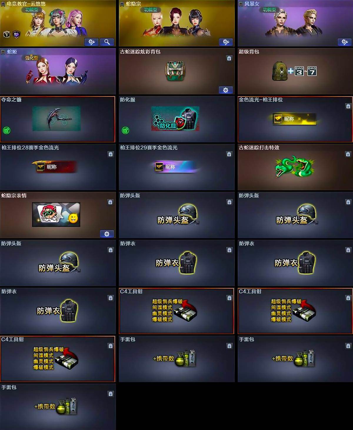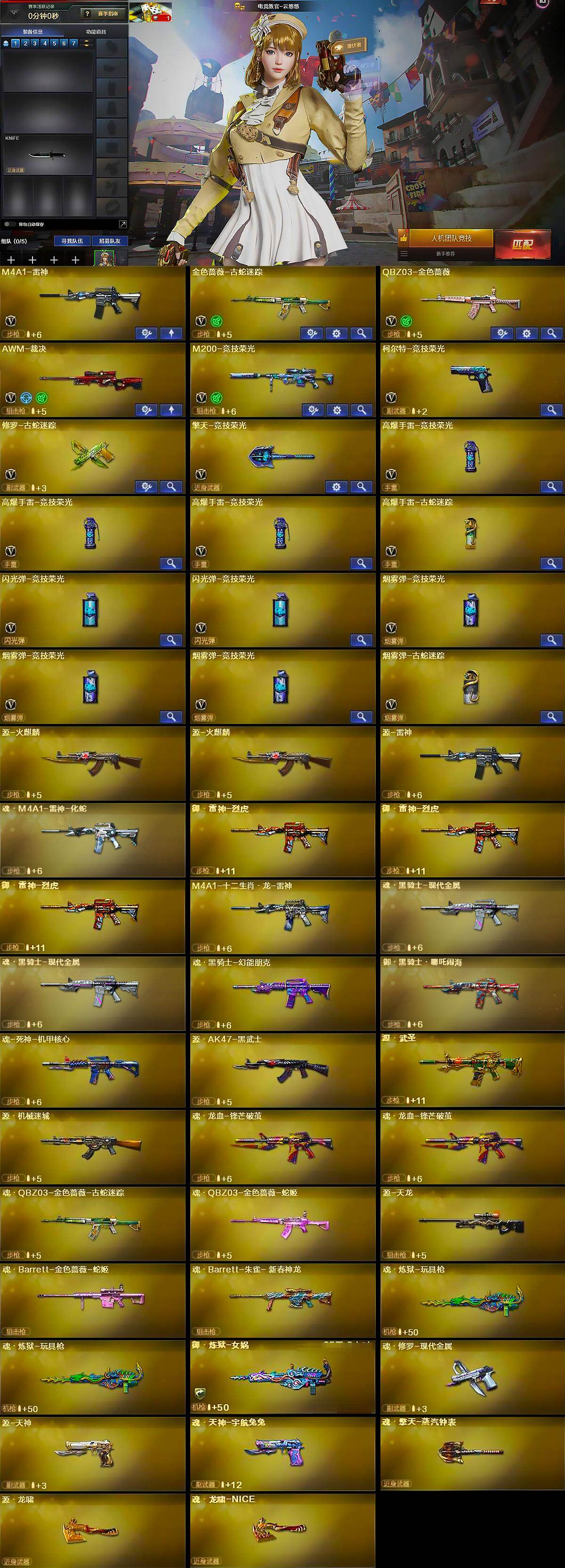 【英雄级武器】:M4A1-雷神,金色蔷薇-古蛇迷踪,QBZ03-金色蔷薇,AWM-裁决,M200-竞技荣光,柯尔特-竞技荣光,修罗-古蛇迷踪,擎天-竞技荣光,高爆手雷-竞技荣光*3,高爆手雷-古蛇迷踪,闪光弹-竞技荣光*2,烟雾弹-竞技荣光*3,烟雾弹-古蛇迷踪