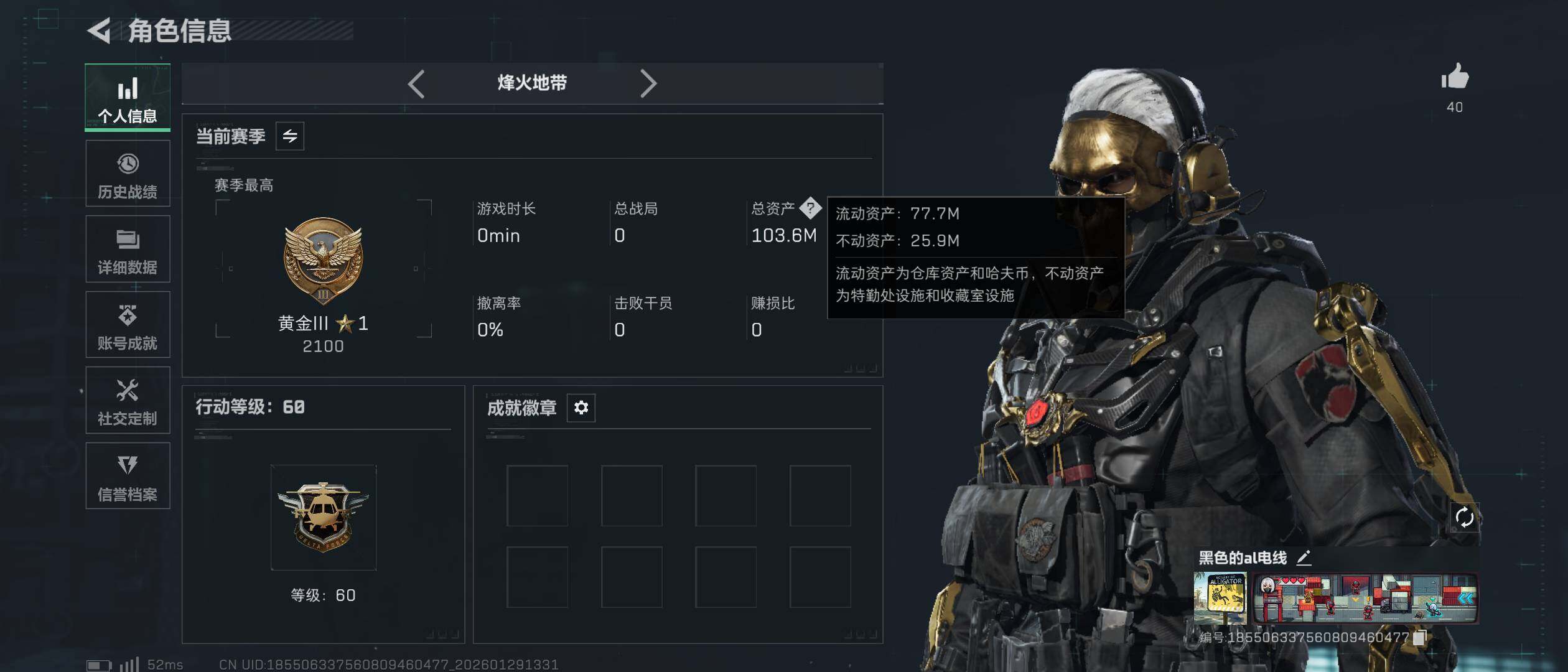 103m总资产-26k哈伏币-60烽火等级-黄金-50战场等级-军士长【干员