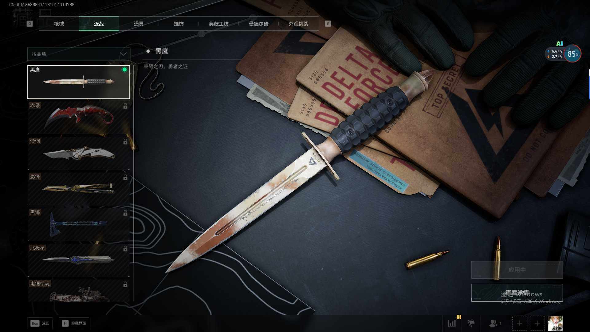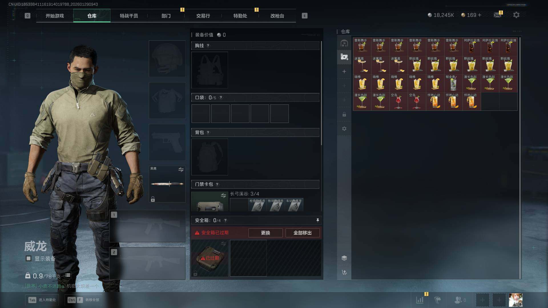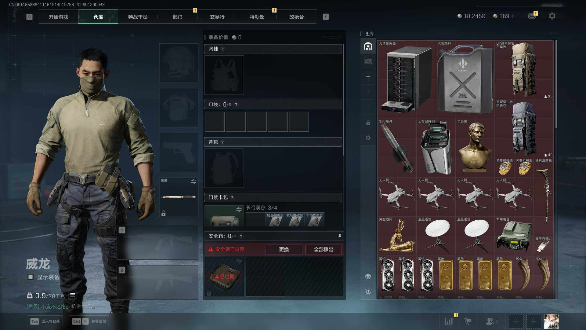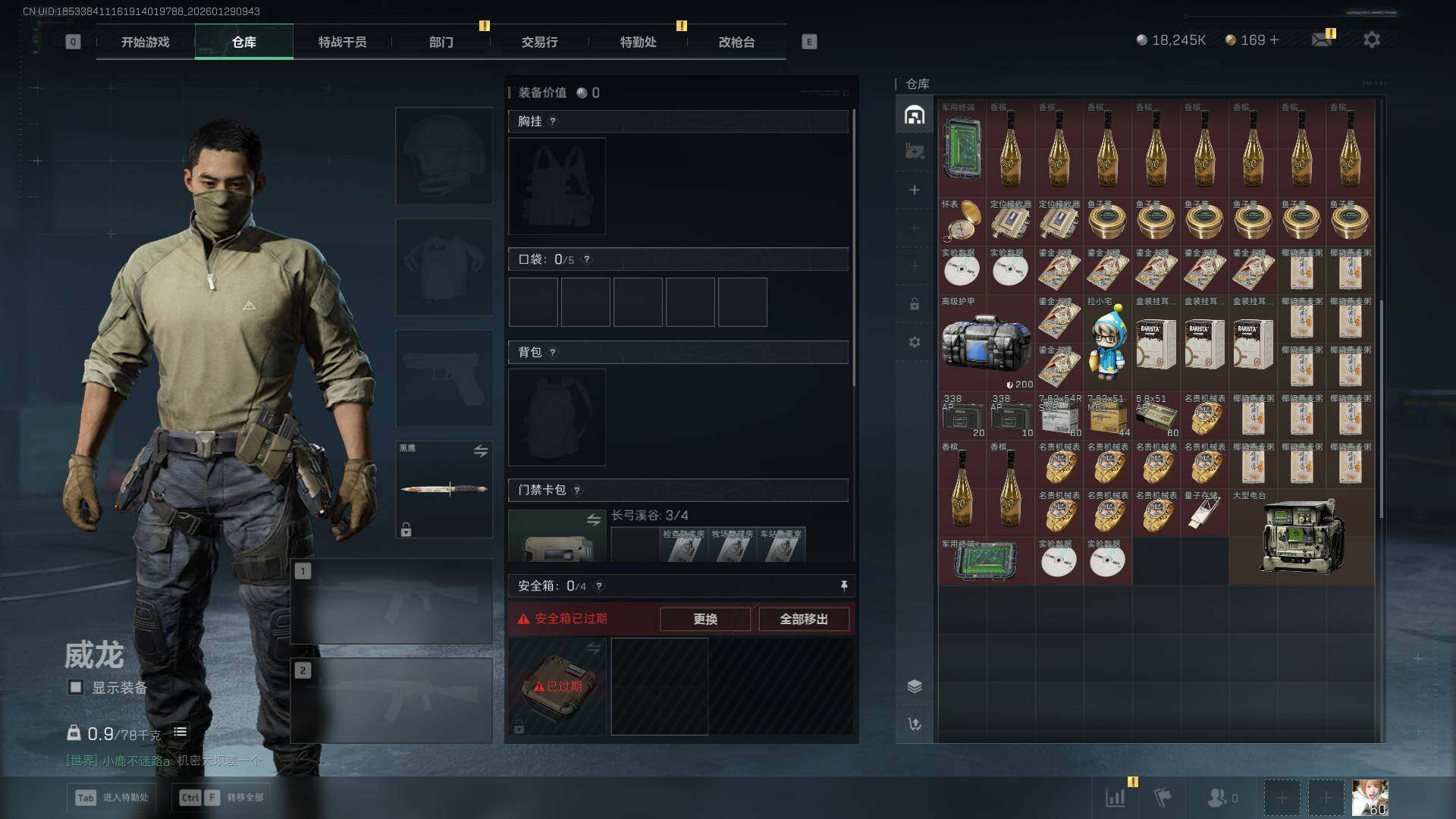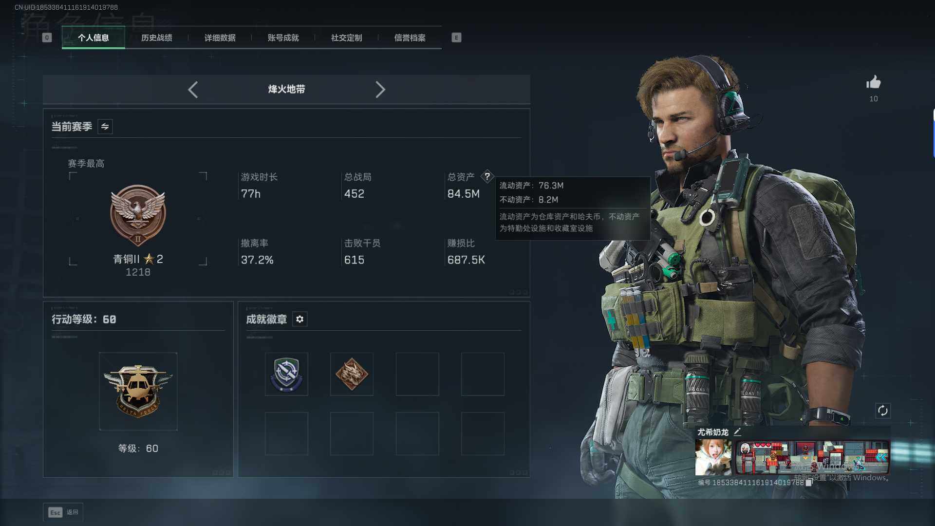 总资产(M):84M/哈夫币(K):18245K/传说枪皮数:1/全面战场等级:23_段位:列兵/烽火地带等级:60_段位:青铜/