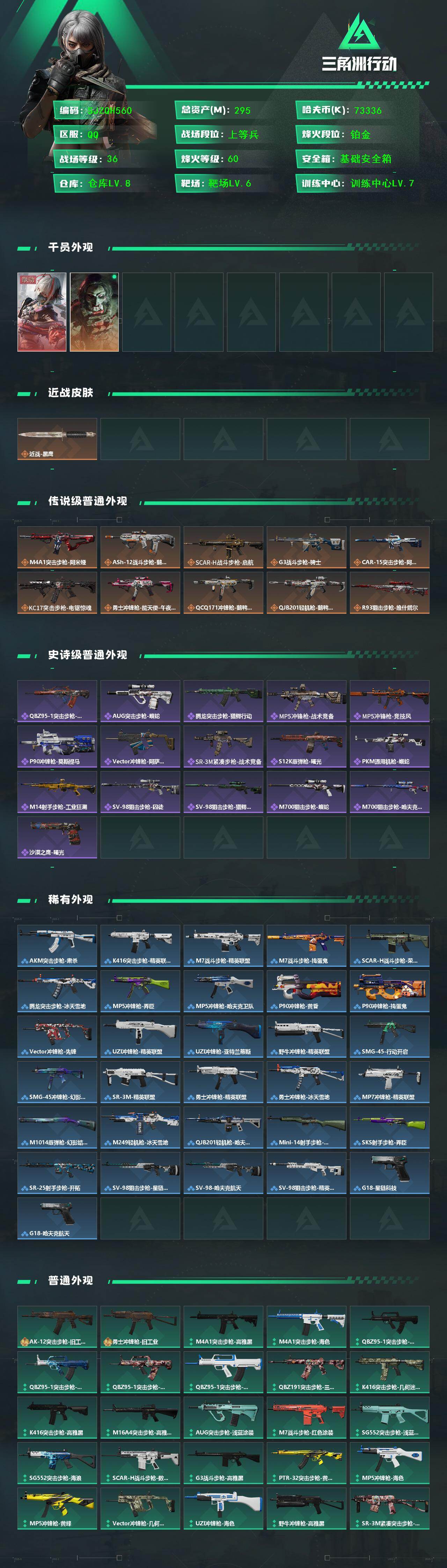 总资产(M):295M/哈夫币(K):73336K/传说枪皮数:10/全面战场等级:36_段位:上等兵/烽火地带等级:60_段位:铂金/