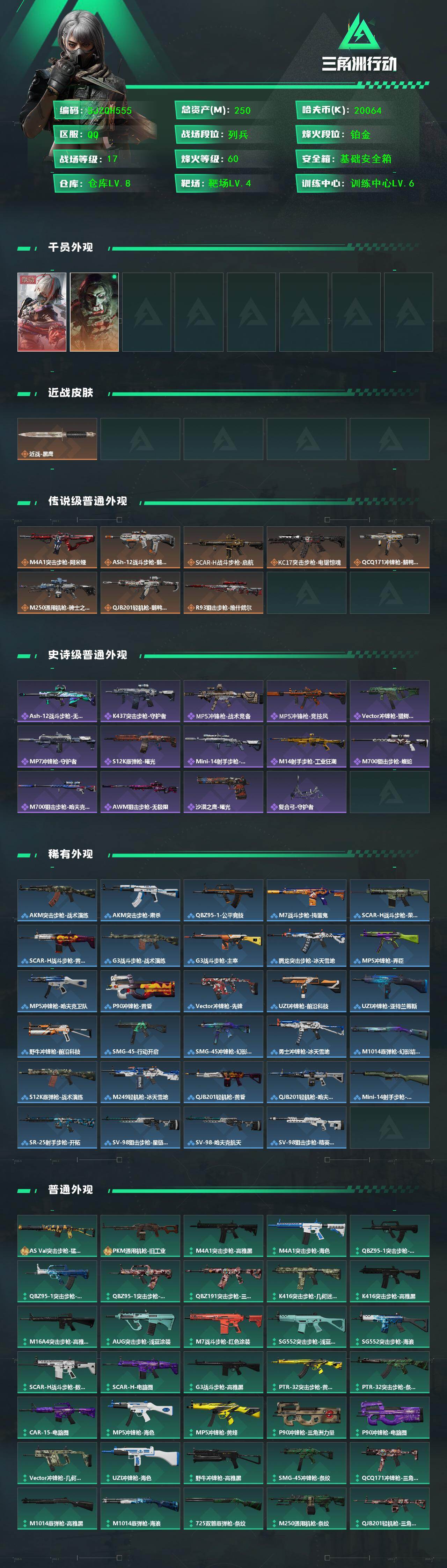 总资产(M):250M/哈夫币(K):20064K/传说枪皮数:8/全面战场等级:17_段位:列兵/烽火地带等级:60_段位:铂金