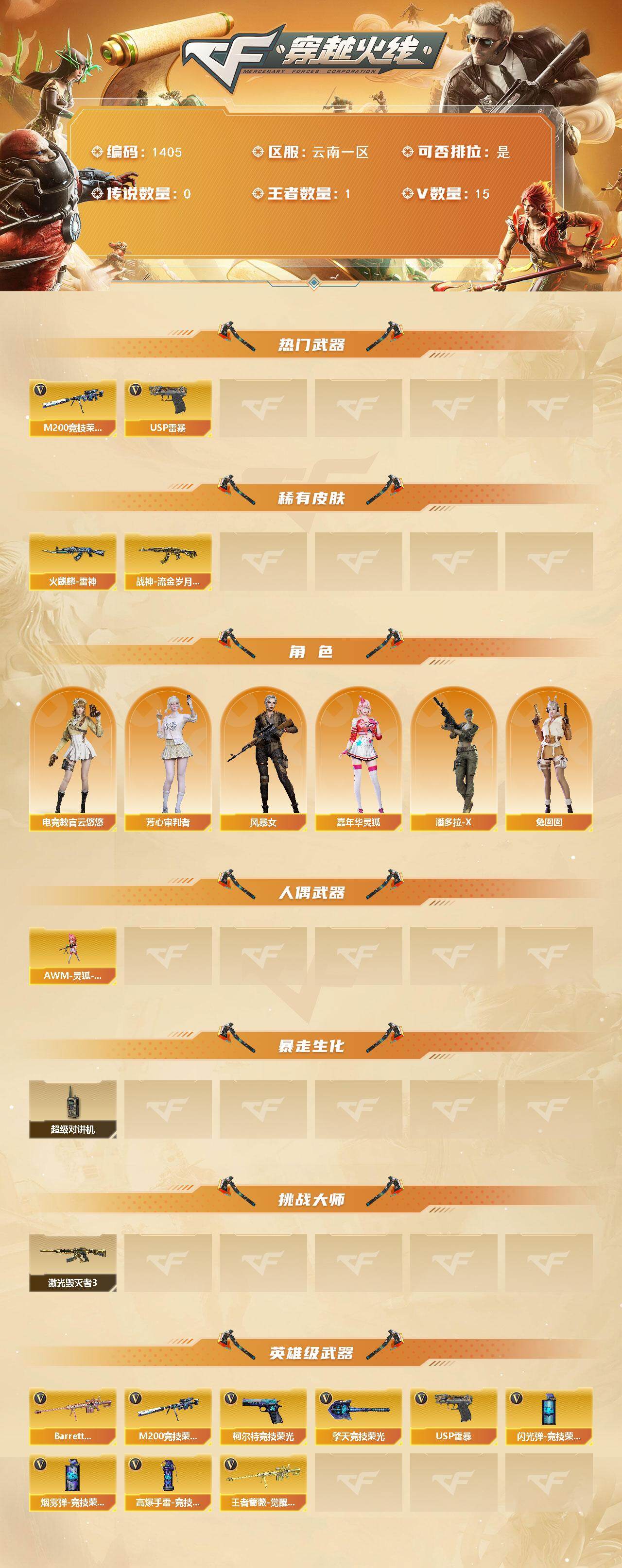 云南一区-15V-1王者-0炫金【热门武器】:M200-竞技荣光,USP-雷