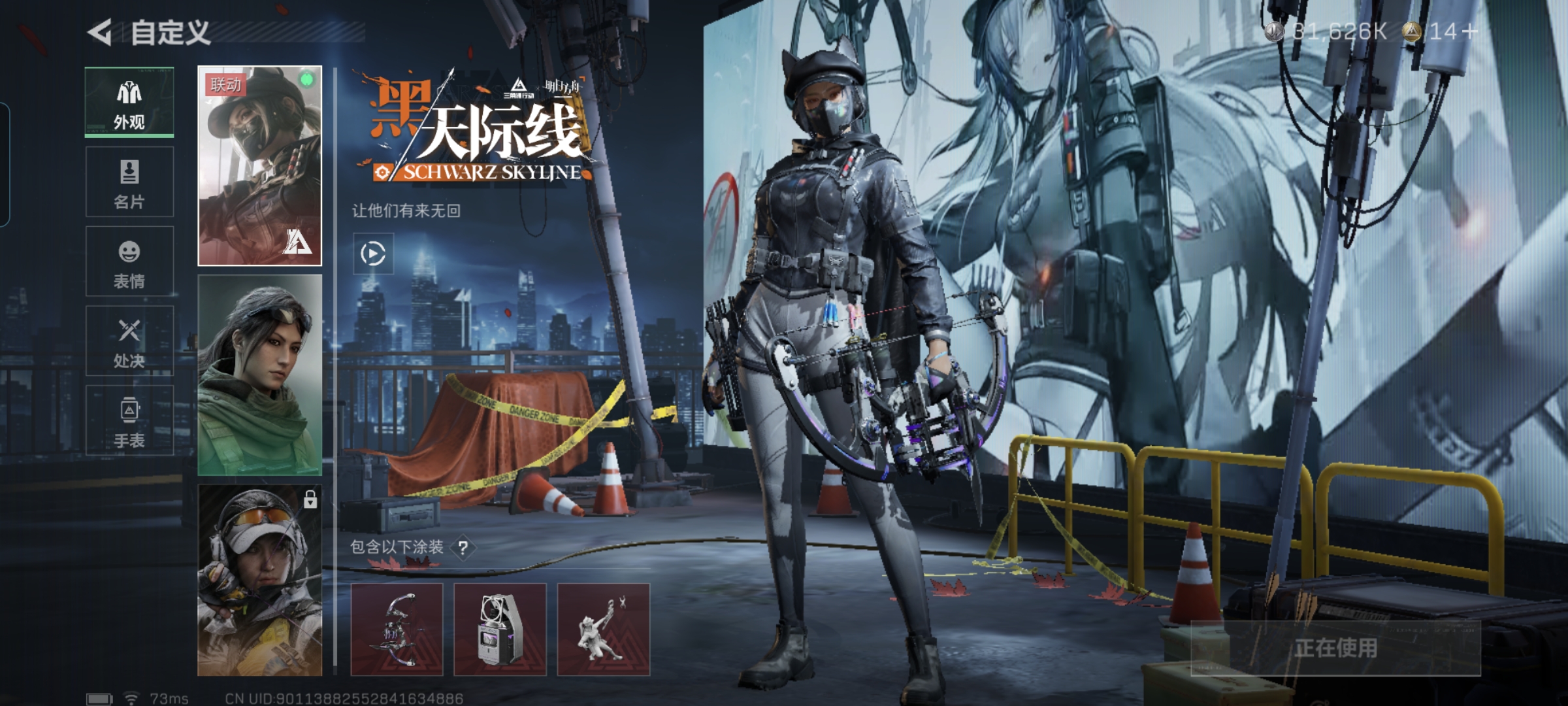 MSJ3370【149M资产 4干员天际线 黑海捆绑包 22金枪 满体力高特勤】三端互通-总价值149M-哈夫币31626k-烽火地带等级60-烽火地带【干员皮肤】骇爪-维什戴尔 蜂医-送葬人·无题密令 无名-夜鹰 露娜-黑·天际线【近战武器】黑鹰 黑海【枪皮】G3战斗步枪-水墨迷彩 M16A4突击步枪-常青藤 AS Val突击步枪-蝴蝶 M4A1突击步枪-粉色涂装 M4A1突击步枪-高雅黑 M4A1突击步枪-海色 M4A1突击步枪-阿米娅 AKM突击步枪-彩墨喷涂 AKM突击步枪-林中猎手 Q