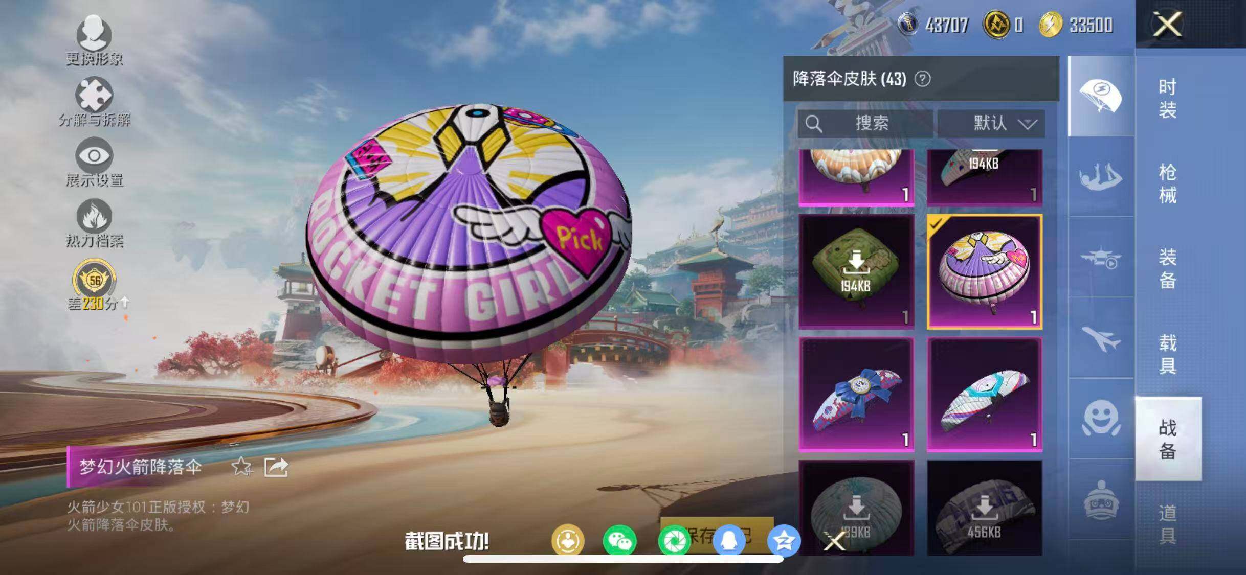 苹果 手Q-17粉装-2特效枪-1载具-6粉色飞行器-50635热力值-3王牌