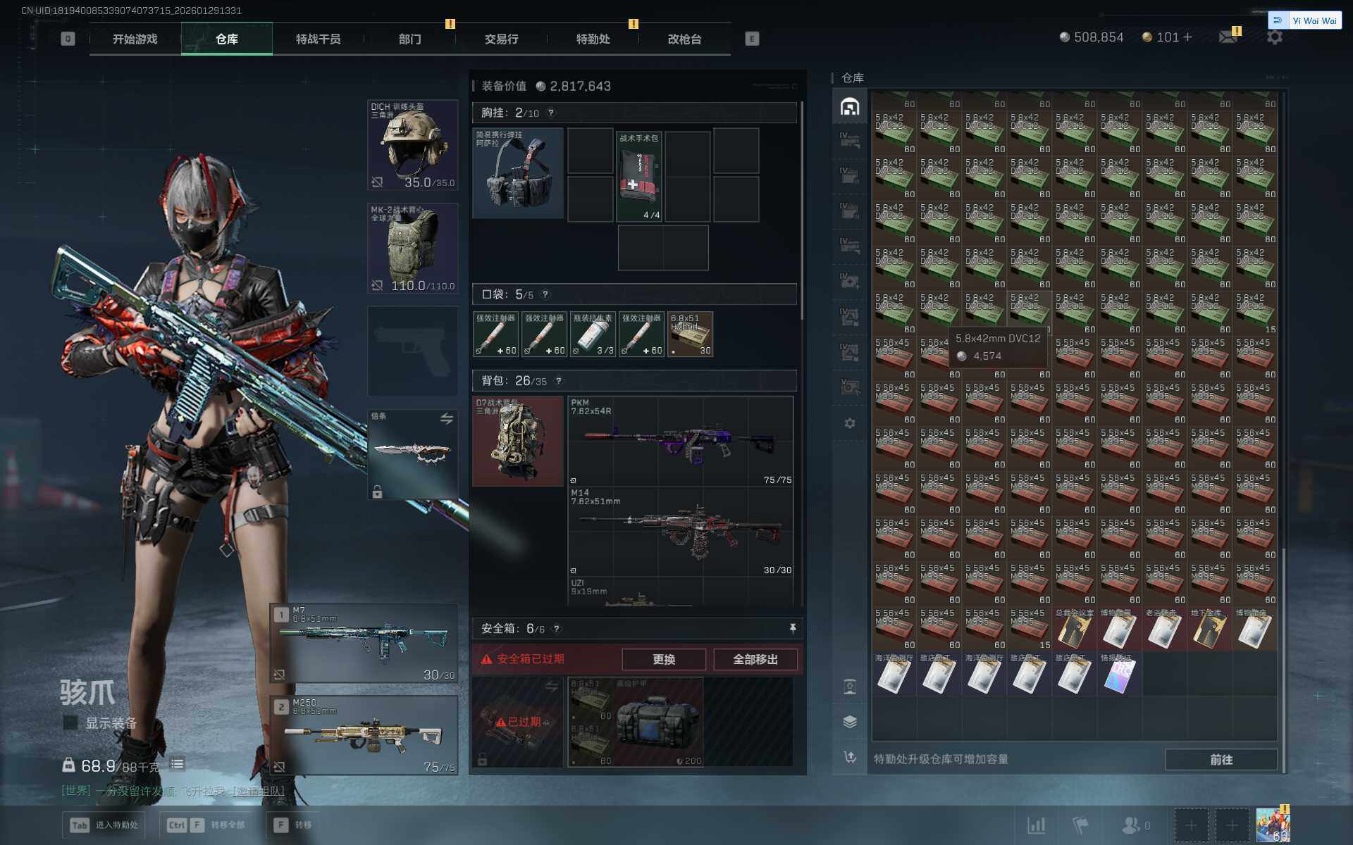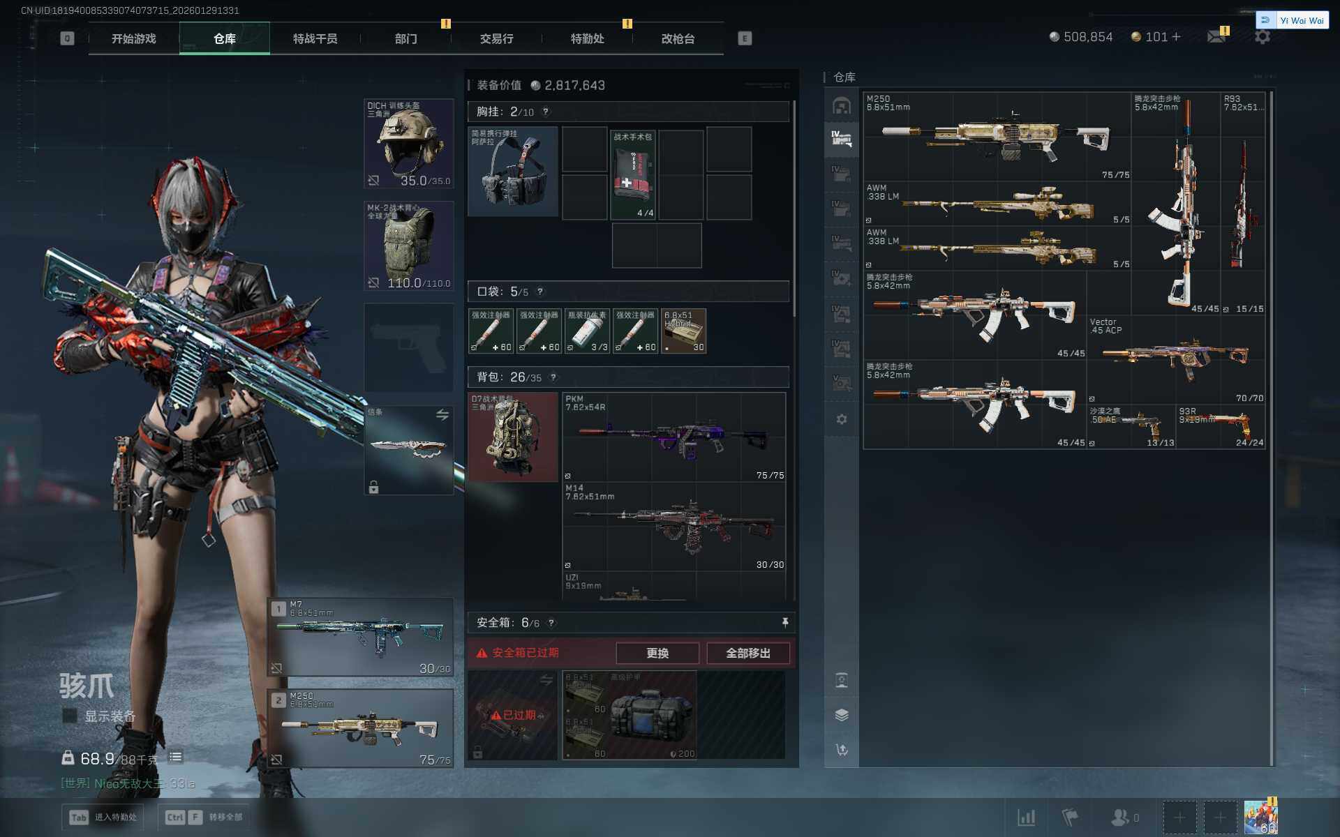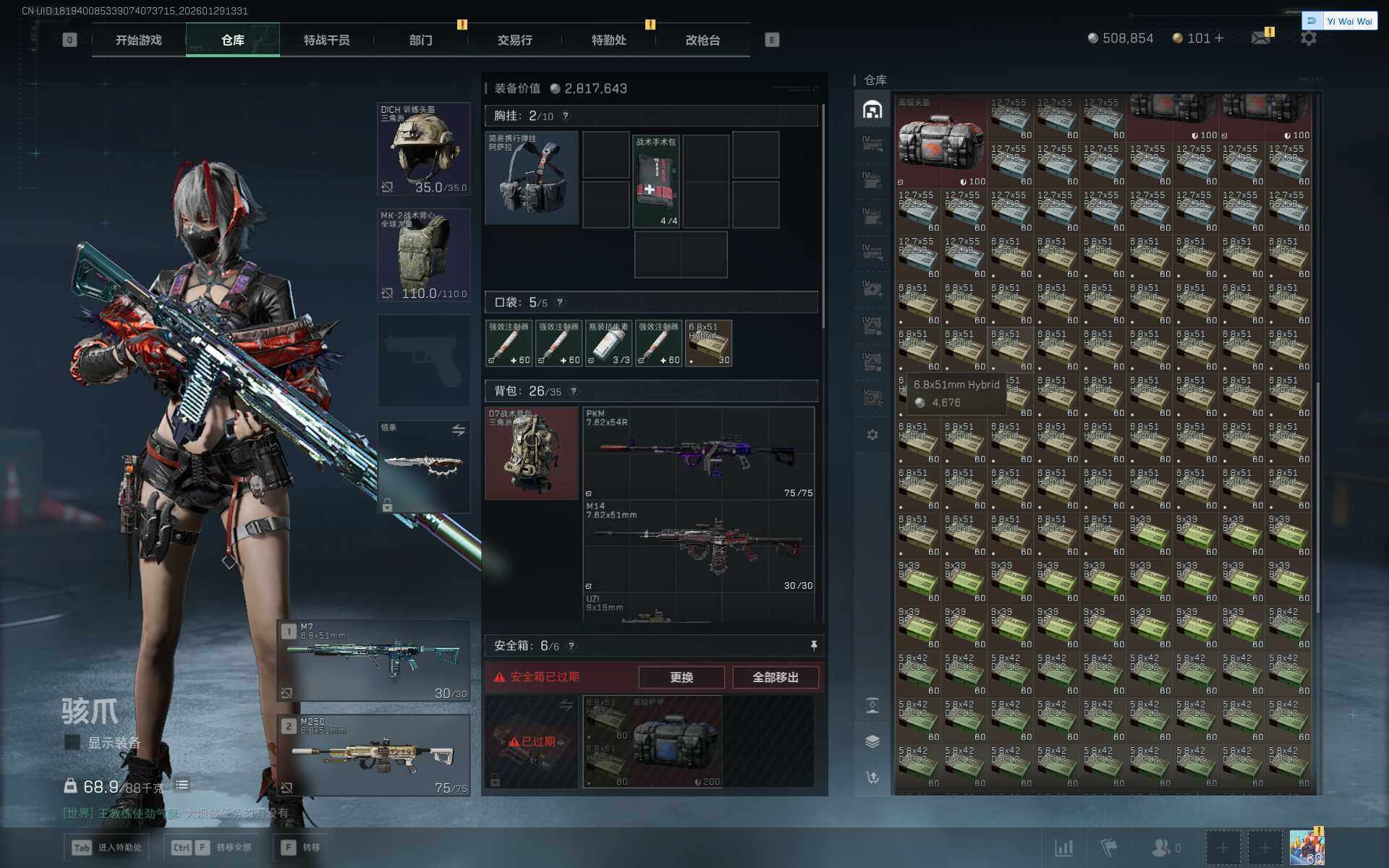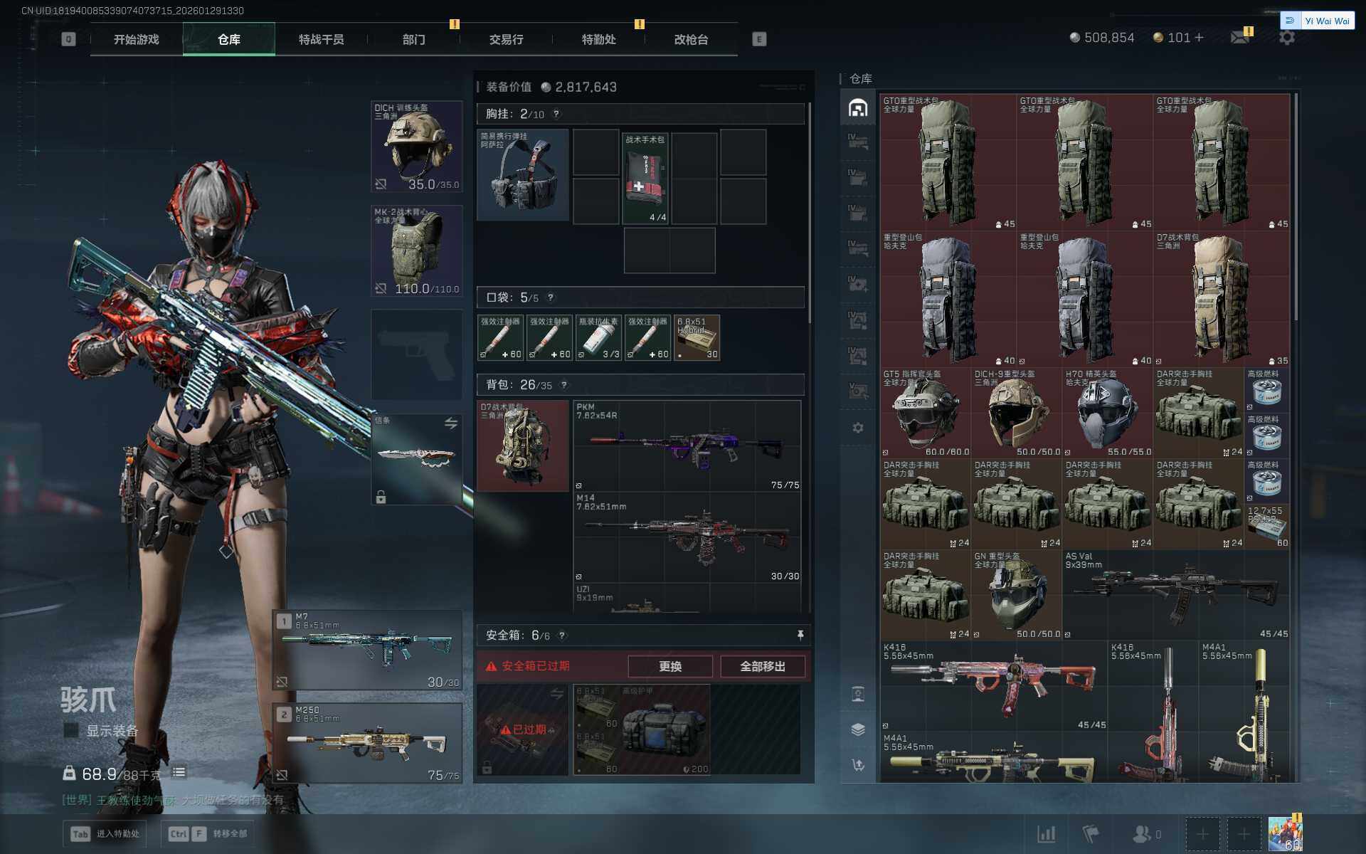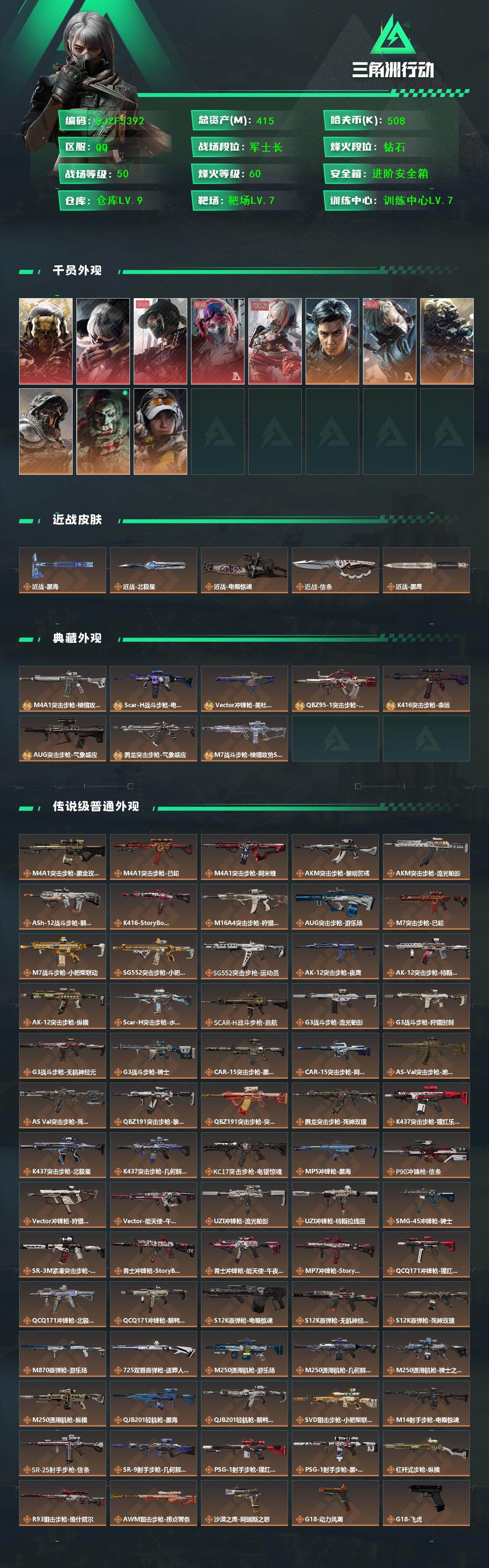 总资产(M):415M/哈夫币(K):508K/传说枪皮数:82/全面战场等级:50_段位:军士长/烽火地带等级:60_段位:钻石/