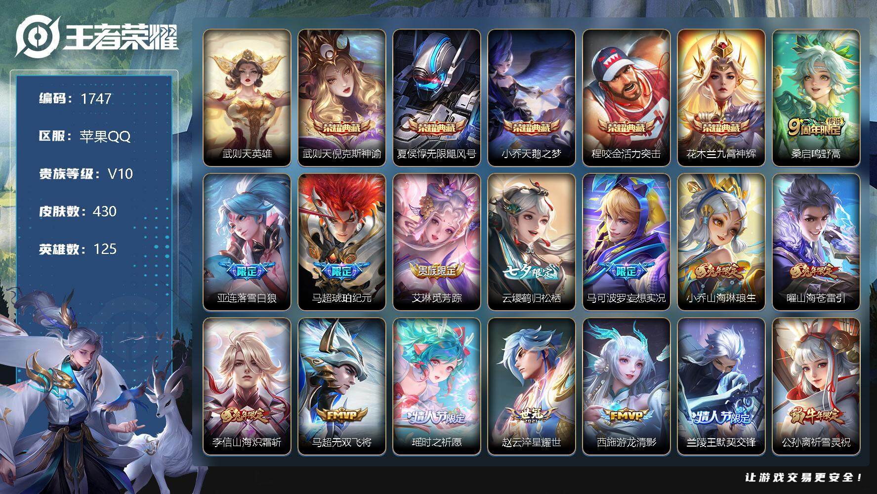 商品标题】:正式服77段对抗路,主播齐鹏鹏本人号,2.1w天花板战力亚连除主播一只鱼以外的第二个2.1w亚连,国服达摩1.7w战,巅峰历史魔方,苹果Q-V10-最强王者段位-125英雄-430皮肤-5典藏-0珍品无双-0无双-0珍品传说-37传说-144史诗