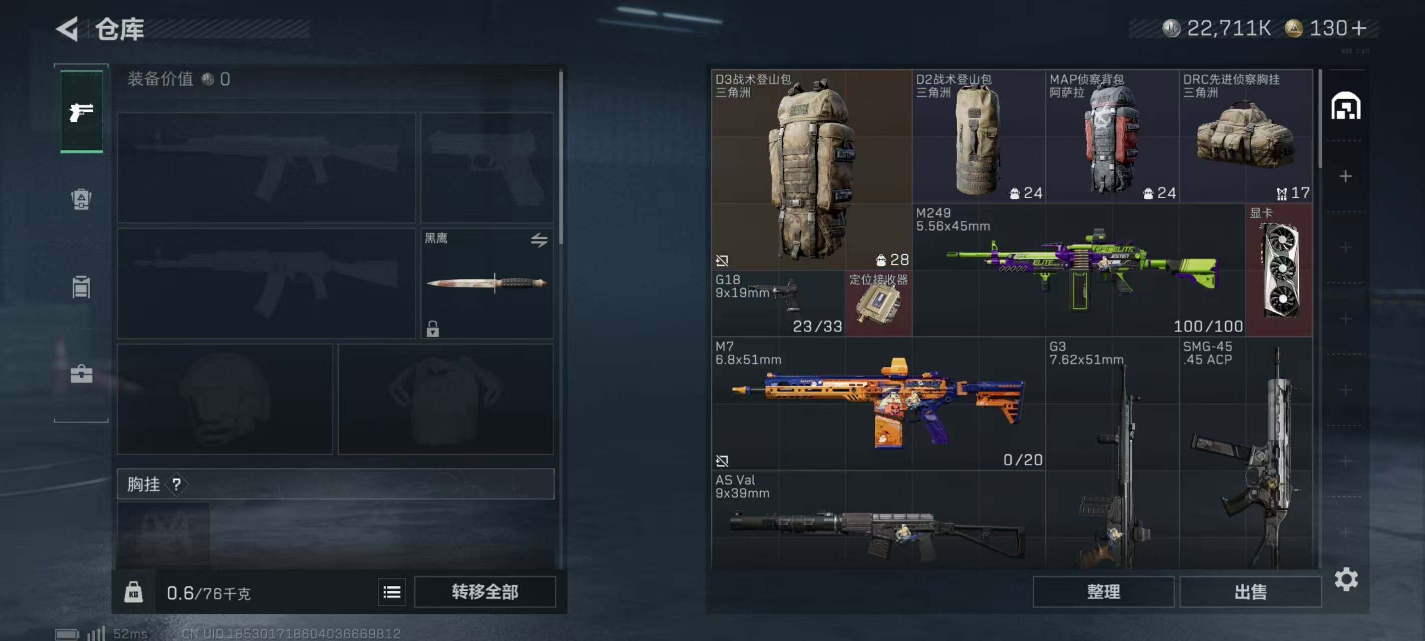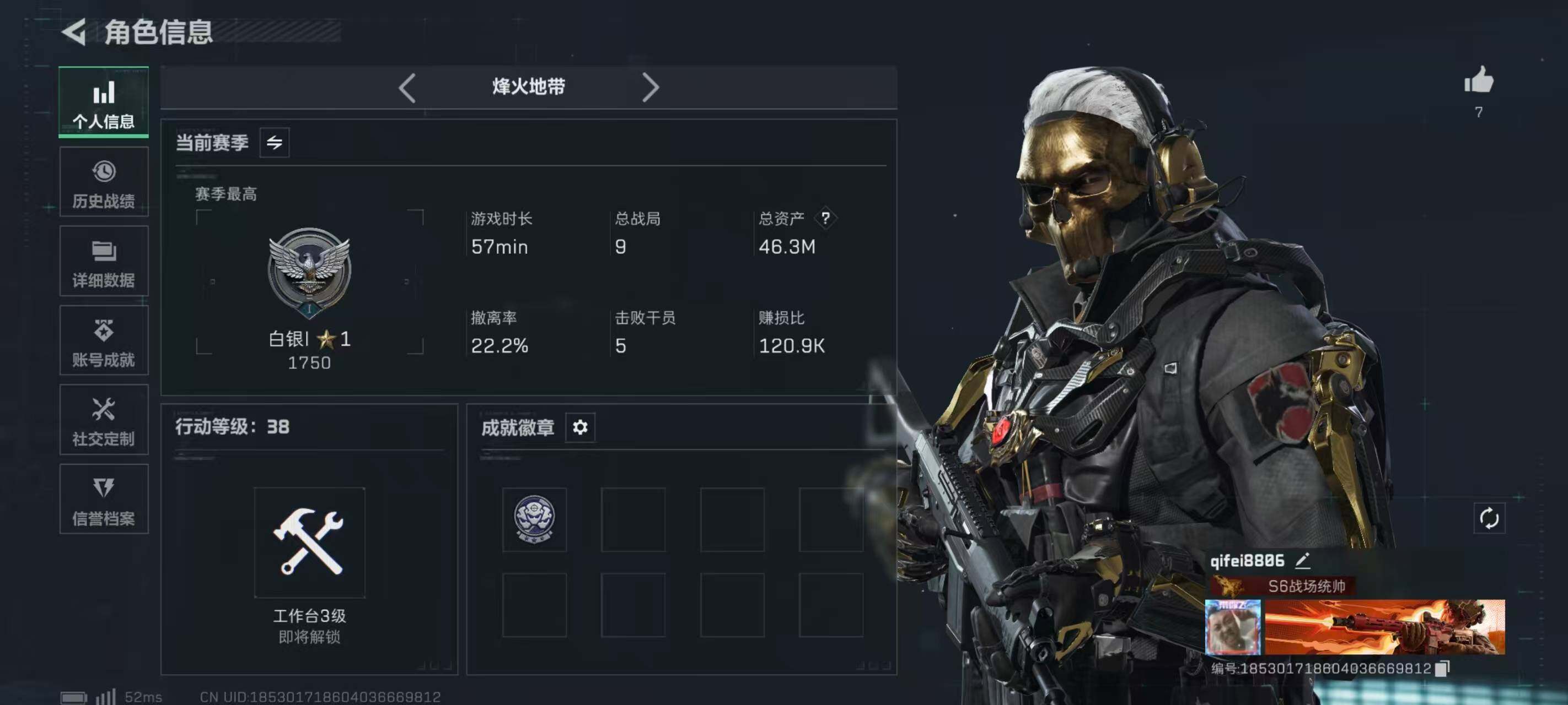 LJ4166总资产46.3M哈弗币22711K无红狼蚀金玫瑰,威龙铁面判官,蛊能天使午夜邮差无无AW子弹0发三角币130仓库LV.7基础安全箱靶场LV.3训练中心LV.4无,红狼-蚀金玫瑰,威龙-铁面判官,蛊-能天使午夜邮差