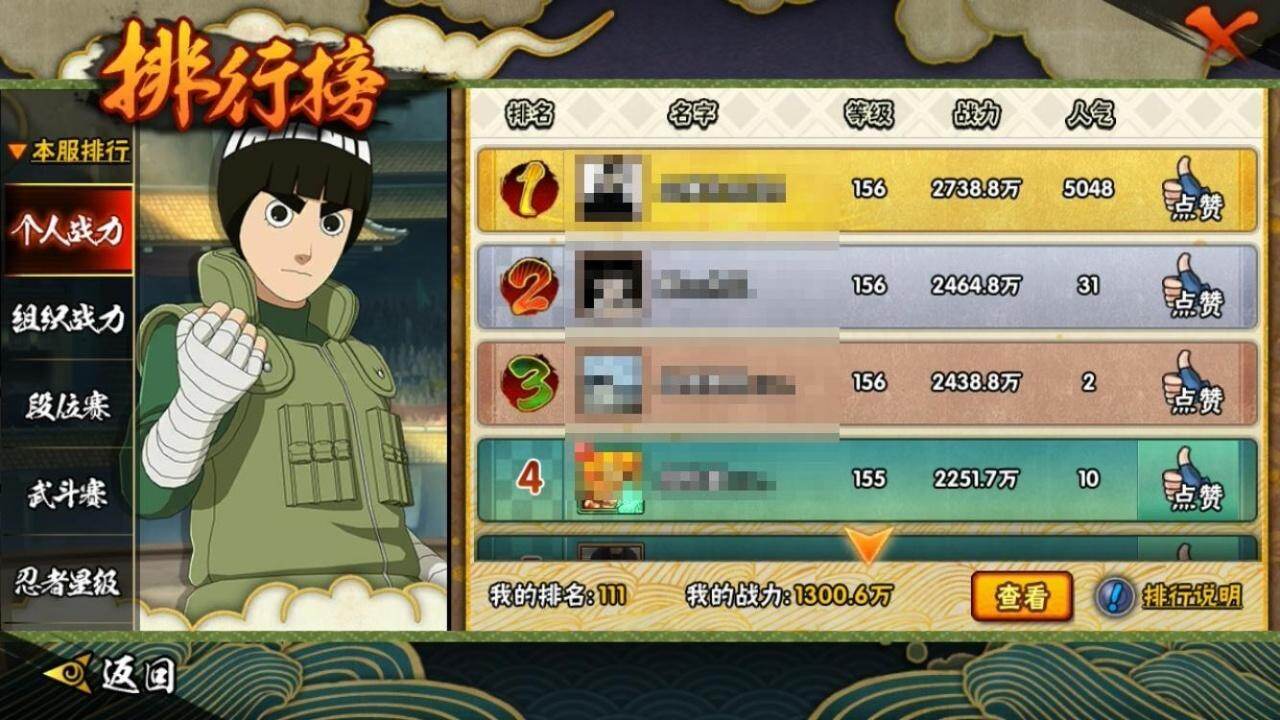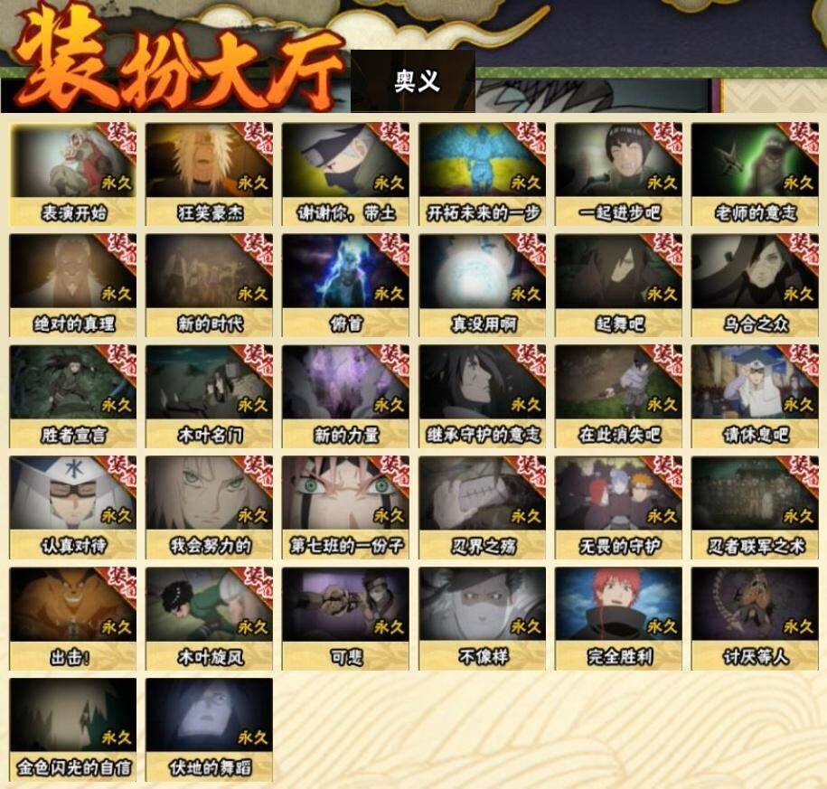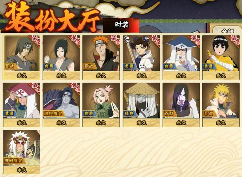 3星大筒木桃式,3星千手柱间「木叶创立」,3星宇智波佐助「永恒万花筒」,3星宇智波斑「秽土转生·解」,3星神秘面具男「红夜之刃」,3星宇智波带土「忍界大战」,3星宇智波斑「白面具」,3星波风水门,3星漩涡鸣人「九喇嘛连结」,3星千手扉间「秽土转生」,3星宇智波鼬「须佐能乎」,3星猿飞日斩,3星猿飞日斩「秽土转生」,3星佩恩「天道」,3星自来也,3星大野