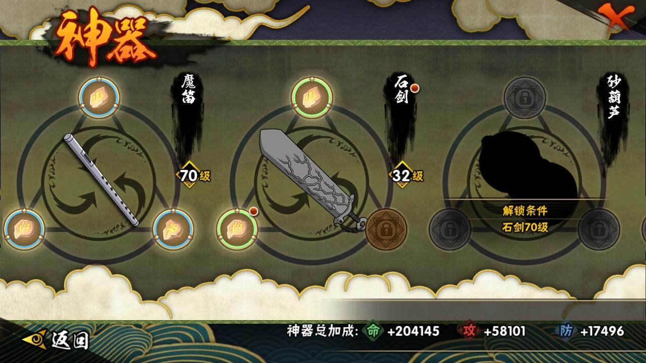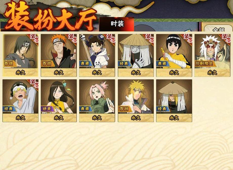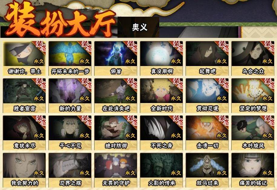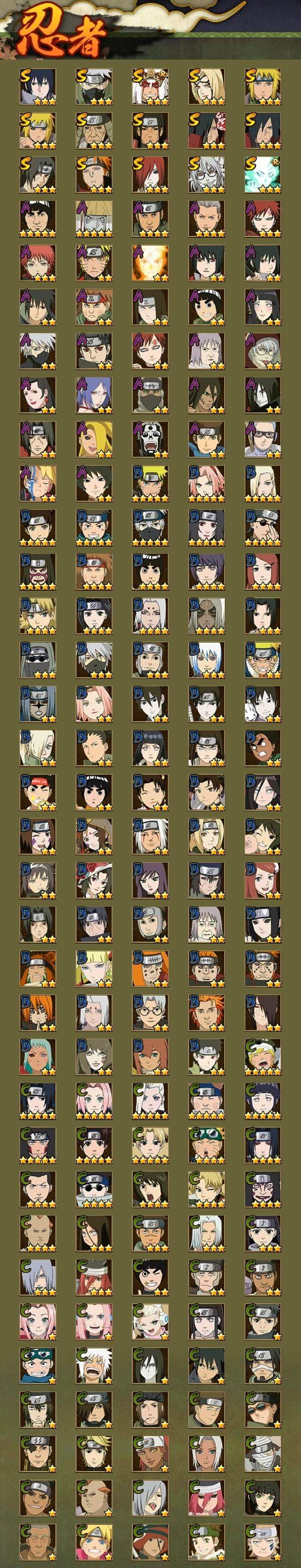 3星宇智波佐助「永恒万花筒」,3星宇智波斑「秽土转生·解」,3星波风水门,3星宇智波斑「秽土转生」,3星宇智波鼬「须佐能乎」,3星千手柱间「秽土转生」,3星波风水门「秽土转生」,3星猿飞日斩「秽土转生」,3星纲手「百豪」,3星药师兜「仙人模式」,3星长门「秽土转生」,3星佩恩「天道」,3星自来也「舞之豪杰」,3星旗木卡卡西「须佐能乎」,3星大筒木舍人「最终