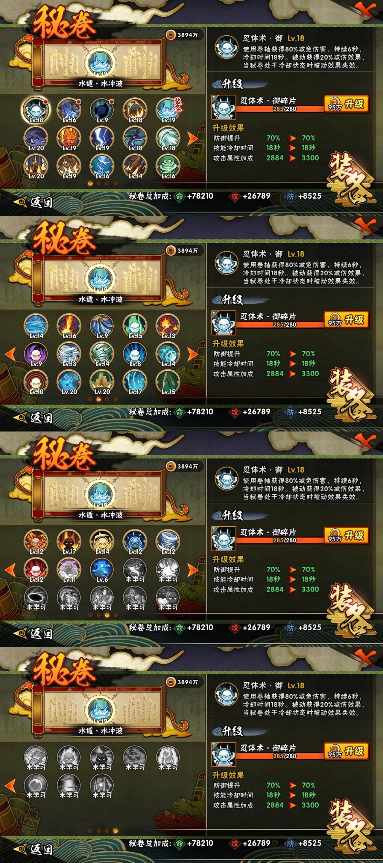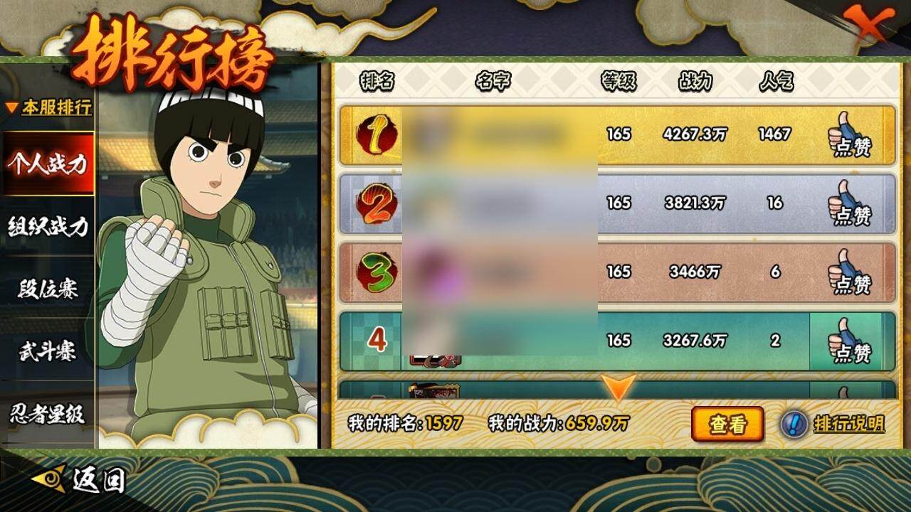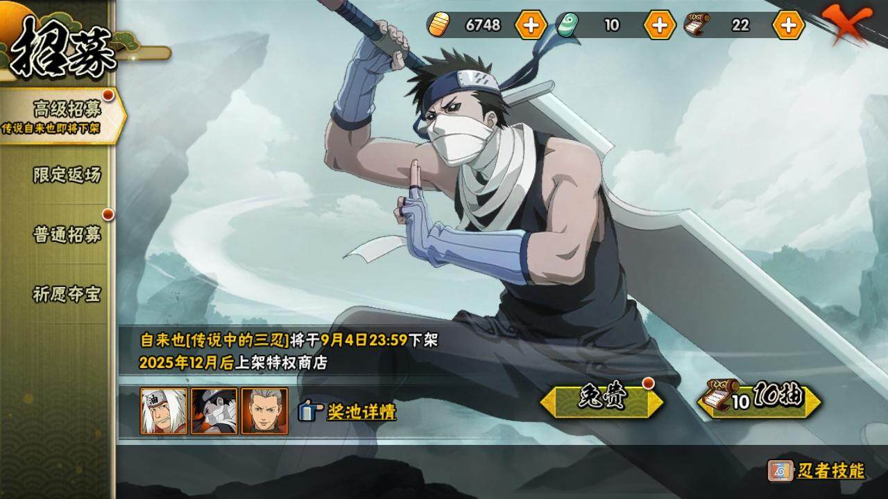 3星宇智波佐助「永恒万花筒」,3星宇智波斑「秽土转生·解」,3星波风水门,3星宇智波斑「秽土转生」,3星宇智波鼬「须佐能乎」,3星千手柱间「秽土转生」,3星波风水门「秽土转生」,3星猿飞日斩「秽土转生」,3星纲手「百豪」,3星药师兜「仙人模式」,3星长门「秽土转生」,3星佩恩「天道」,3星自来也「舞之豪杰」,3星旗木卡卡西「须佐能乎」,3星大筒木舍人「最终