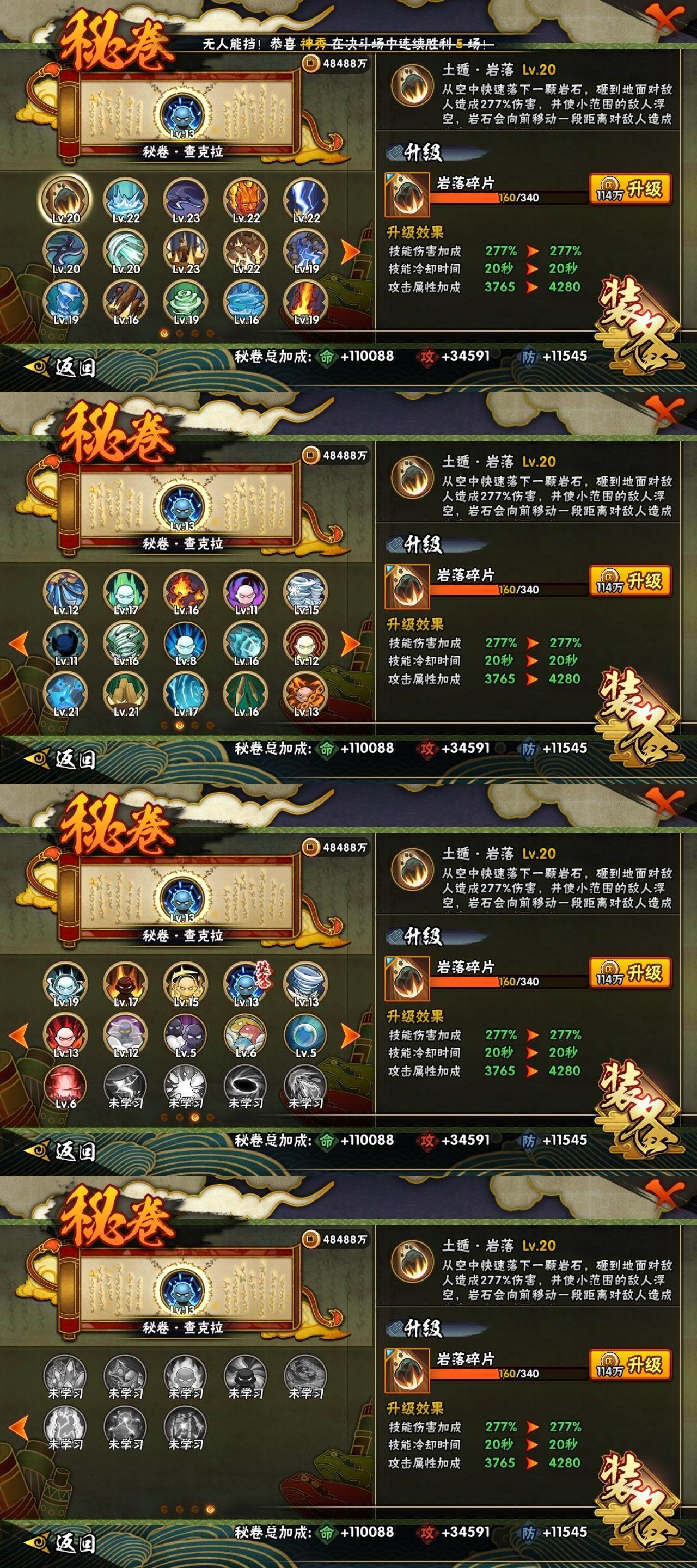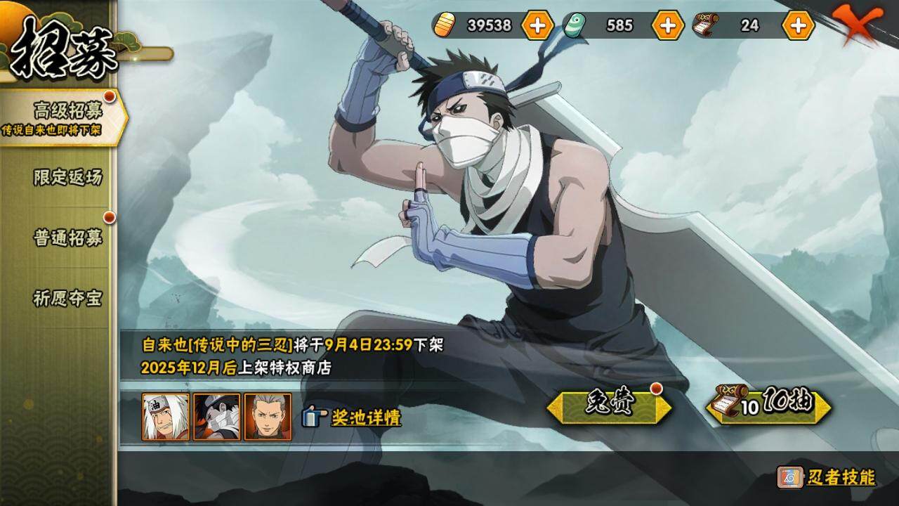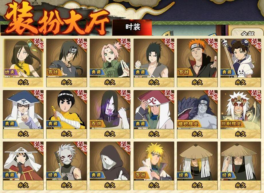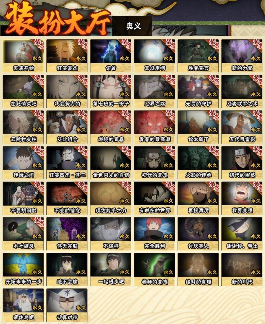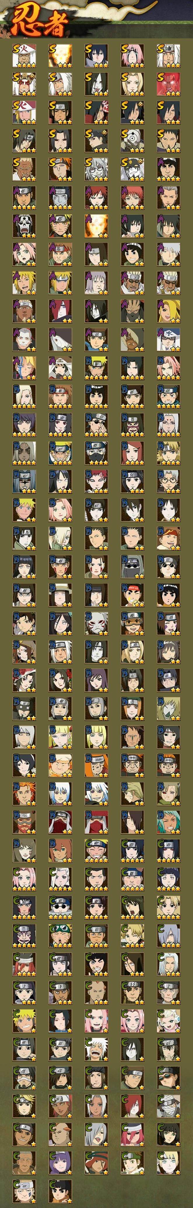 3星大筒木桃式,3星宇智波佐助「永恒万花筒」,3星宇智波斑「秽土转生·解」,3星宇智波带土「忍界大战」,3星宇智波斑「白面具」,3星波风水门,3星漩涡鸣人「九喇嘛连结」,3星迈特凯「死门」,3星宇智波鼬「秽土转生」,3星宇智波斑「秽土转生」,3星宇智波鼬「须佐能乎」,3星千手柱间「秽土转生」,4星猿飞日斩,3星药师兜「仙人模式」,3星宇智波斑「木叶创立