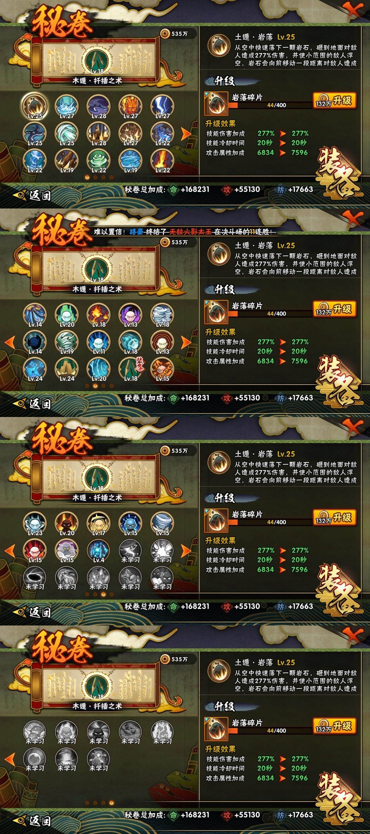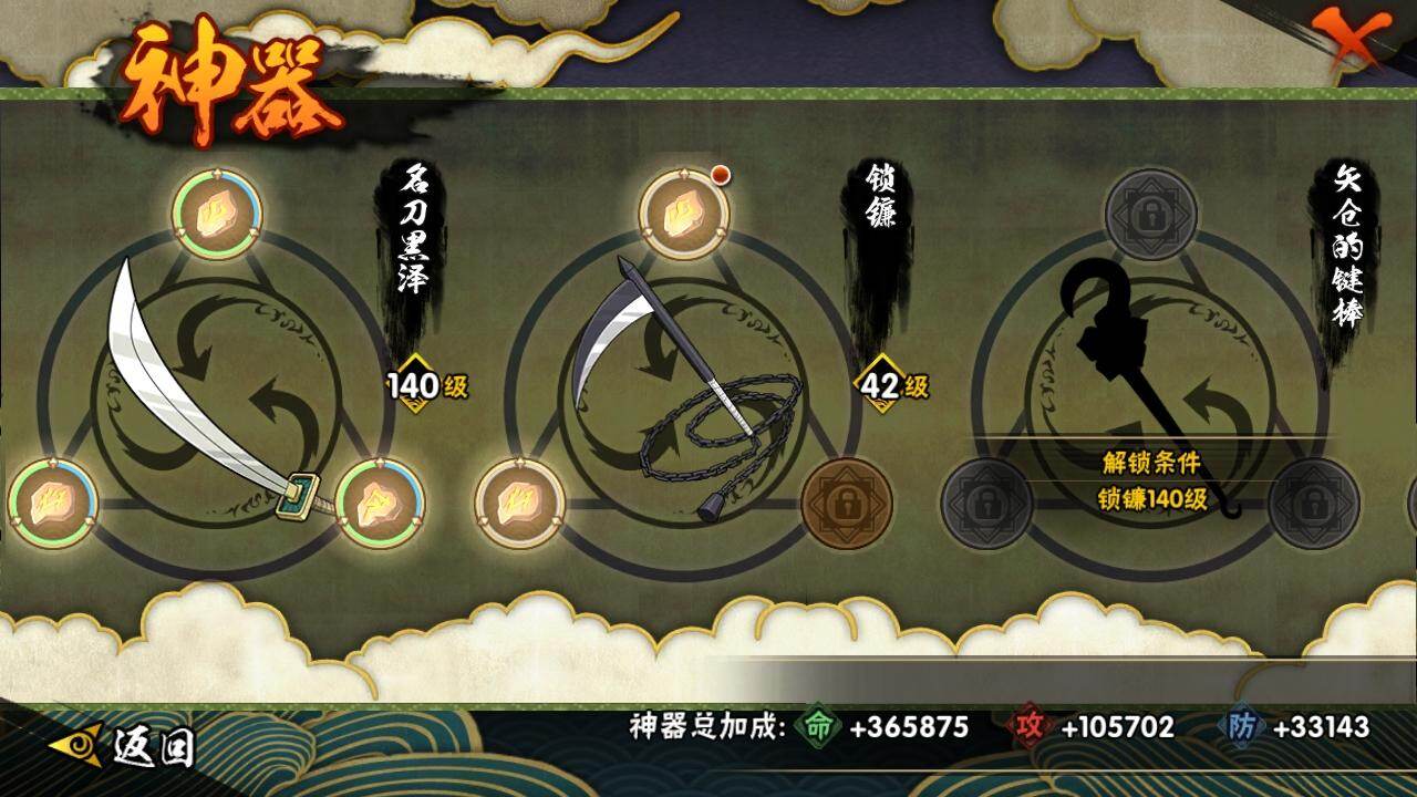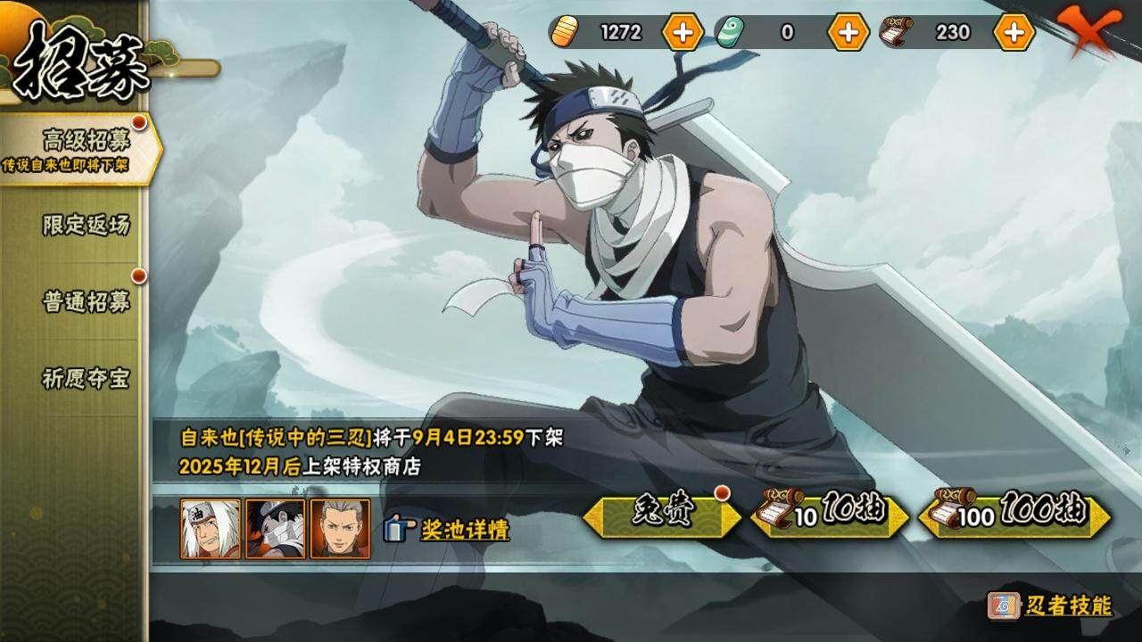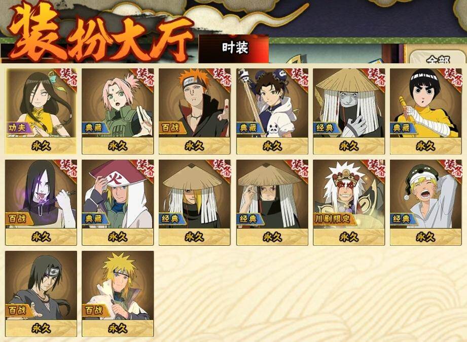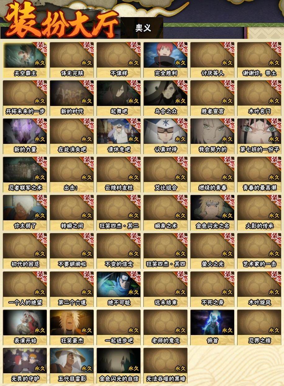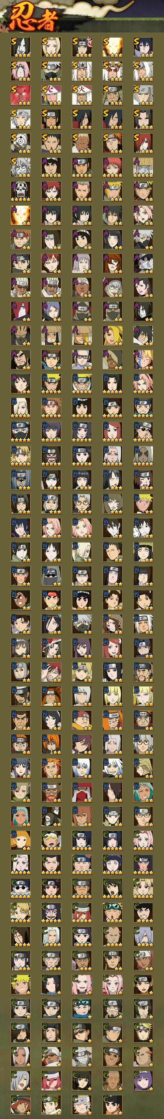 3星宇智波佐助「永恒万花筒」,3星宇智波斑「秽土转生·解」,3星宇智波带土「忍界大战」,3星宇智波斑「白面具」,3星波风水门,3星漩涡鸣人「九喇嘛连结」,3星迈特凯「死门」,3星千手扉间「秽土转生」,3星宇智波鼬「秽土转生」,3星宇智波斑「秽土转生」,4星宇智波鼬「须佐能乎」,3星千手柱间「秽土转生」,3星猿飞日斩,3星千手扉间,3星猿飞日斩「秽土转生」
