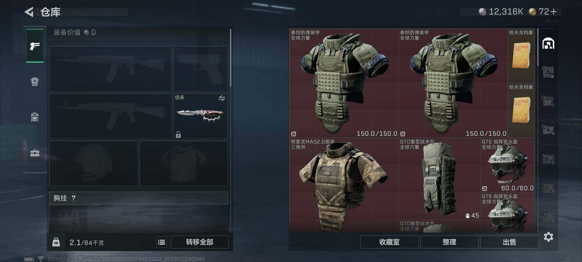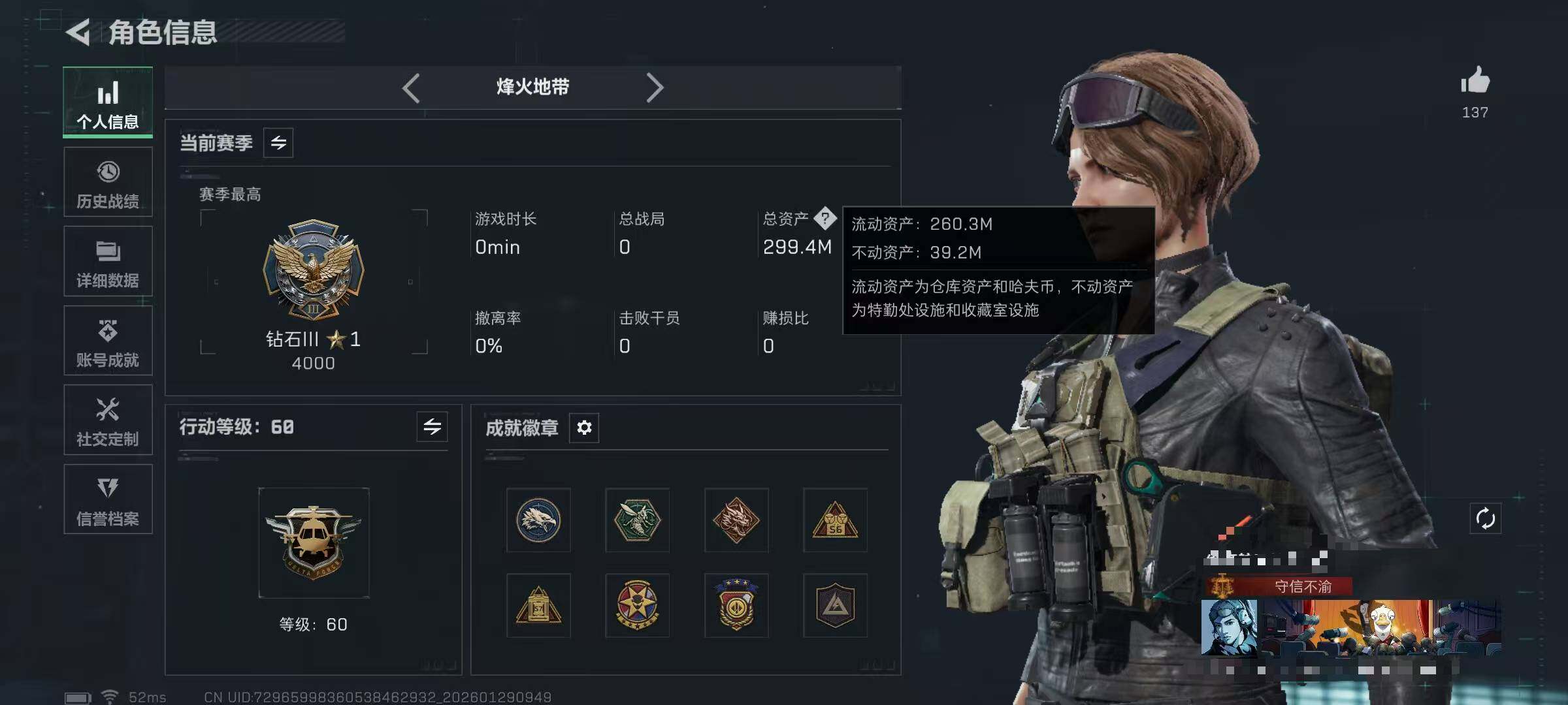 总资产(M):299M/哈夫币(K):12316K/传说枪皮数:23/全面战场等级:23_段位:上等兵/烽火地带等级:60_段位:钻石/