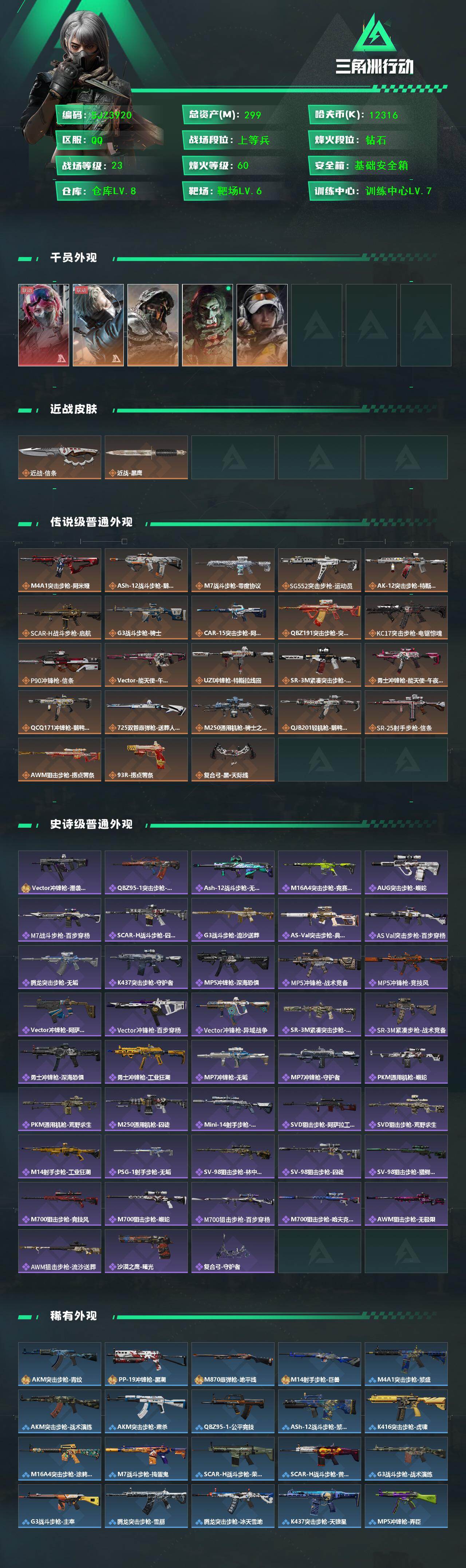 【SJZ3920】总资产(M):299M/哈夫币(K):12316K/哈夫币(K):12316K/传说枪皮数:23/全面战场等级:23_段位:上等兵/烽火地带等级:60_段位:钻石/蛊-能天使午夜邮差/蜂医-送葬人·无题密令/深蓝-不破誓约/红狼-电锯惊魂/露娜-金牌射手/近战-信条/近战-黑鹰/M4A1突击步枪-阿米娅/ASh-12战斗步枪-鹅鸭杀/M7战斗步枪-零度协议/SG552突击步枪-运动员/AK-12突击步枪-特斯拉线圈/SCAR-H战斗步枪-启航/G3战斗步枪-骑士/CAR-15突