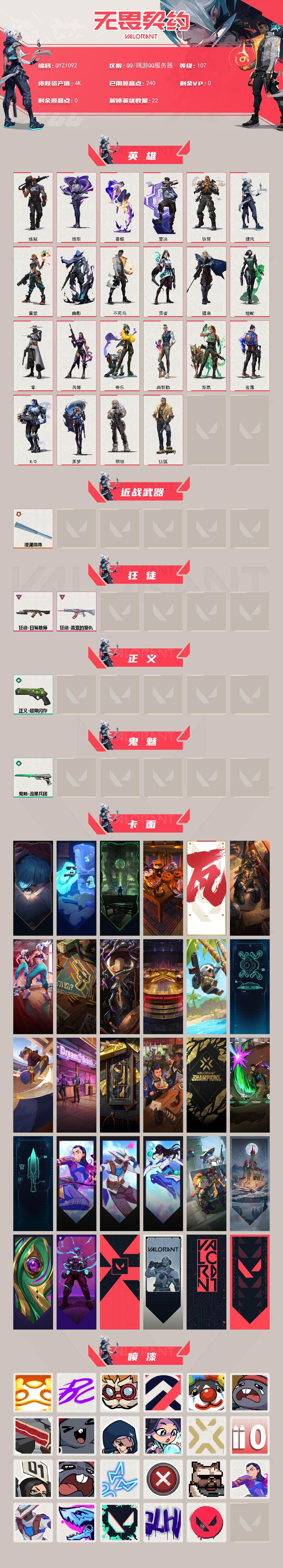 【QYZ1092】终极*1/卓越*2/皮肤*7/等级*107/段位:青铜/炼狱/维斯/暮蝶/钛狐/壹决/铁臂/捷风/雷兹/幽影/不死鸟/贤者/猎枭/蝰蛇/零/芮娜/奇乐/尚勃勒/斯凯/夜露/K/O/黑梦/钢锁/近战武器-澄湖潋滟/狂徒-盖亚的复仇/狂徒-日冕雄师/正义-超限闪存/鬼魅-流星兵团/《双城之战》拥抱 卡面/精灵大战 卡面/欢迎来到底城 卡面/南瓜盛典 卡面/VCT CN首冠 卡面/修车达人 卡面/热舞环节 卡面/正义的化身 卡面/时间到 卡面/最高舞台 卡面/树懒大作战 卡面/声感陷