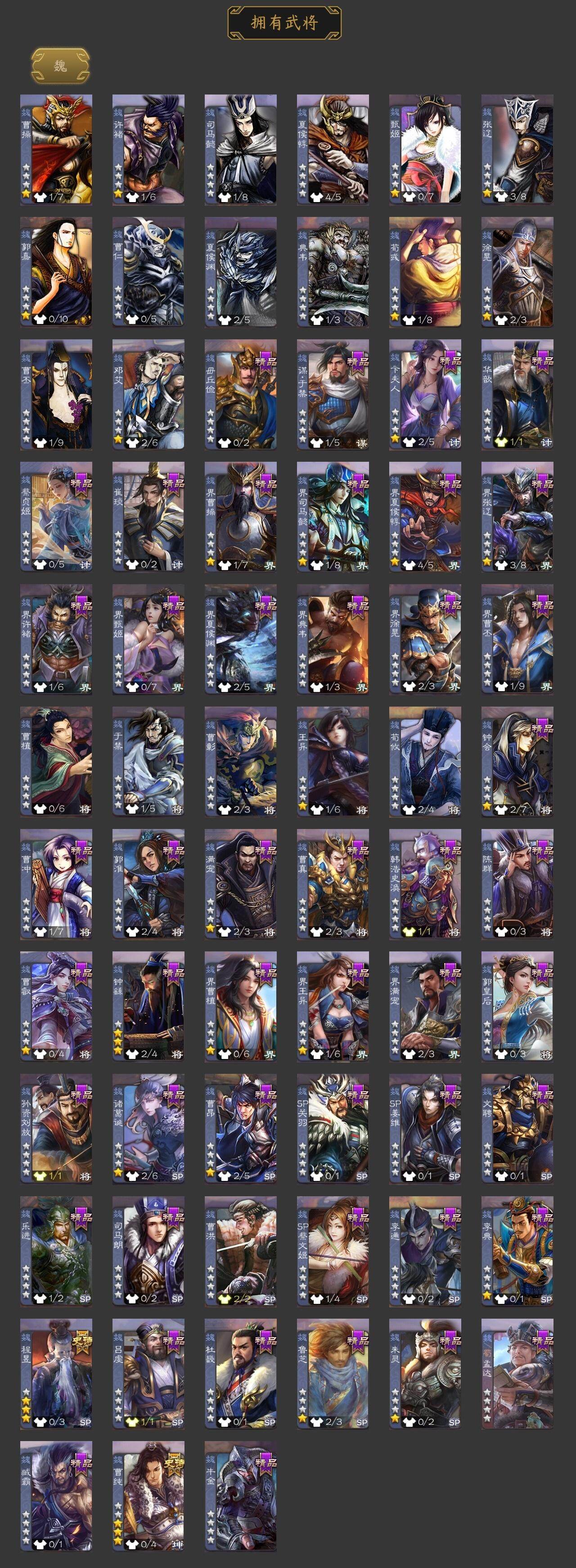 官阶:骠骑将军;VIP等级:VIP8;史诗武将数量:14;动态皮肤数量:7;武将总数:258;史诗宝珠数量:0;将魂数量:10;神将:3;魏国史诗武将:2;蜀国史诗武将:2;吴国史诗武将:4;群史诗武将:4