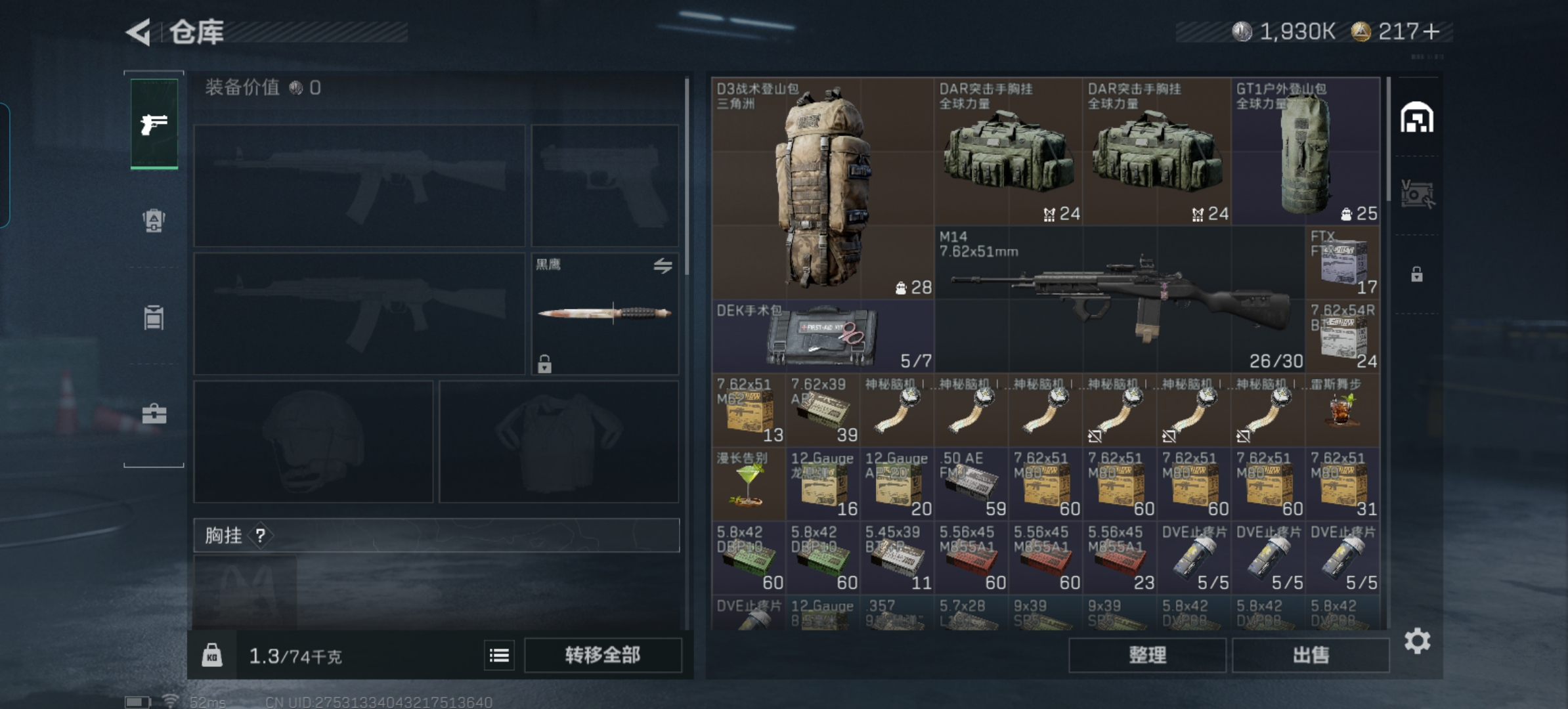 MSJ3363【总资产(M)】30.23【哈夫币】1930k【行动等级】60【烽火地带段位】钻石【近战武器】 黑鹰 【枪皮】M4A1突击步枪-粉色涂装 M4A1突击步枪-高雅黑 M4A1突击步枪-海色 AKM突击步枪-肃杀 QBZ95-1突击步枪-高雅黑 QBZ95-1突击步枪-海浪 QBZ95-1突击步枪-三角洲力量 QBZ95-1突击步枪-海色 QBZ95-1突击步枪-2026 AKS-74U突击步枪-冰天雪地 K416突击步枪-高雅黑 K416突击步枪-冬日风情 M16A4突击步枪-高雅黑