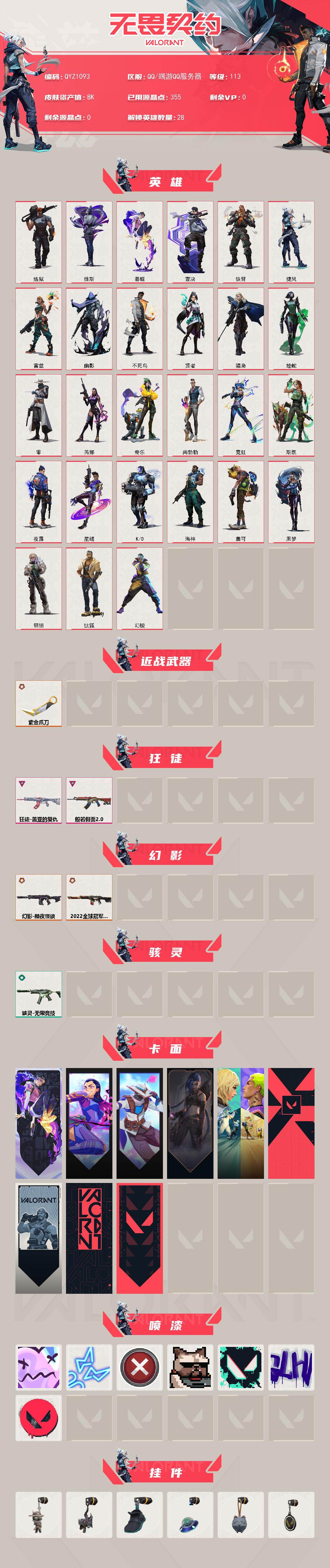 【QYZ1093】终极*3/卓越*2/皮肤*10/等级*113/段位:白银/幻棱/炼狱/维斯/暮蝶/钛狐/壹决/铁臂/捷风/雷兹/幽影/不死鸟/贤者/猎枭/蝰蛇/零/芮娜/奇乐/尚勃勒/霓虹/斯凯/夜露/星礈/K/O/海神/盖可/黑梦/钢锁/近战武器-紫金爪刀/狂徒-般若假面//2.0/狂徒-盖亚的复仇/幻影-2022全球冠军赛/幻影-黯夜怪谈/骇灵-无限竞技/无畏契约:暮蝶 卡面/无畏契约GO!第一卷:芮娜 卡面/无畏契约GO!第一卷:零 卡面/《双城之战》金克丝 卡面/钢锁vs盖可 卡面/代