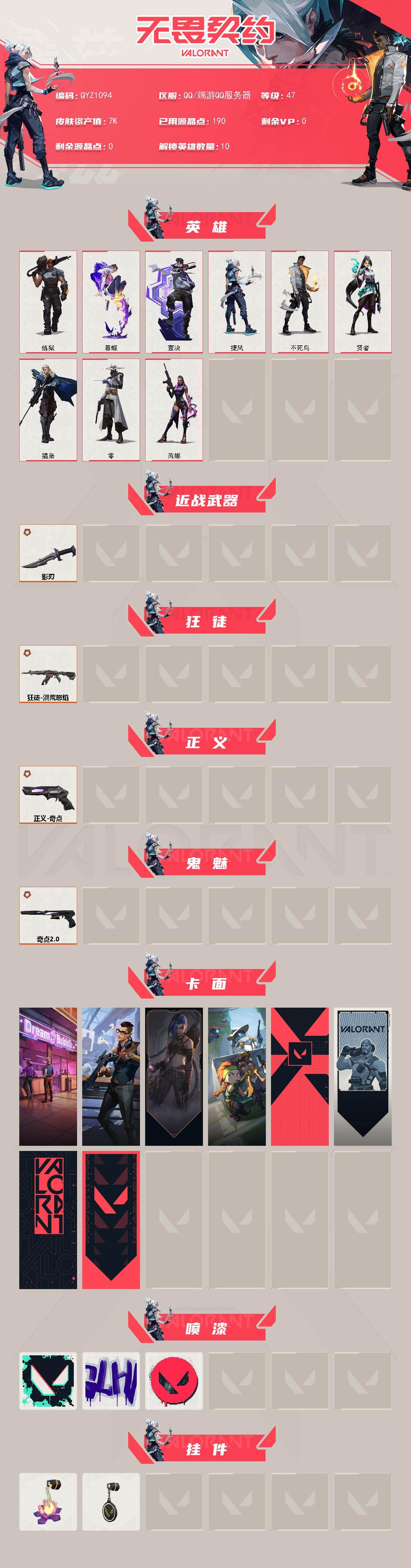 【QYZ1094】终极*4/皮肤*6/等级*47/段位:未定级/炼狱/暮蝶/壹决/捷风/不死鸟/贤者/猎枭/零/芮娜/近战武器-影刃/狂徒-洪荒怒焰/正义-奇点/鬼魅-奇点//2.0/梦幻奶茶 卡面/西装暴徒 卡面/《双城之战》金克丝 卡面/别冒尖 卡面/代号红色 卡面/新兵报到 卡面/V契约 卡面/无畏契约 卡面/胜利属于无畏契约 喷漆/GLHF 喷漆/无畏契约 喷漆/传世莲华 挂饰/无畏契约 纪念币 挂饰