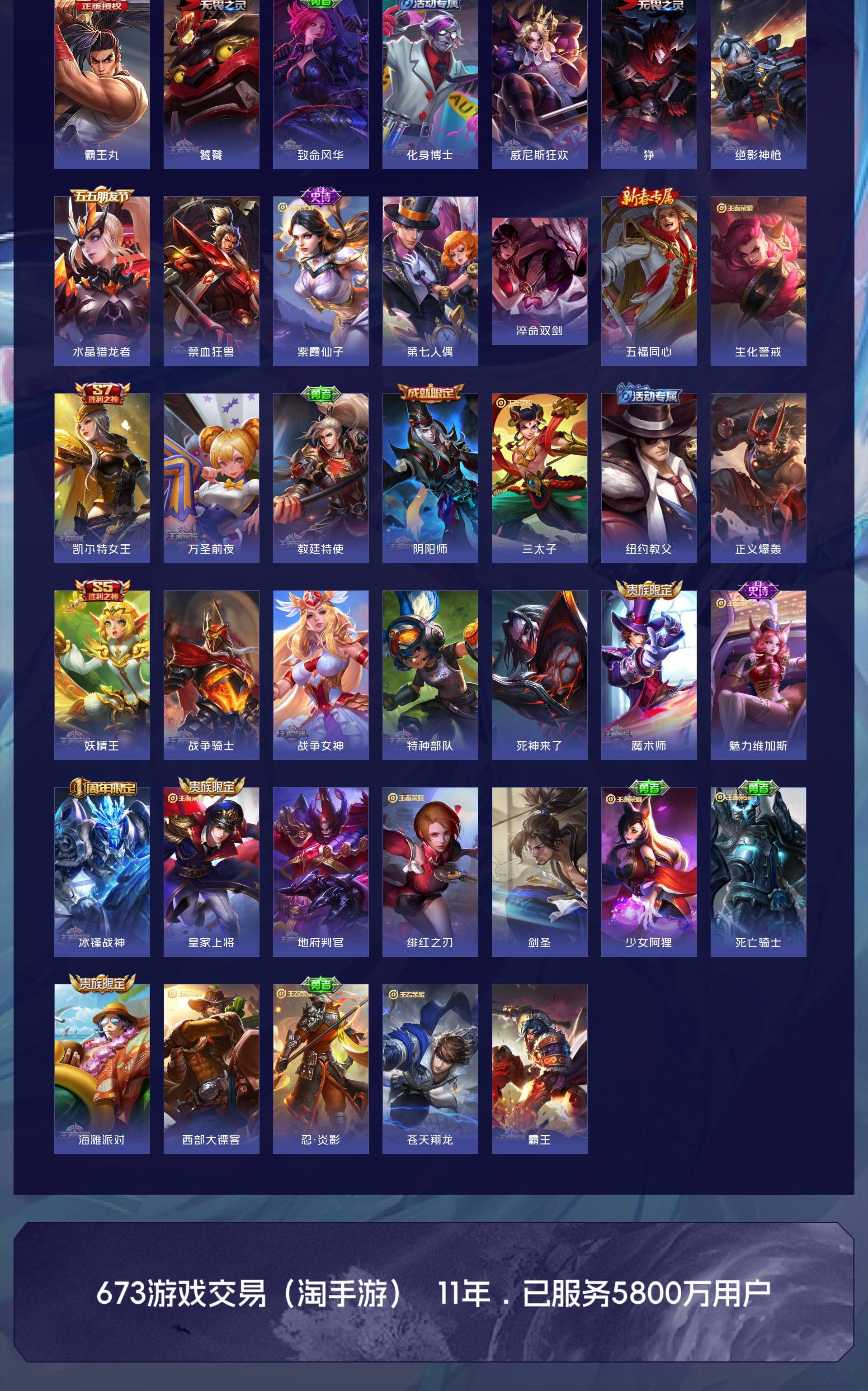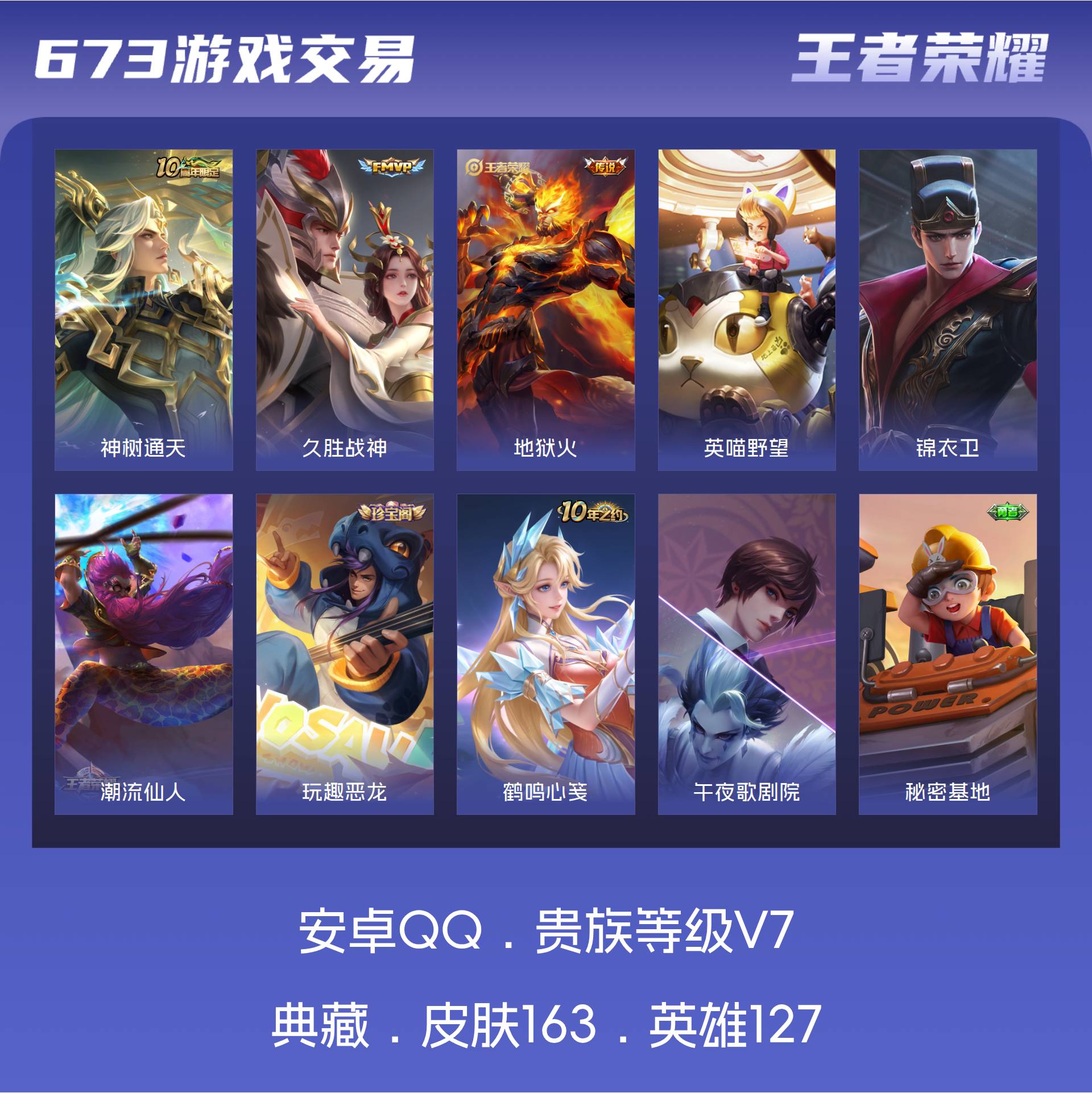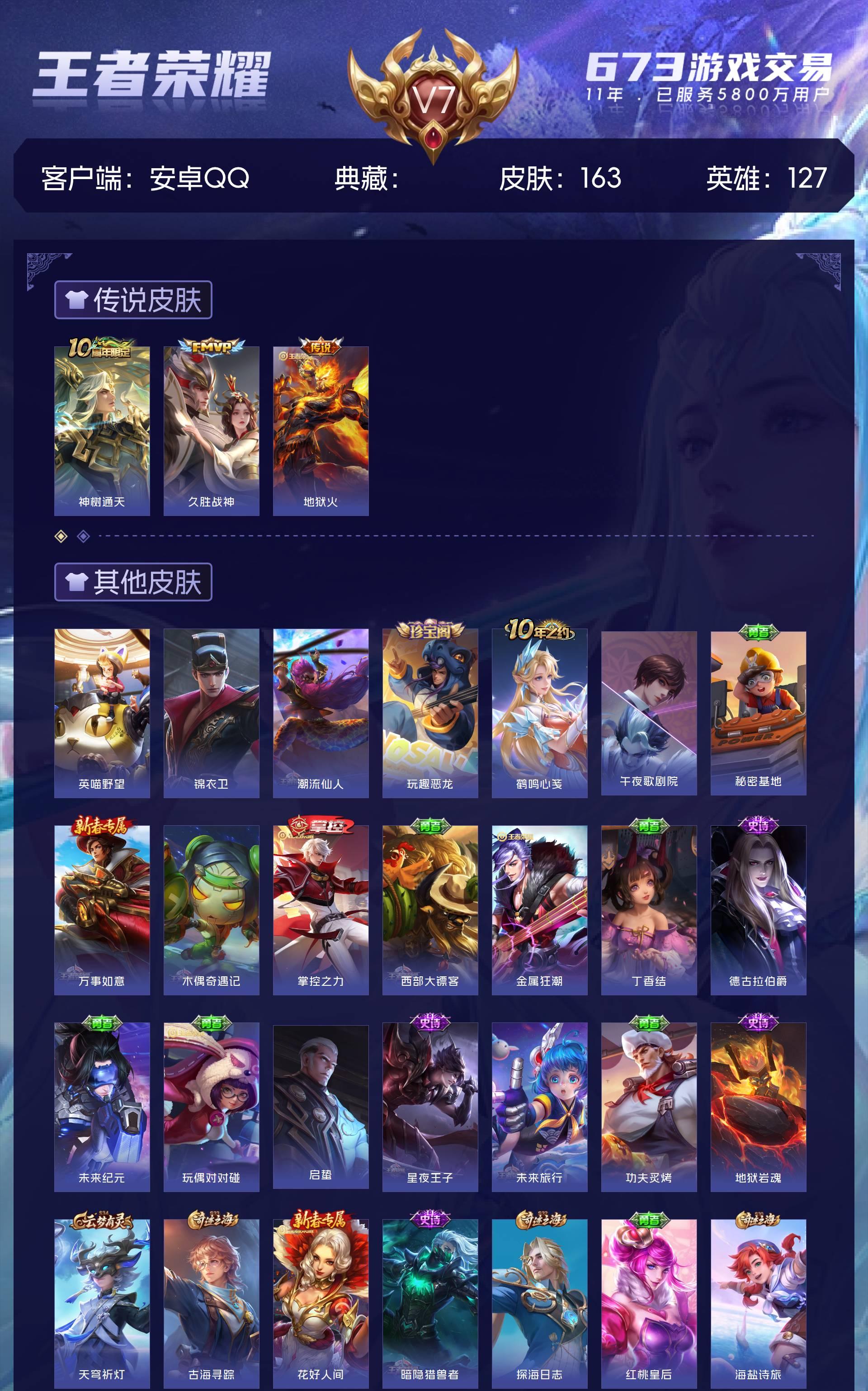 安卓QQ/荣耀黄金/163皮肤/127英雄/0典藏/0珍品无双/0无双/0珍品传说/3传说/31史诗