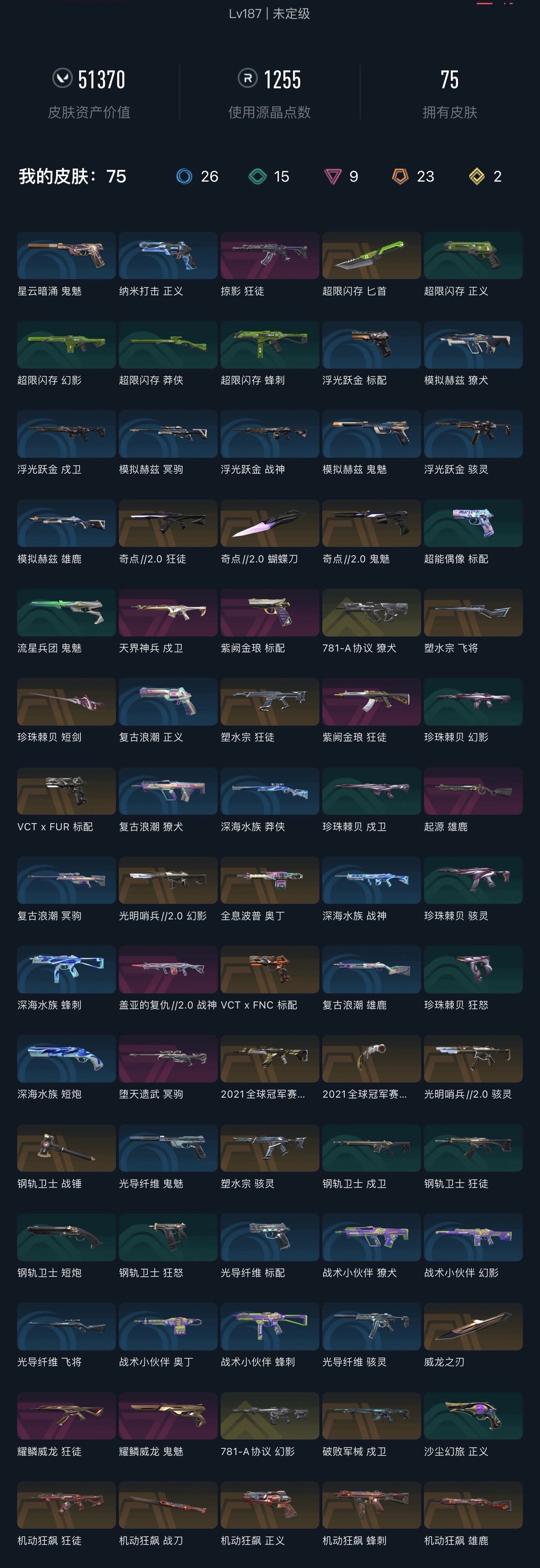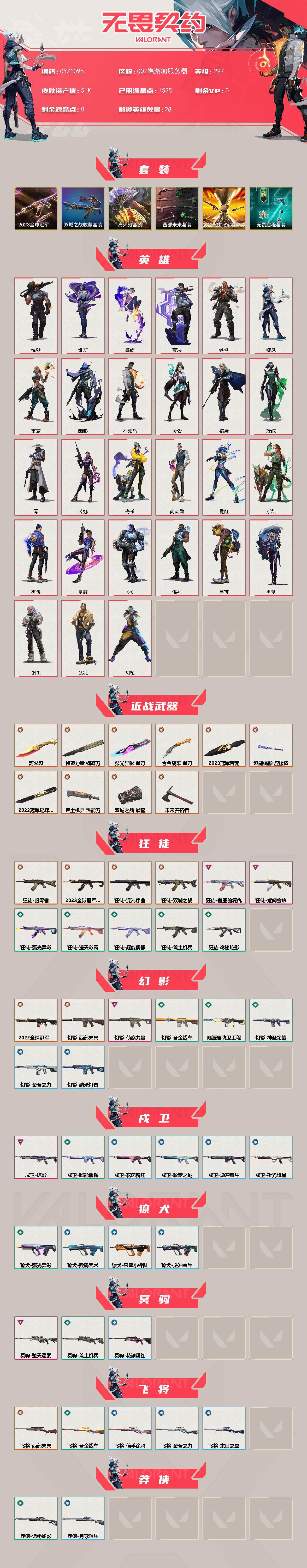 【QYZ1096】终极*21/传奇*2/卓越*7/皮肤*106/等级*297/段位:铂金/离火刃套装/2023全球冠军赛套装/2022全球冠军赛套装/西部未来套装/《双城之战》收藏套装/无畏启程套装/幻棱/炼狱/维斯/暮蝶/钛狐/壹决/铁臂/捷风/雷兹/幽影/不死鸟/贤者/猎枭/蝰蛇/零/芮娜/奇乐/尚勃勒/霓虹/斯凯/夜露/星礈/K/O/海神/盖可/黑梦/钢锁/近战武器-2023全球冠军赛 苦无/近战武器-2022全球冠军赛 蝴蝶刀/近战武器-侦察力量 蝴蝶刀/近战武器-离火刃/近战武器-双城