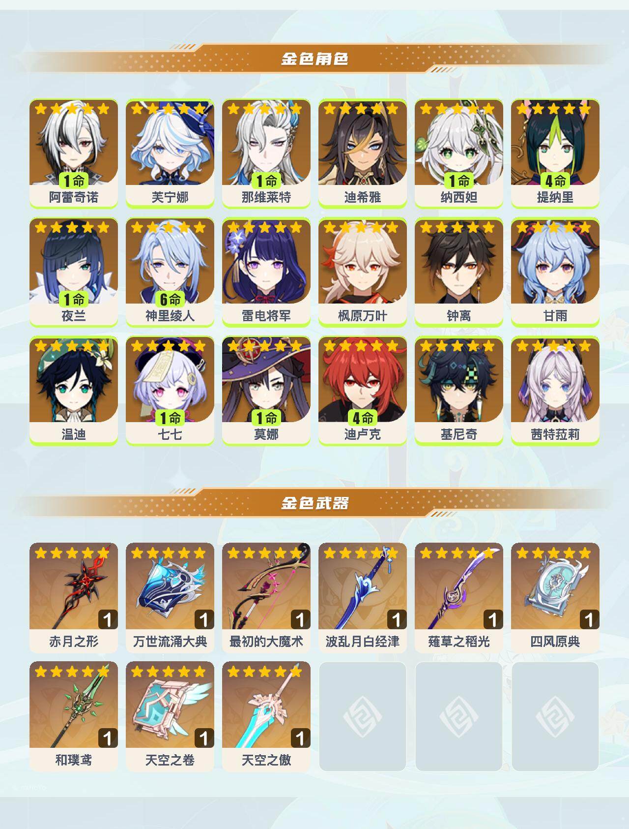 【YSYT716】59级/49黄/女主/18个五星角色/11个五星武器/满命神里绫人/芙宁娜/枫原万叶/钟离/温迪/甘雨/雷电将军/基尼奇/1命纳西妲/1命那维莱特/1命夜兰/1命阿蕾奇诺/4命迪卢克/茜特菈莉/1命莫娜/4命提纳里/迪希雅/1命七七/最初的大魔术/万世流涌大典/赤月之形/薙草之稻光/和璞鸢/波乱月白经津/四风原典/天空之傲/天空之卷
