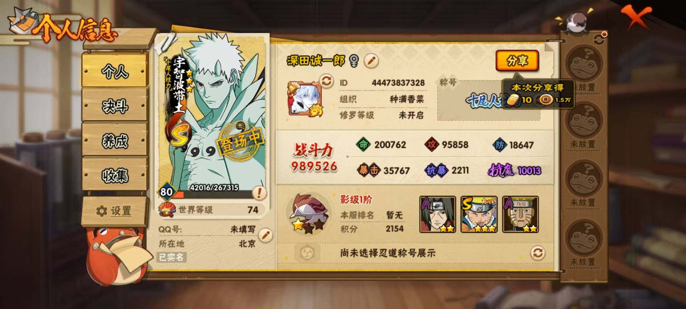 V4/战力100W/S忍2/A忍8/忍界大战-秋道丁次/2星巳月「仙人模式」