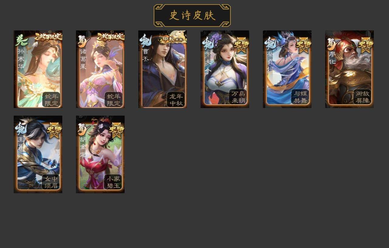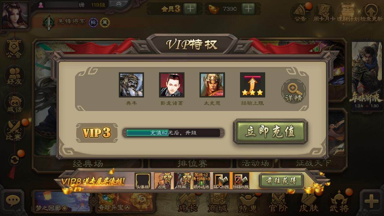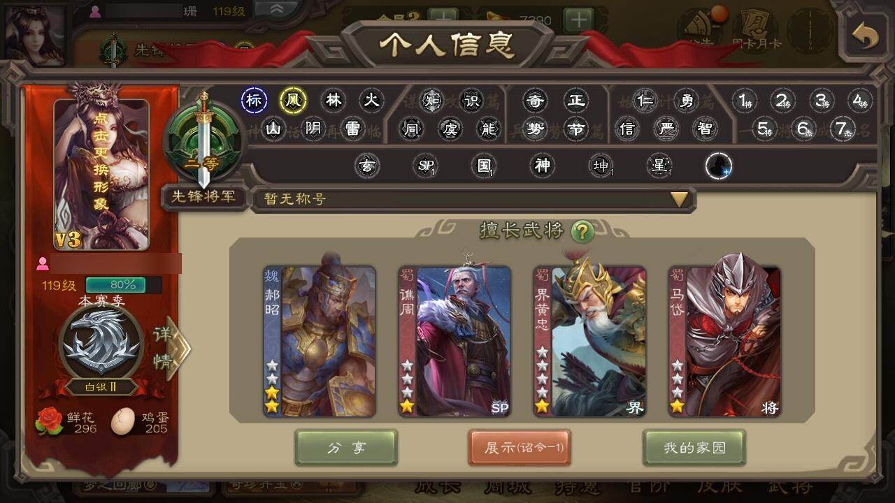 官阶:先锋将军;VIP等级:VIP3;史诗武将数量:3;动态皮肤数量:2;武将