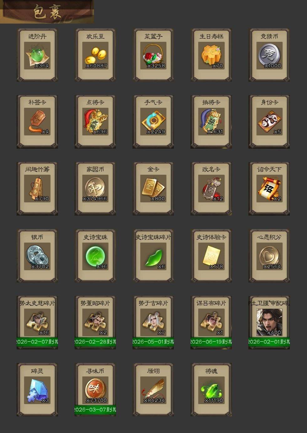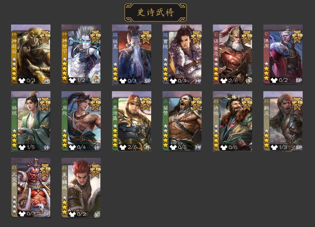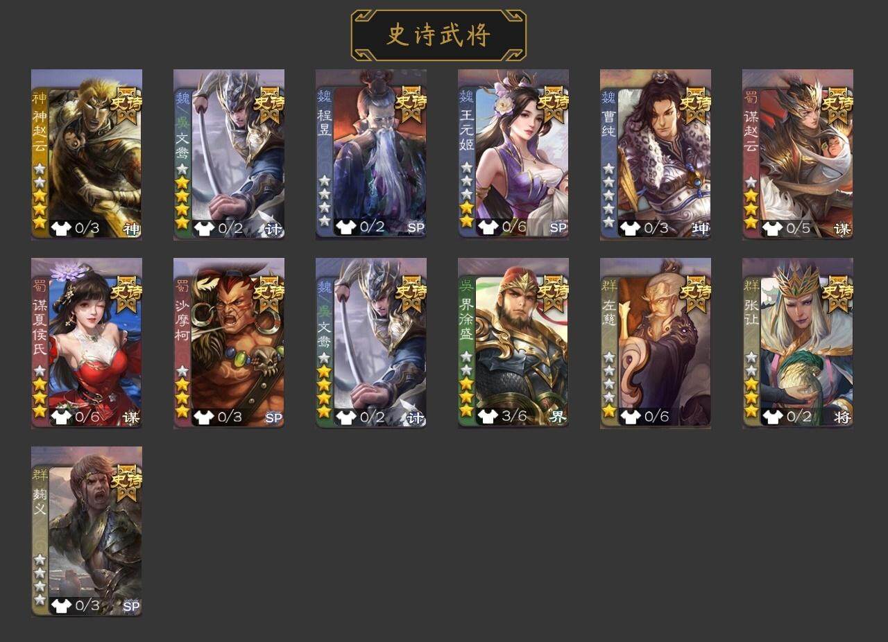 官阶:先锋将军;VIP等级:VIP3;史诗武将数量:3;动态皮肤数量:2;武将总数:154;史诗宝珠数量:96;将魂数量:11190;神将:0;魏国史诗武将:2;蜀国史诗武将:2;吴国史诗武将:0;群史诗武将:0