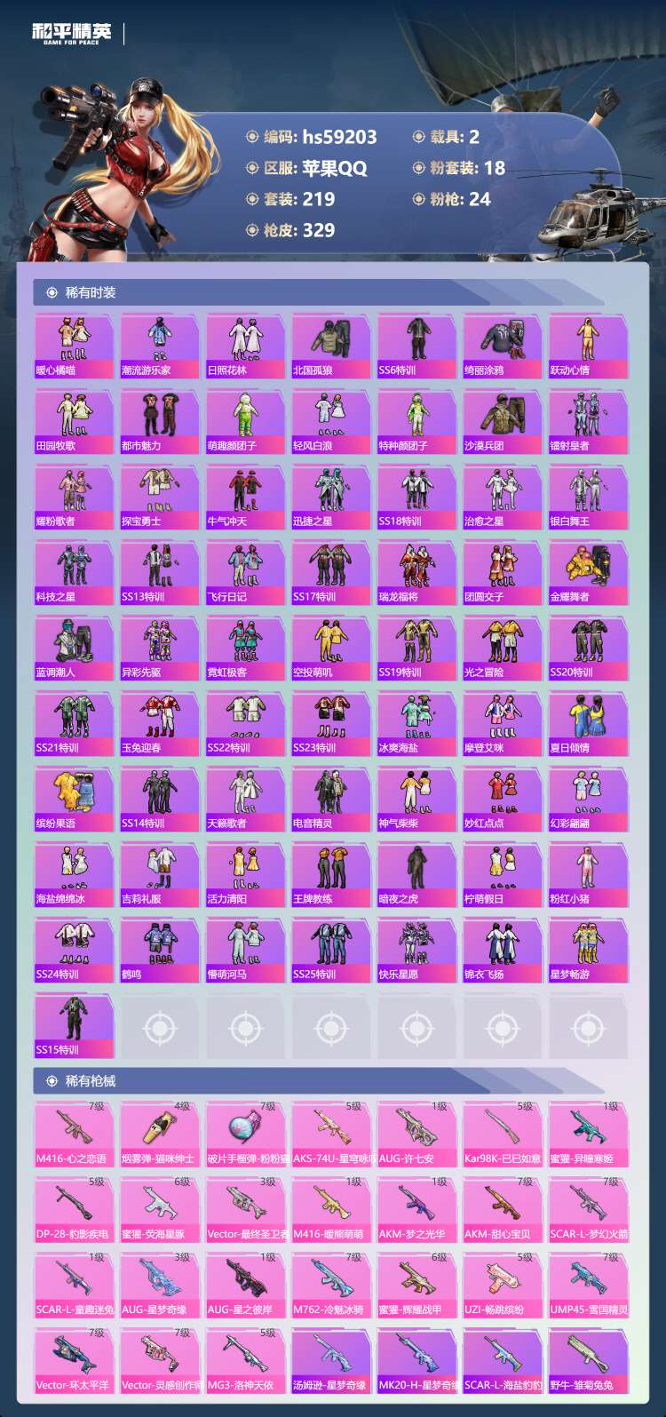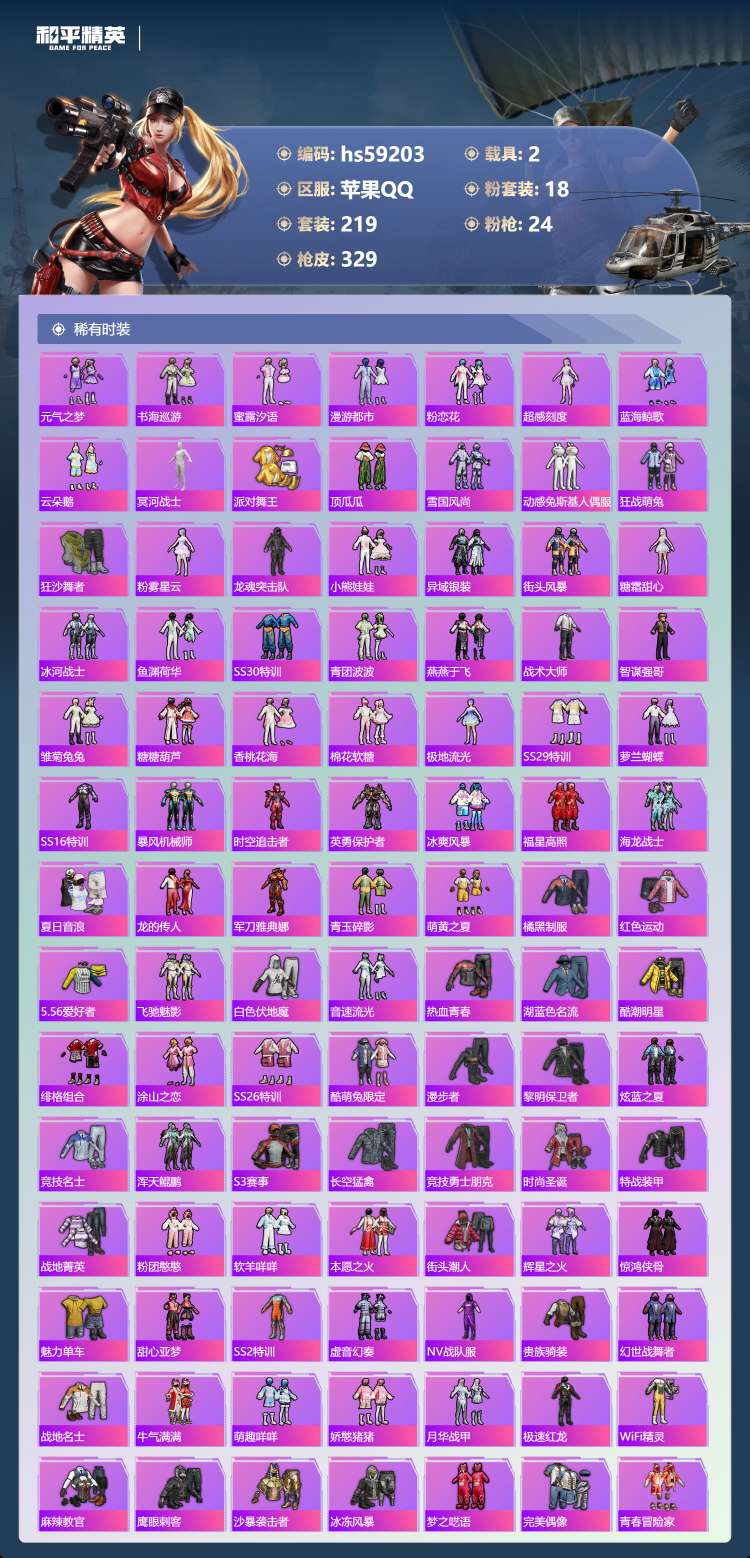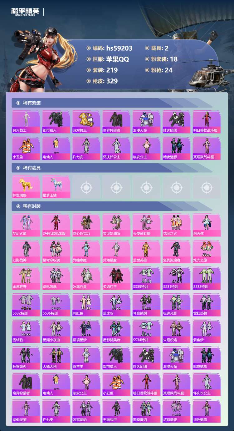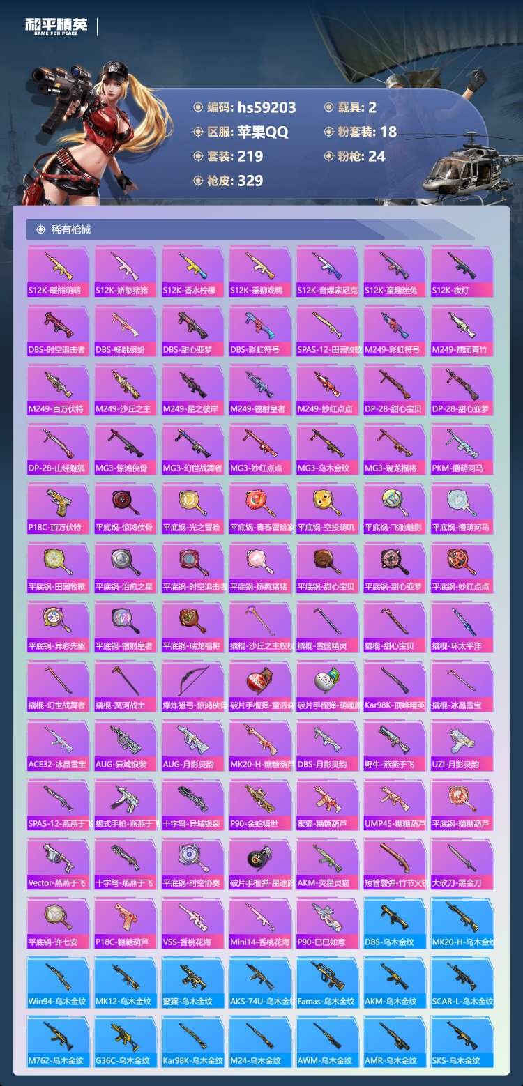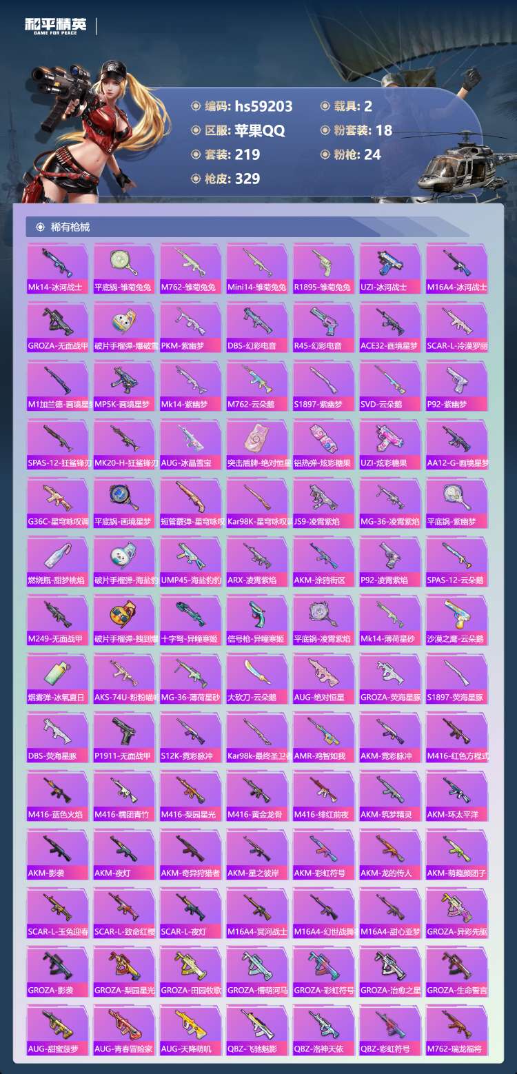 hs59203 苹果手Q-24王牌印记-有战神框-18粉装-24特效枪-2载具-122171热力值-