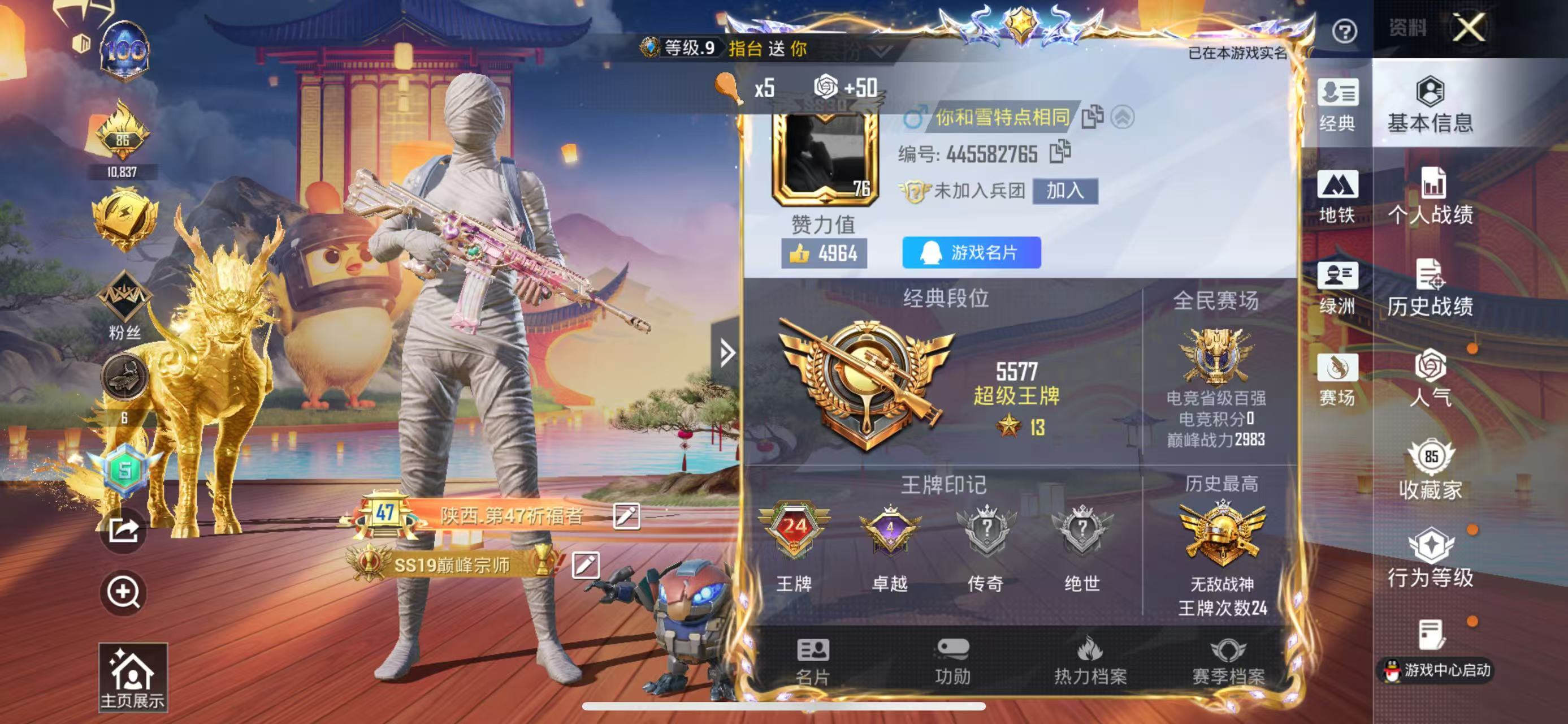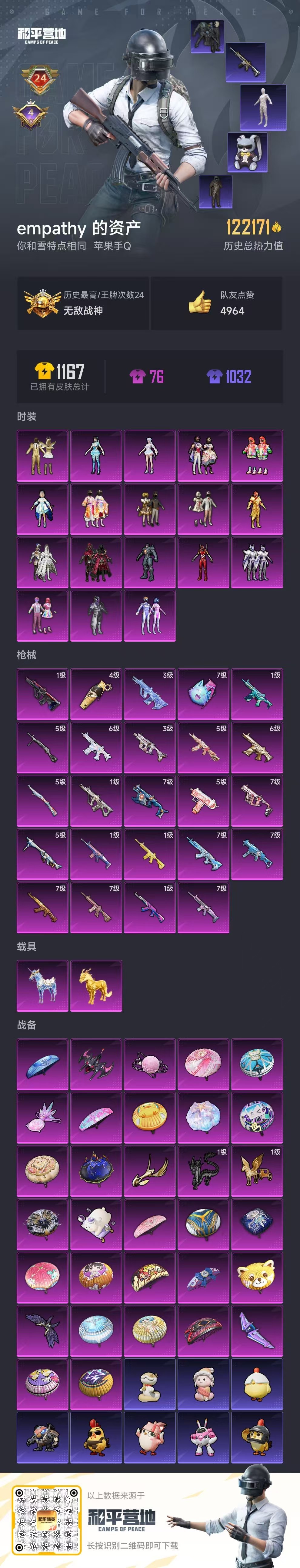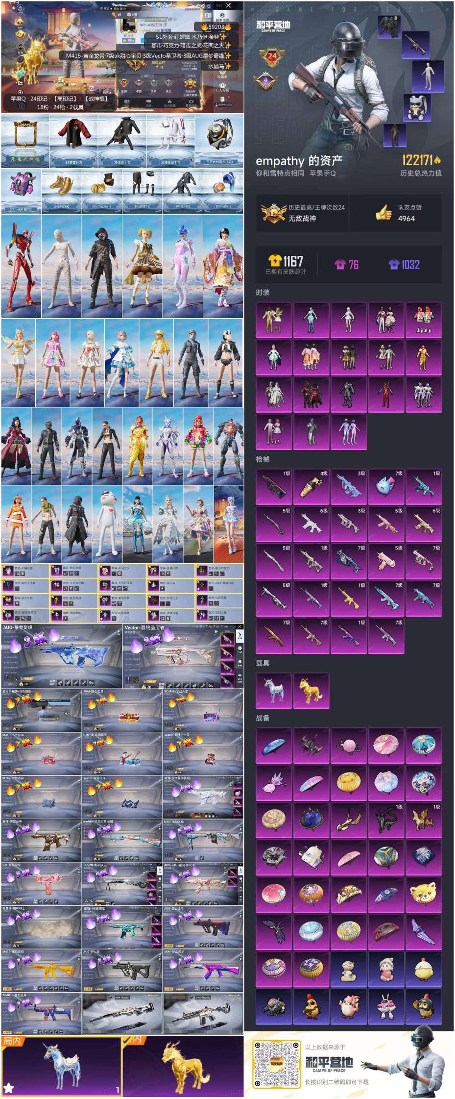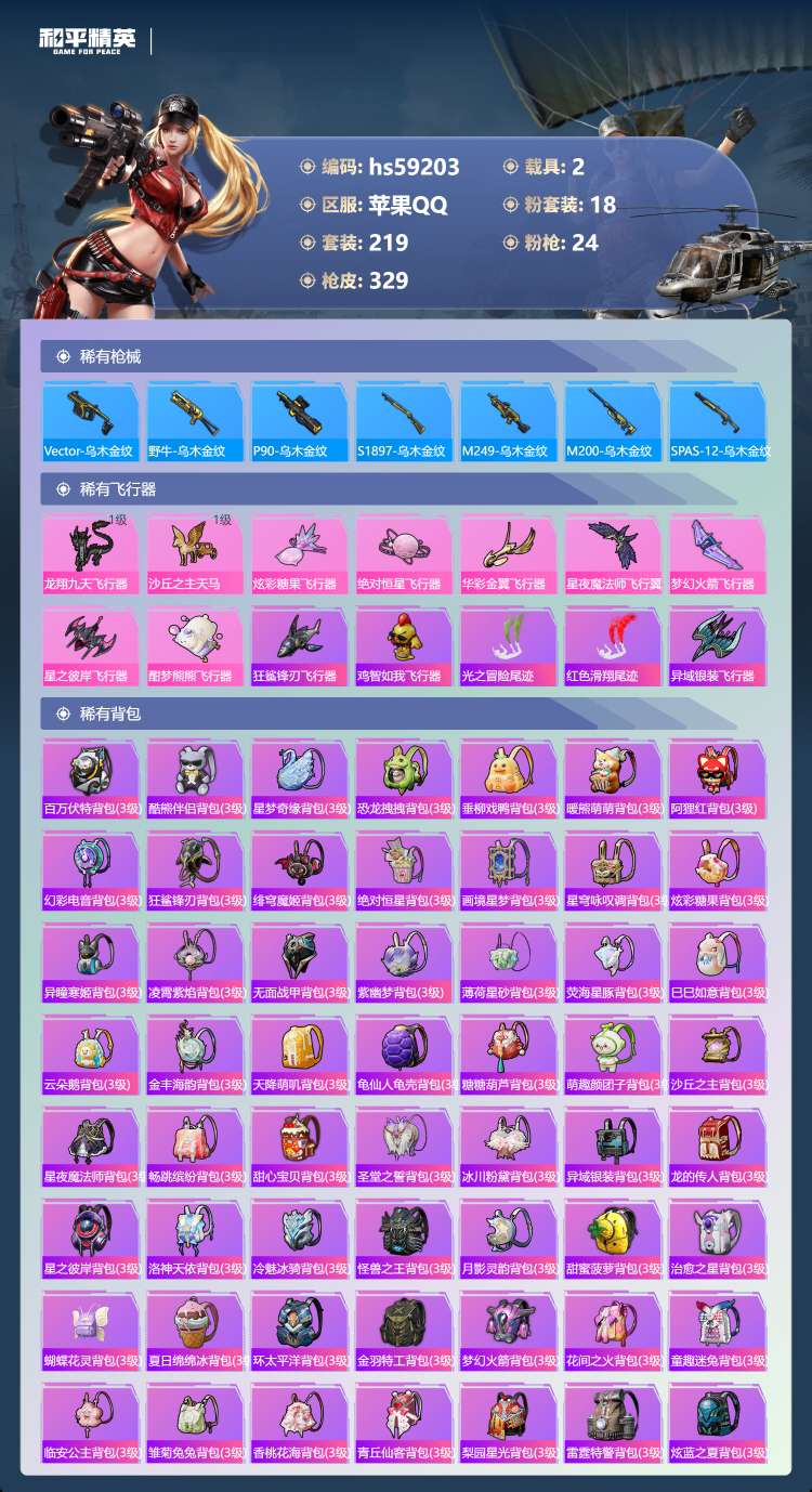 hs59203 苹果手Q-24王牌印记-有战神框-18粉装-24特效枪-2载具-122171热力值-