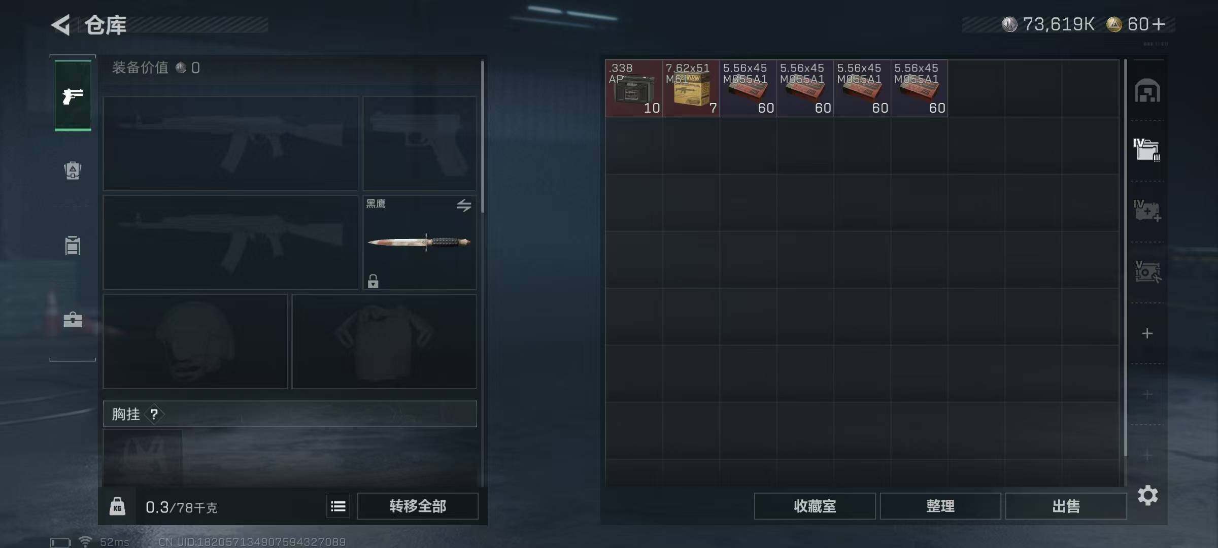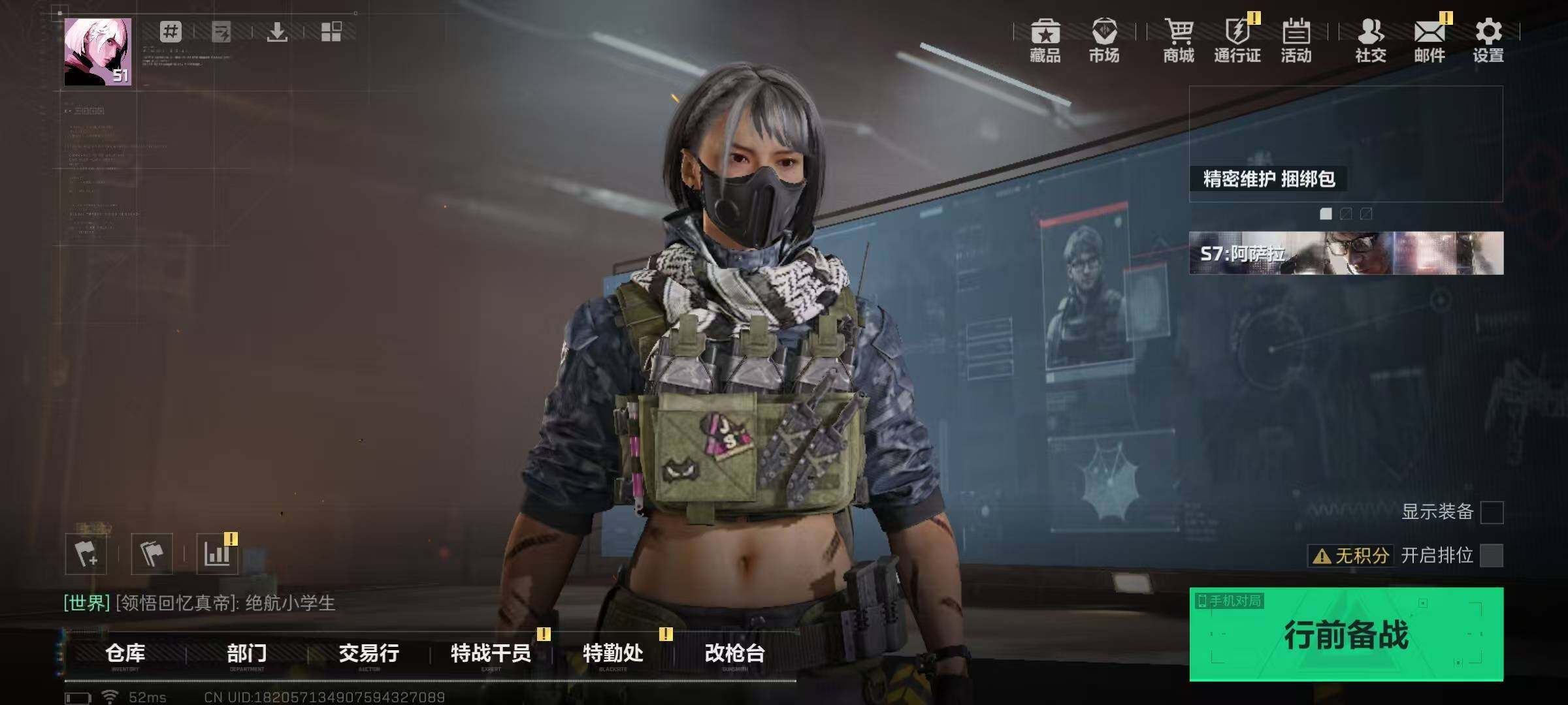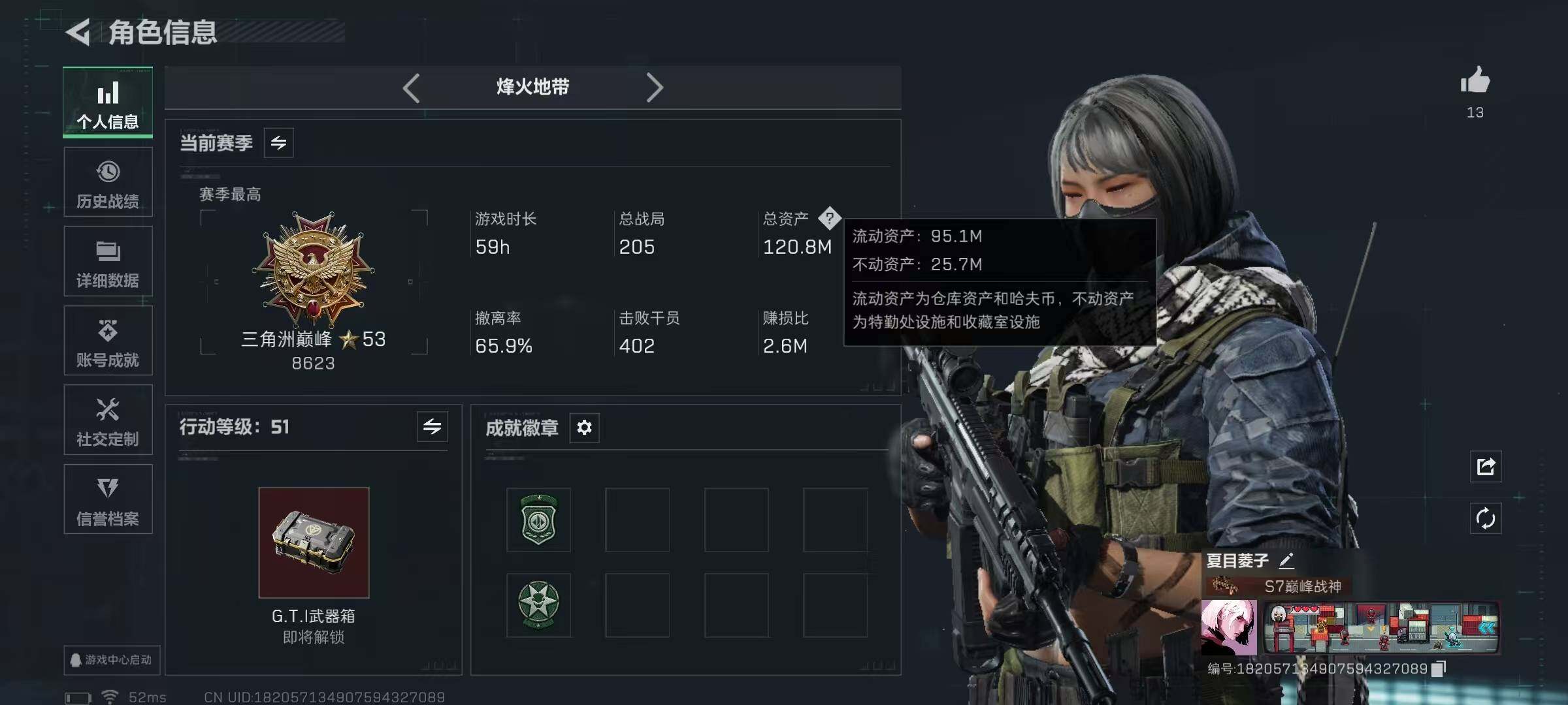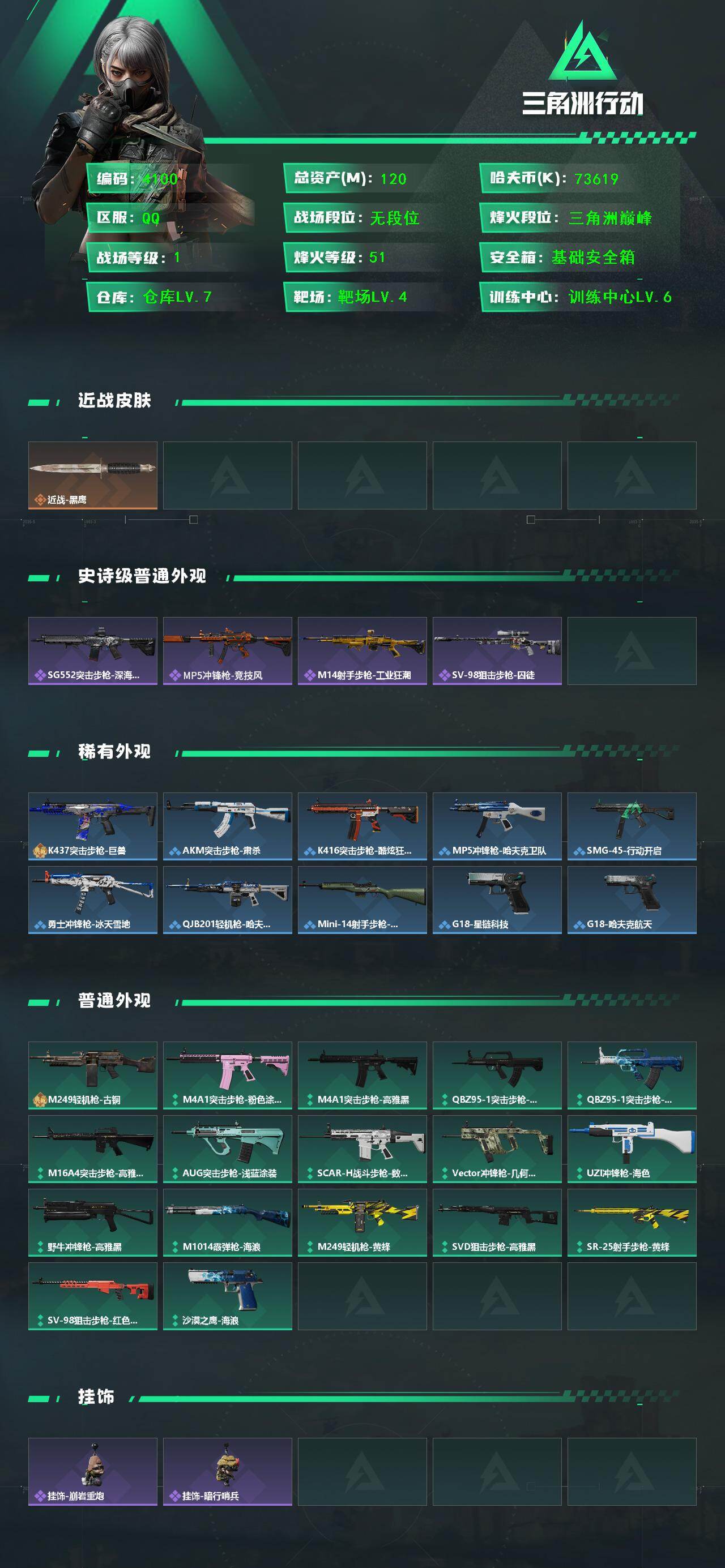 120m总资产-73619k哈伏币-51烽火等级-三角洲巅峰-1战场等级-无军衔