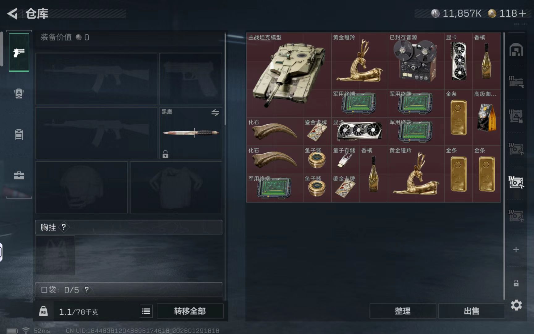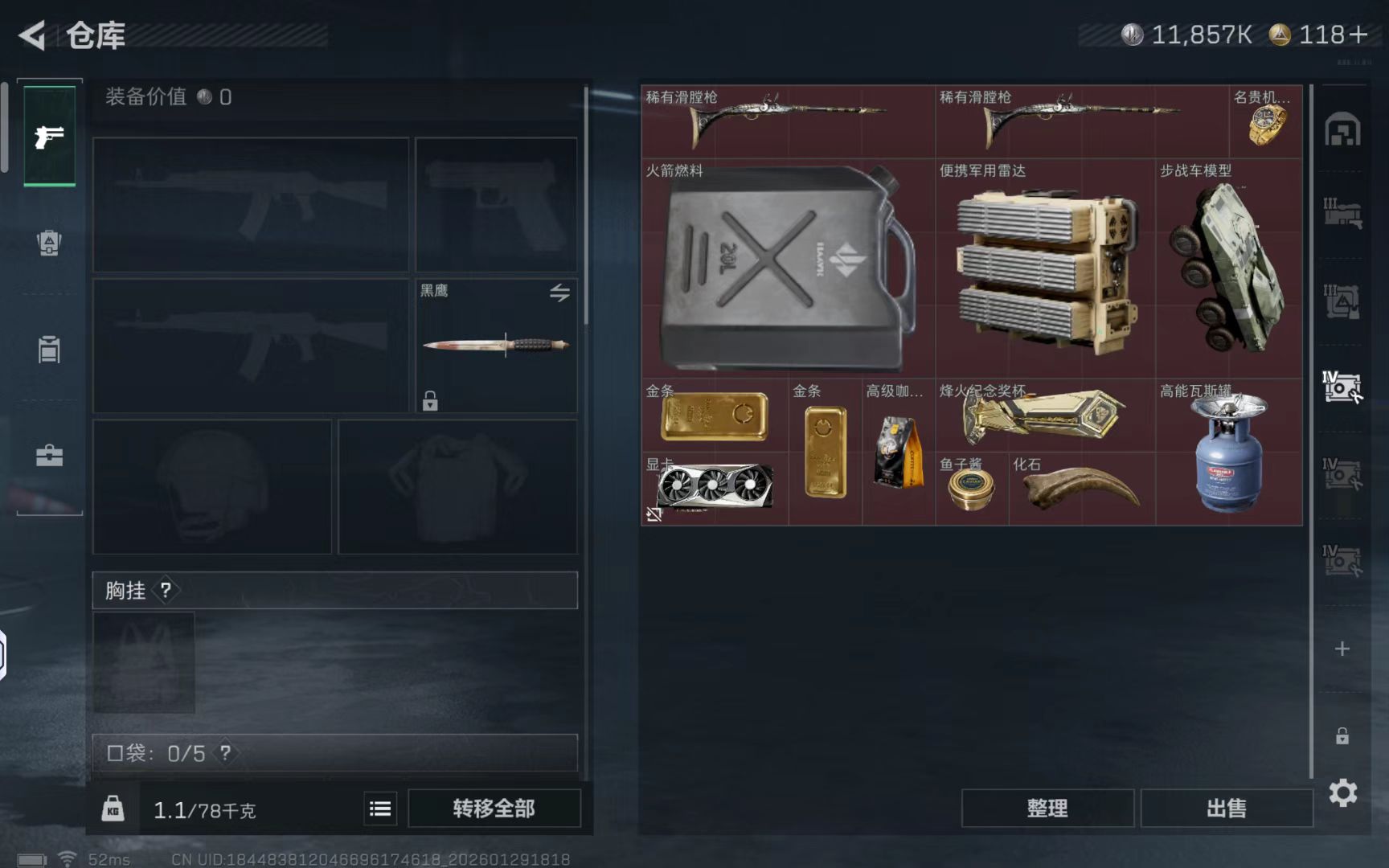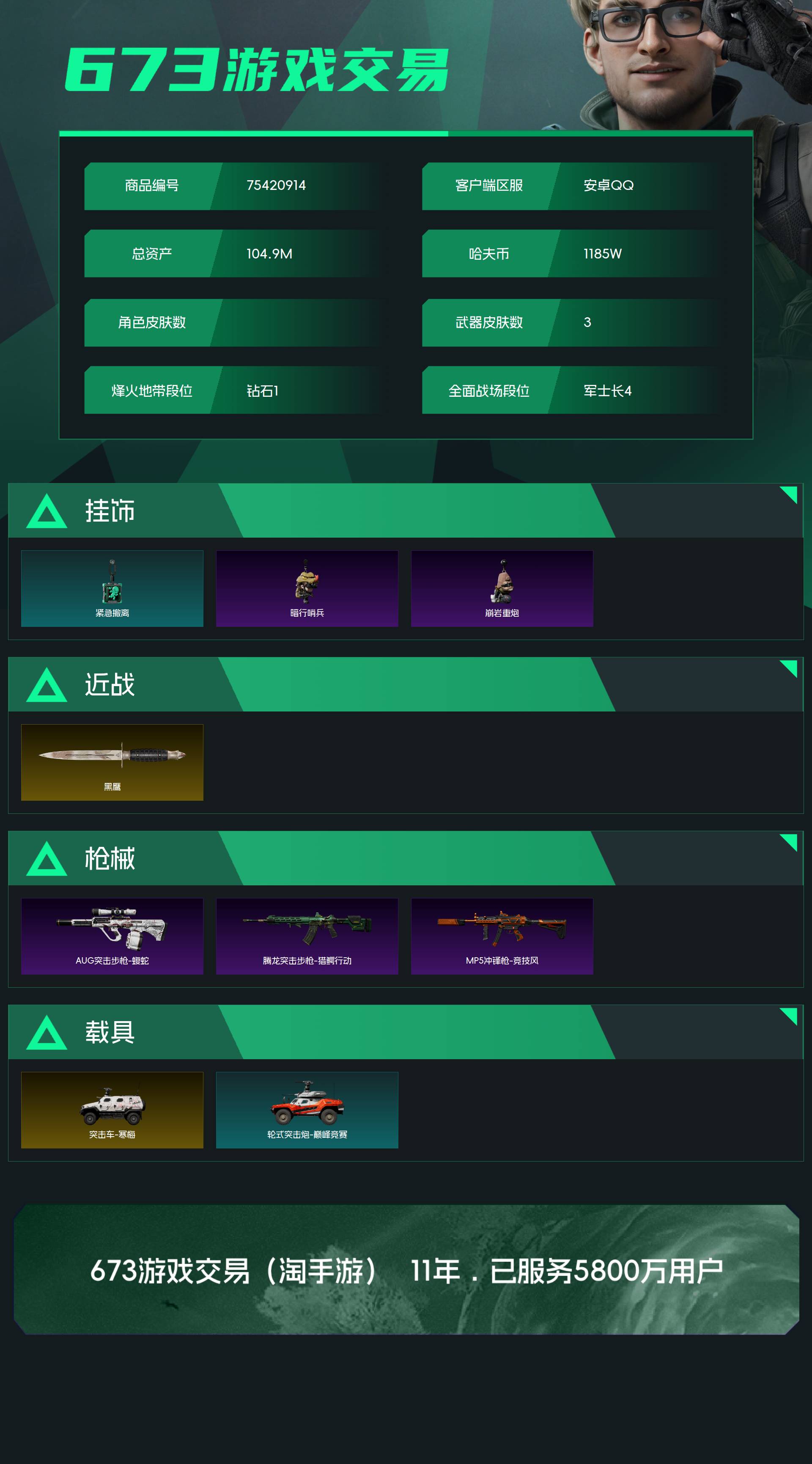 烽火段位钻石1 战场段位军士长4 总资产104.9M 哈夫币1185W 挂饰3 近战1 枪械3 载具
