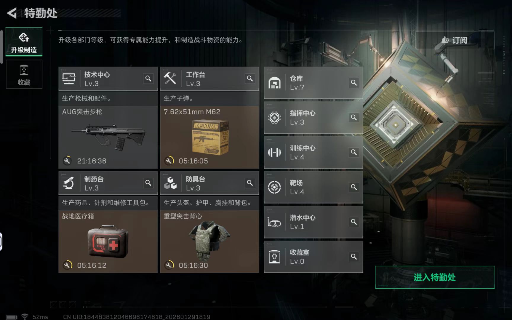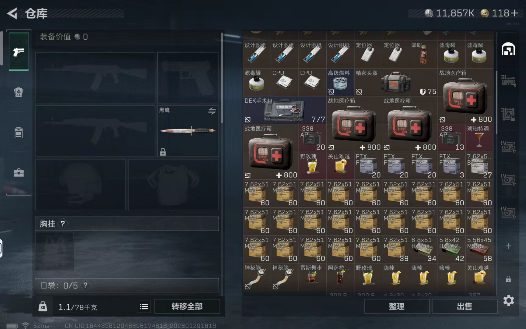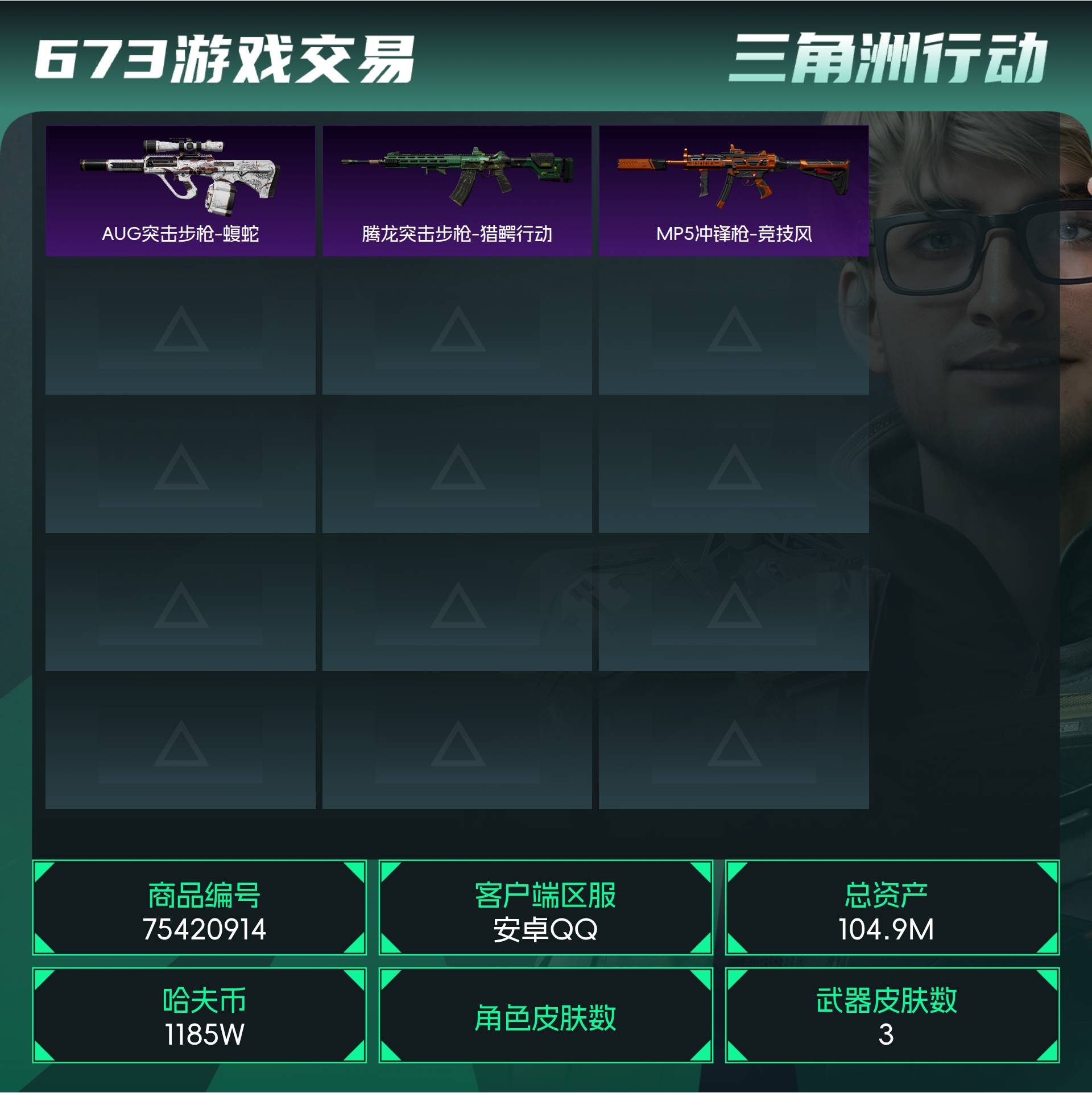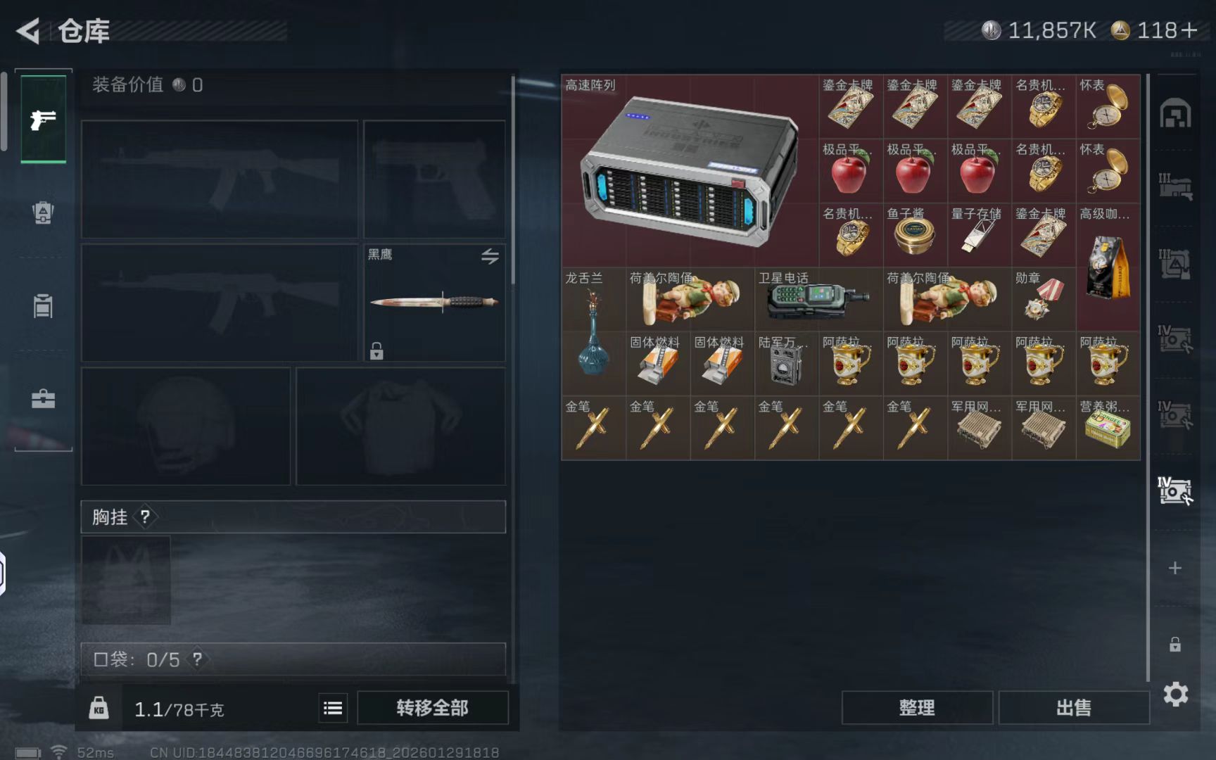 烽火段位钻石1 战场段位军士长4 总资产104.9M 哈夫币1185W 挂饰3 近战1 枪械3 载具