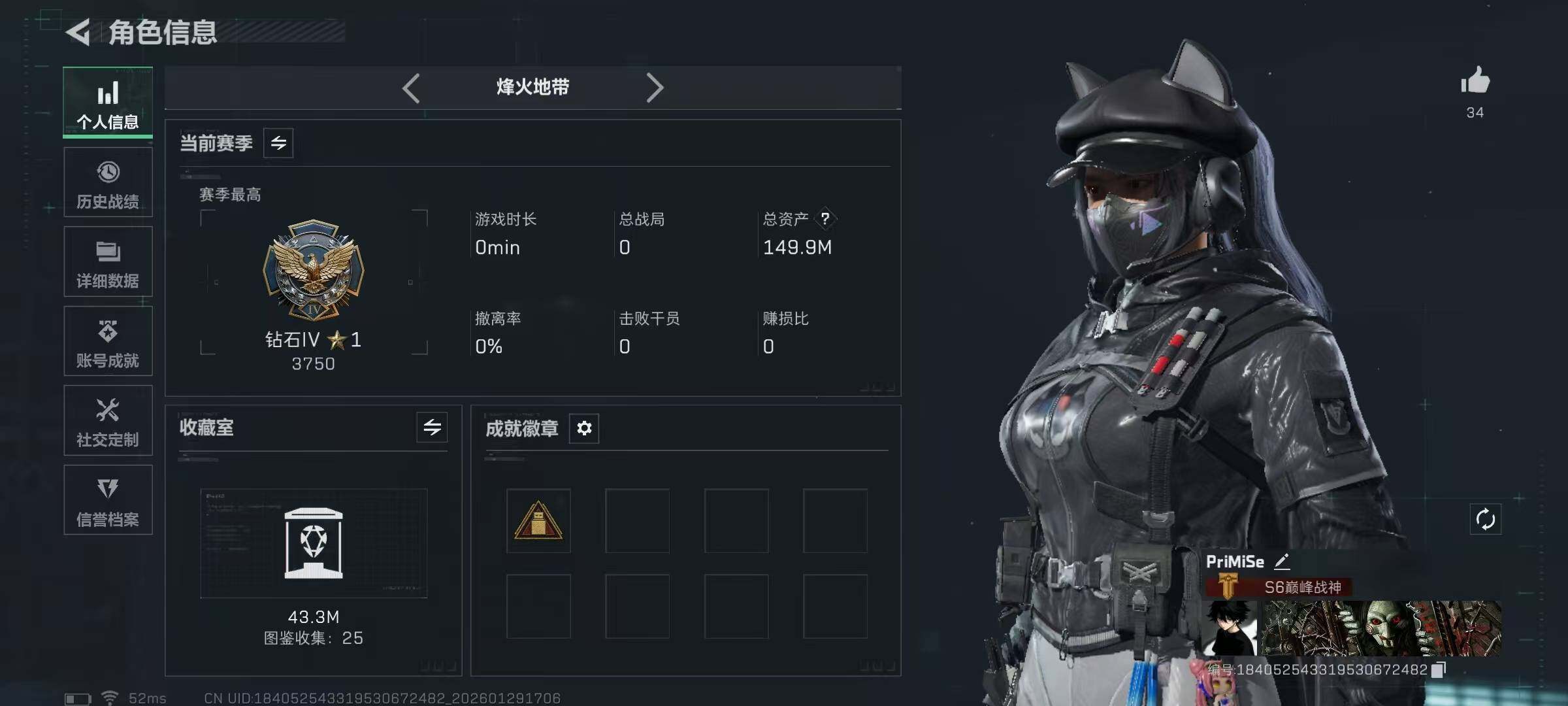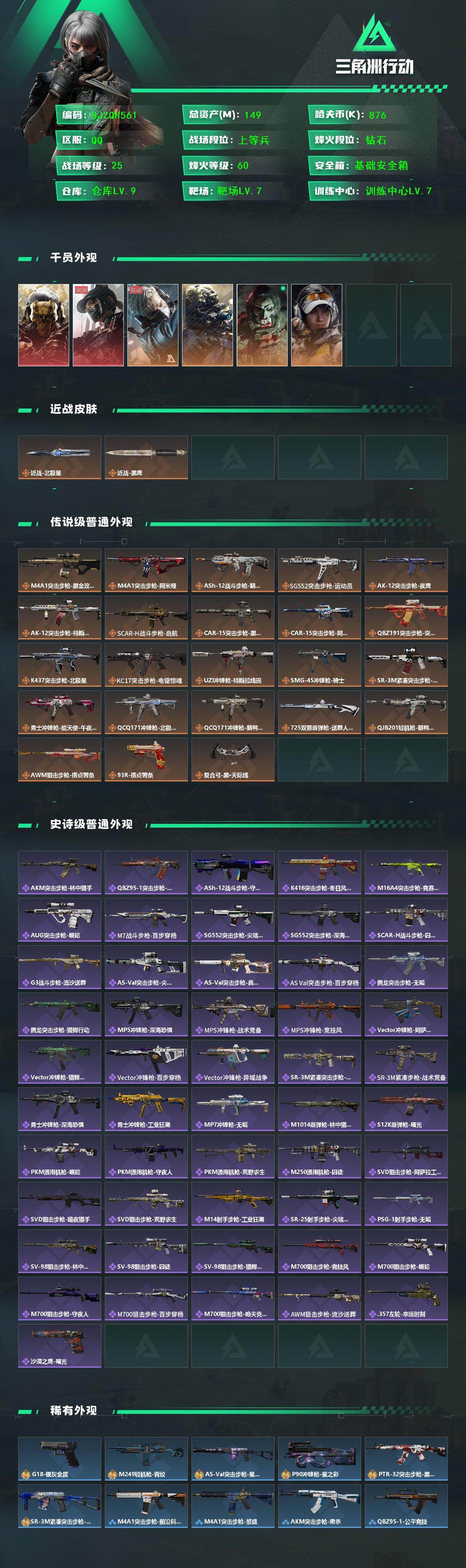 【SJZQH561】总资产(M):149M/哈夫币(K):876K/哈夫币(K):876K/传说枪皮数:23/全面战场等级:25_段位:上等兵/烽火地带等级:60_段位:钻石/红狼-蚀金玫瑰/露娜-黑·天际线/蜂医-送葬人·无题密令/无名-夜鹰/红狼-电锯惊魂/露娜-金牌射手/近战-北极星/近战-黑鹰/M4A1突击步枪-蚀金玫瑰/M4A1突击步枪-阿米娅/ASh-12战斗步枪-鹅鸭杀/SG552突击步枪-运动员/AK-12突击步枪-夜鹰/AK-12突击步枪-特斯拉线圈/SCAR-H战斗步枪-启航